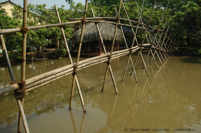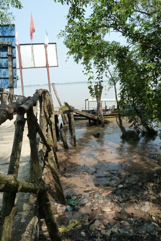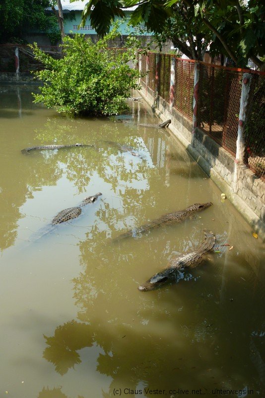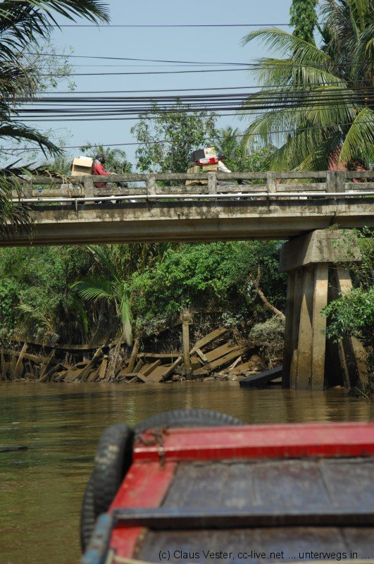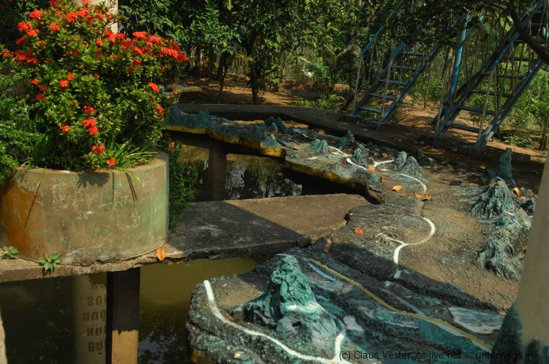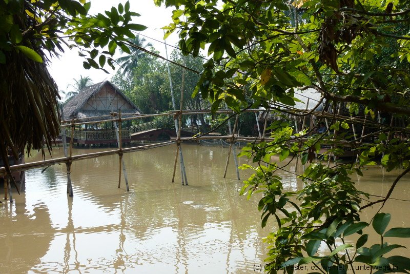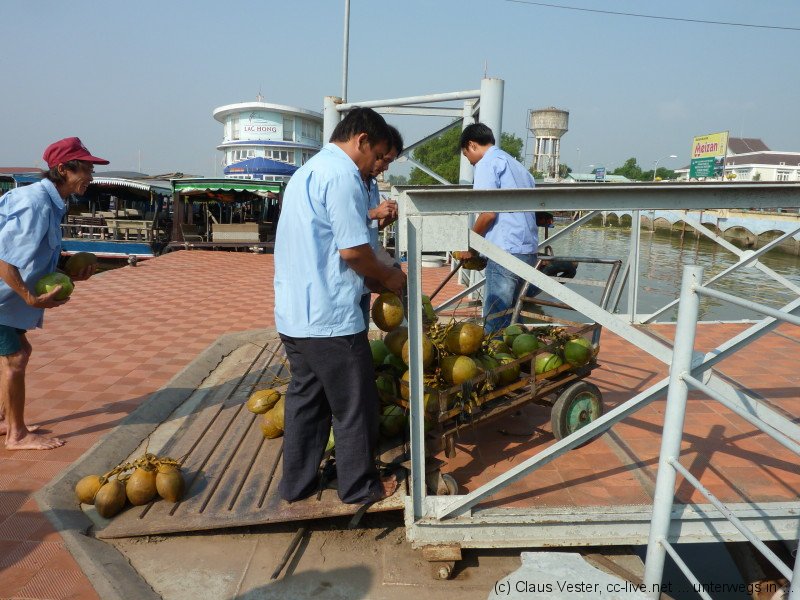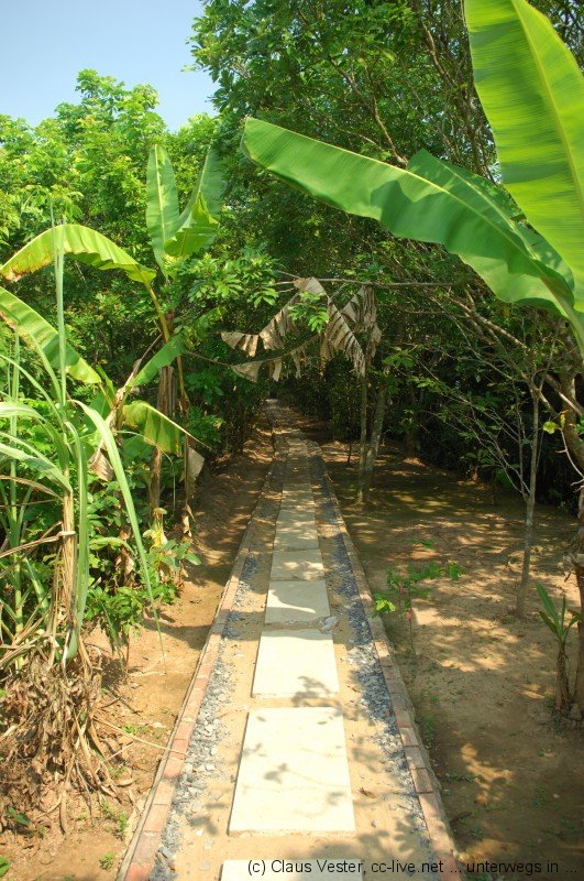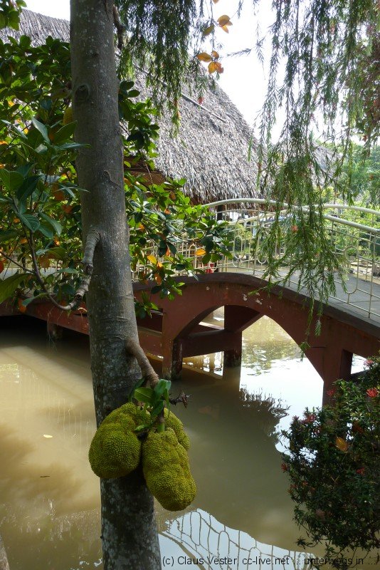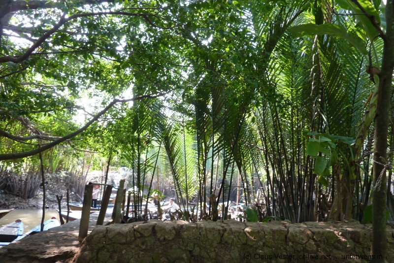 Nachdem wir auf ein kleineres Boot umgestiegen sind, fahren wir durch einen schmalen, Palmen gesäumten Kanal, bis wir wieder den Mekong erreichen. Hier wartet schon unserer größeres Boot und bringt uns zur Phönix-Insel (Con Phung). Bereits von der Anlegestelle aus sind die Reste eines skurrilen Klosters zu sehen. Sie erinnern eher an ein verrostetes Disneyland mit Cao-Dai-Einflüssen als an einen spirituellen Ort. In der Anlage lebte bis 1990 Ong Dao Dua, der Kokosnuss-Mönch. Er gründete eine Religion mit dem Namen Tinh Do Cu Si, die Elemente des Buddhismus, Taoismus und Christentum miteinander vermischte.