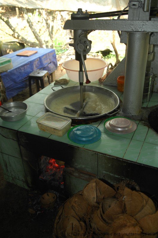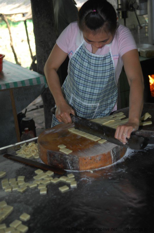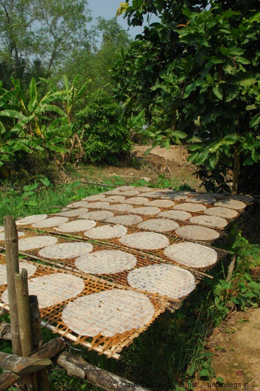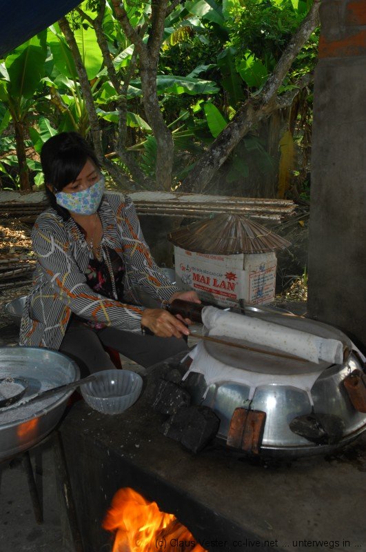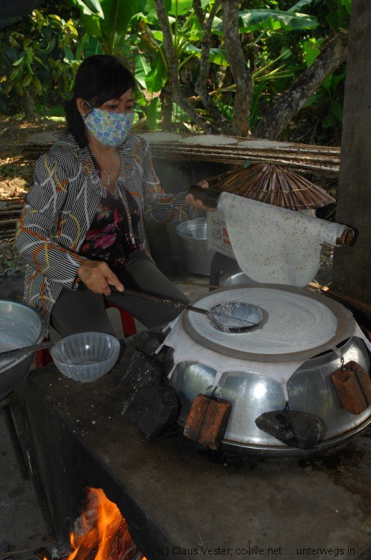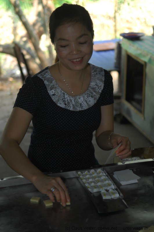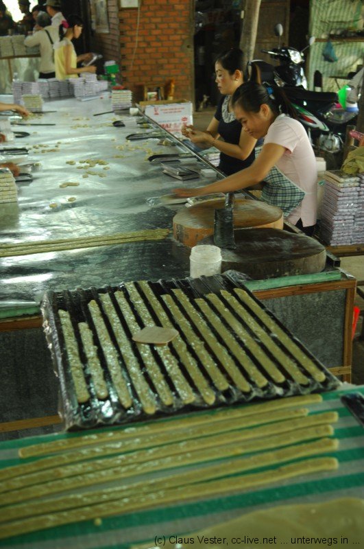 Nächste Anlegestation ist die Ben Tri Provinz, wo wir die Kokosnuss-Bonbon-Fabrik Que Dua besuchen. Die klebrigen Süßigkeiten sind in mehreren leckeren Geschmacksrichtungen erhältlich. Als wir die Bonbon-Küche besuchen, werden gerade welche mit Duriam-Aroma produziert. Hinter der Produktionshütte wird noch ein weiteres traditionelles Handwerk ausgeübt. Selbstverständlich wird das hier gefertigte Reispapier mit Kokosmilch statt Wasser hergestellt.