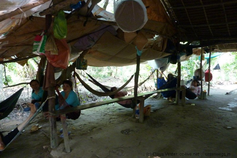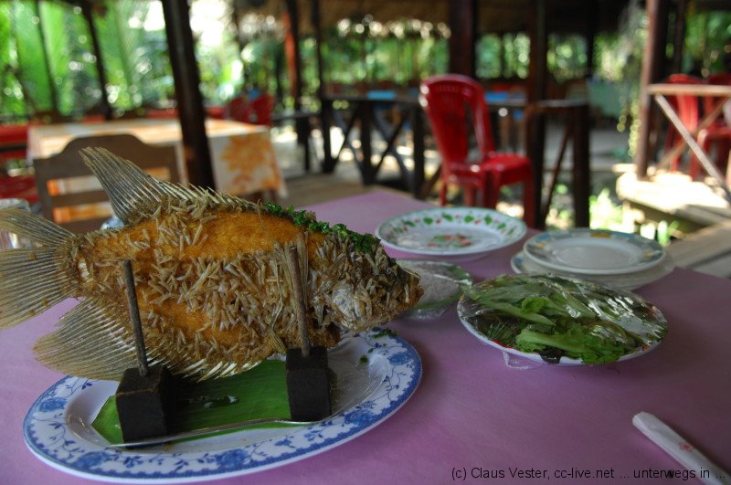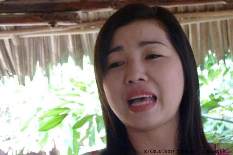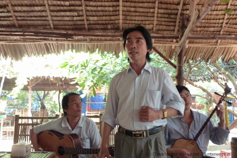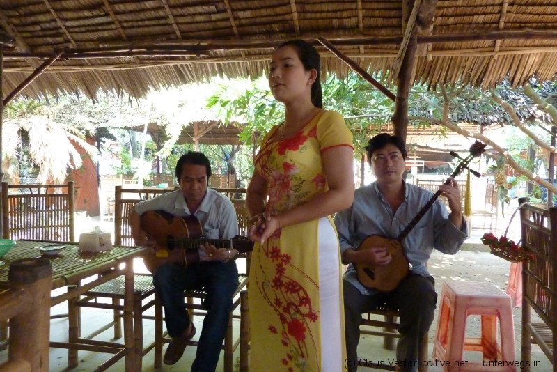 Auch auf der Nachbarinsel Con Quiz ist man auf Besucher bestens vorbereitet. Ein Restaurant auf der Schildkröten-Insel erwartet uns mit Kostproben von Ananas, Papaya und anderen exotischen Früchten. Nach kurzer Zeit gesellen sich zwei Musiker und fünf Sänger hinzu und spielen einige kurze Stücke der traditionellen Musik des Deltas.