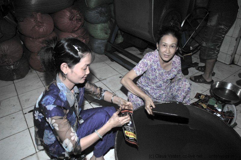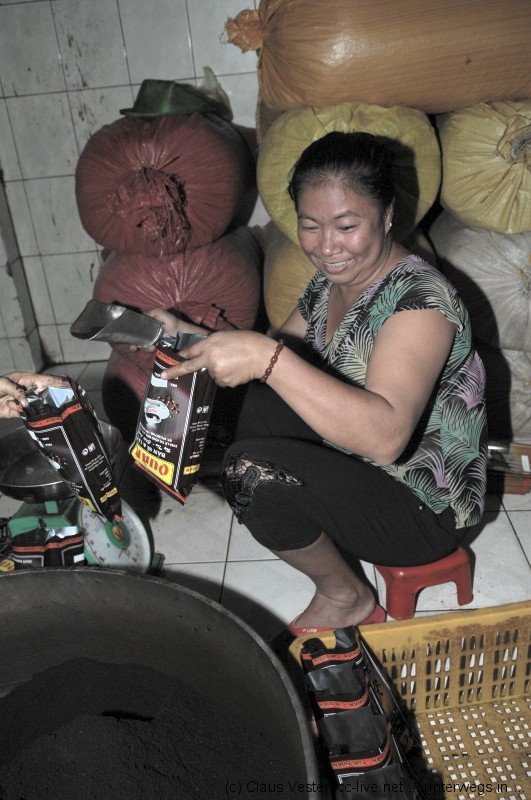 Nach einem üppigen Mittagessen mit lokalen Spezialitäten fahren wir nach My Tho zurück. Morgens hatte uns der Geruch frisch gerösteten Kaffees geweckt. Auf die Frage nach der Quelle erklärt uns unser Guide Khanh, unweit unseres Hotels befände sich eine kleine Rösterei.
