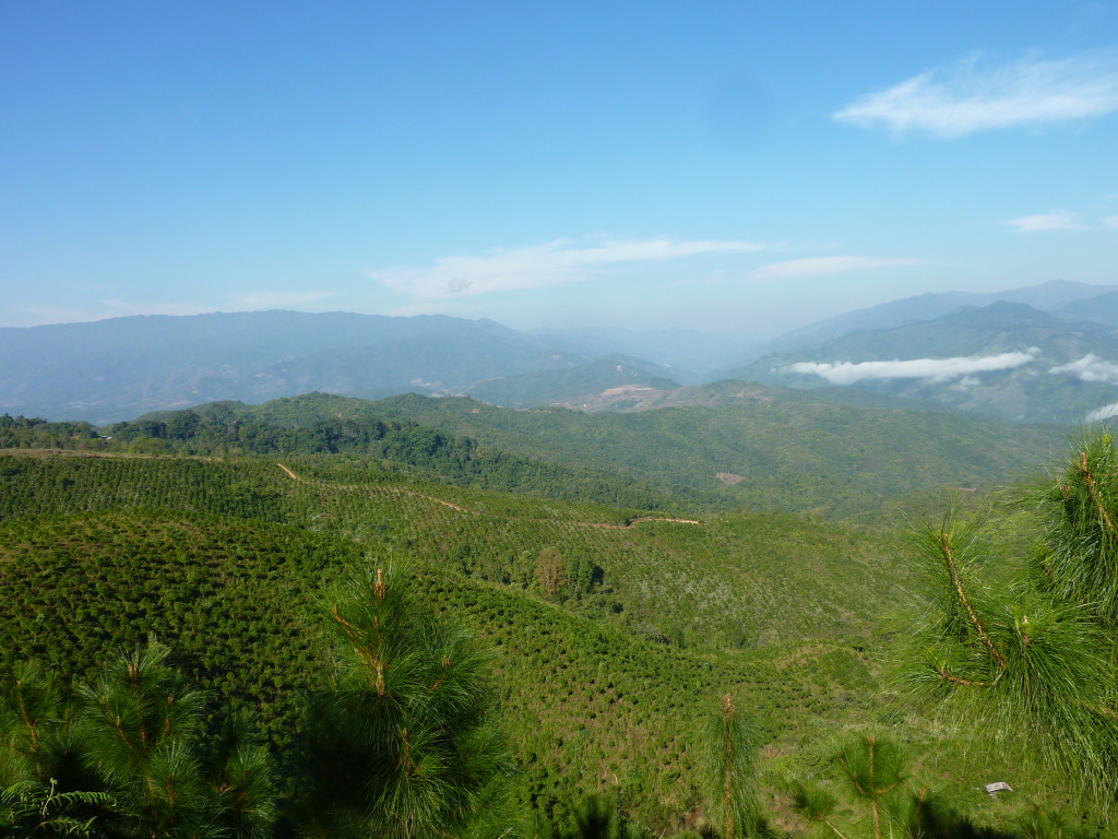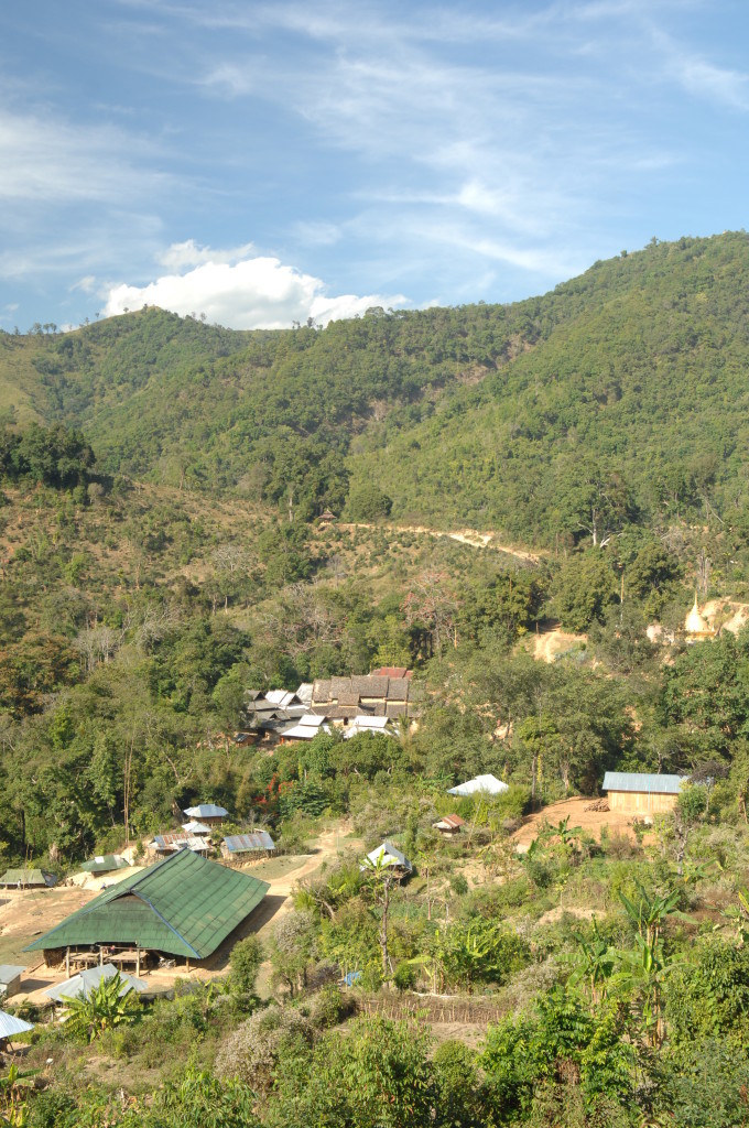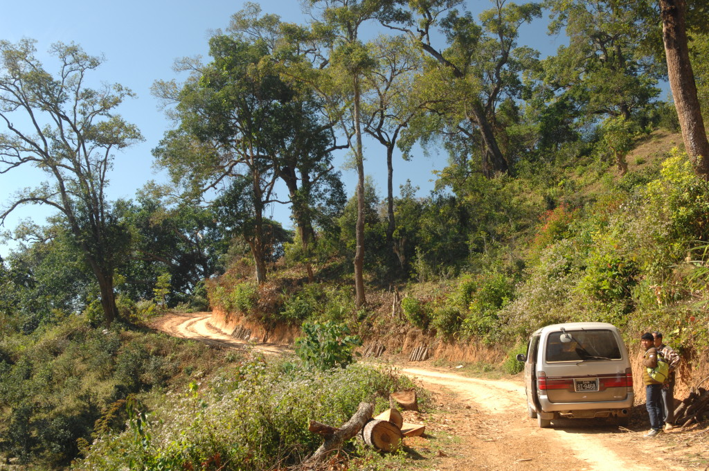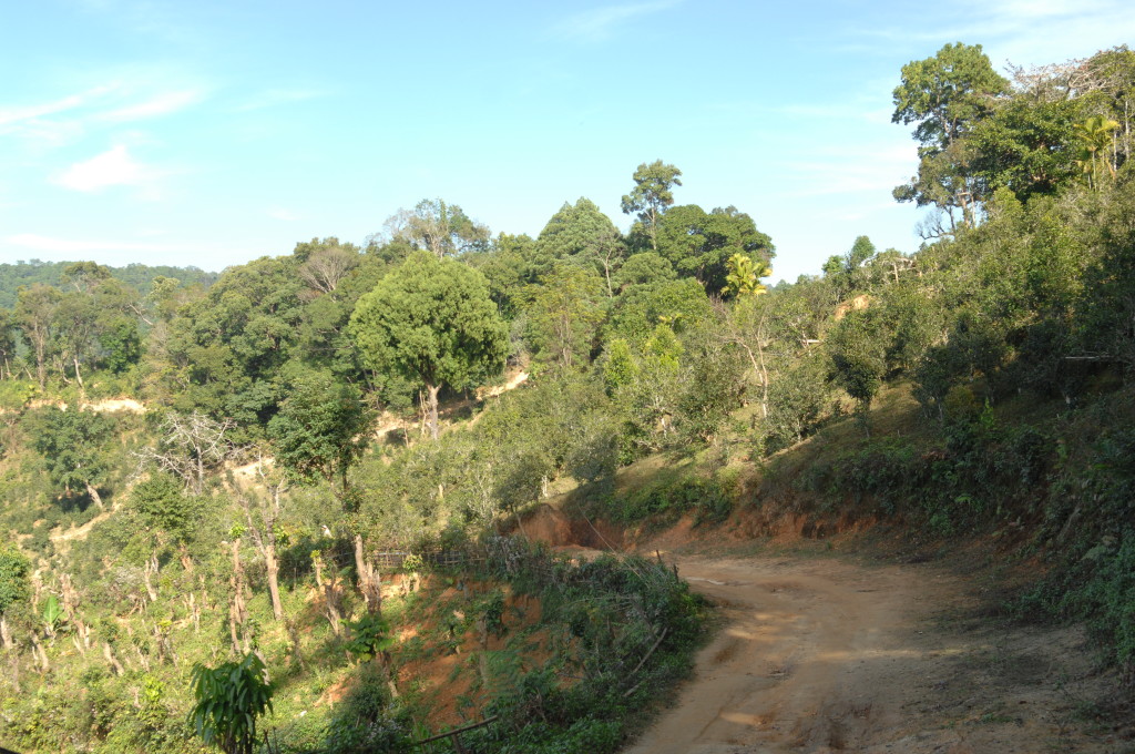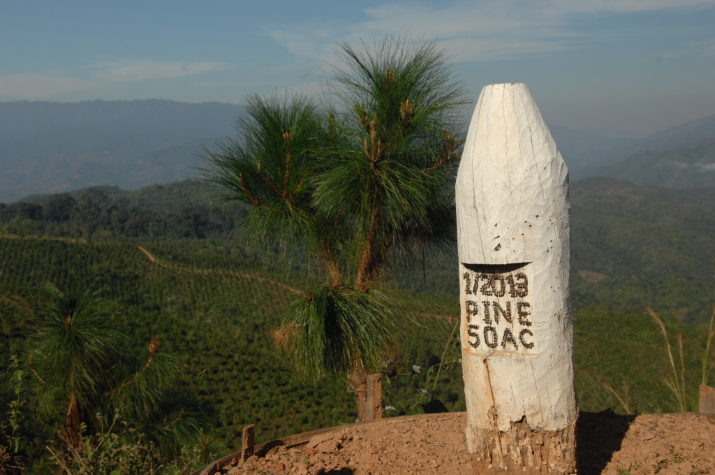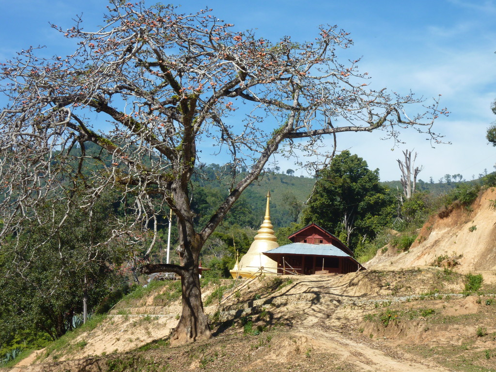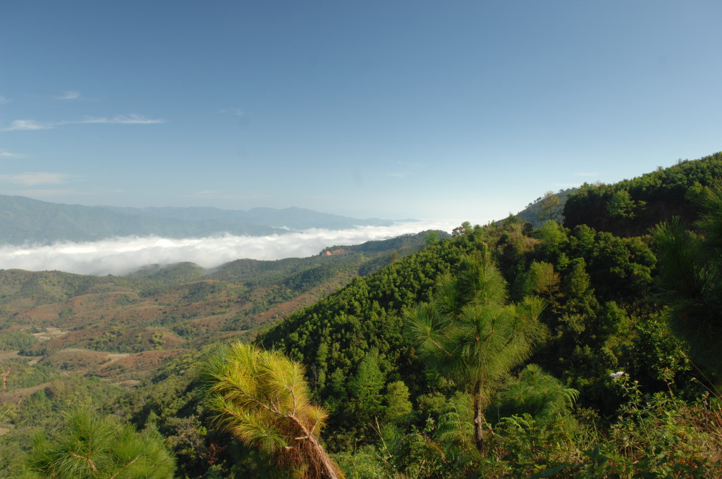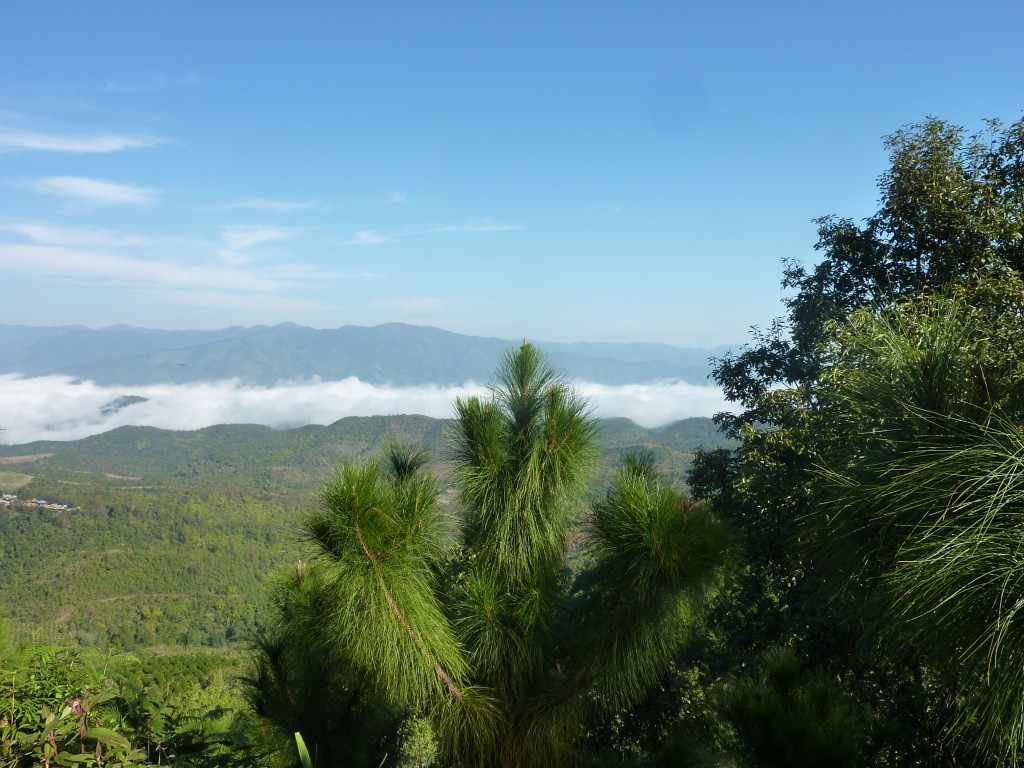 Wie bereits am Vortag löst sich der Morgennebel kurz bevor wir die Talebene hinter Kengtung verlassen. Schon bald windet sich die asphaltierte Straße in zahlreichen Serpentinen bergauf und bergab. Hier haben die Motorsägen mal wieder ganze Arbeit geleistet. Von den ursprünglichen Teak-Wäldern ist nichts mehr übrig. An einigen Stellen hat man mit der Aufforstung begonnen. Auf großen Tafeln verkündet die zuständige Regierungsstelle stolz die Pflanzung von 50 Hektar Pinien im Januar 2013. Besser spät als nie.