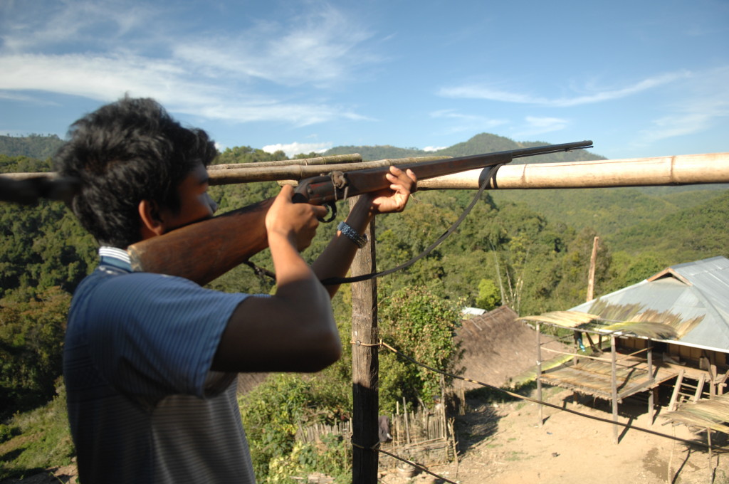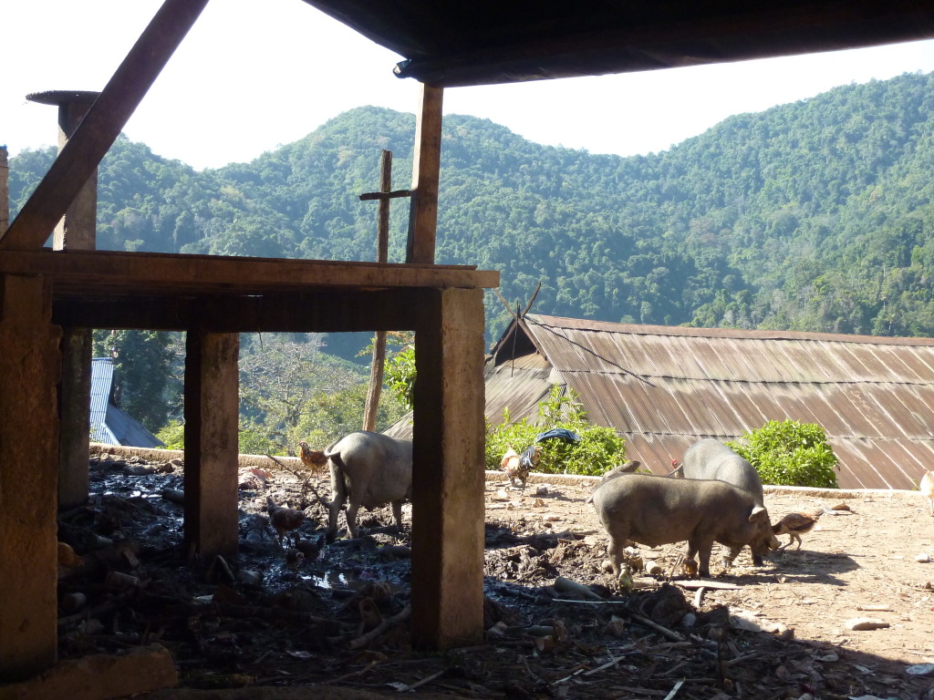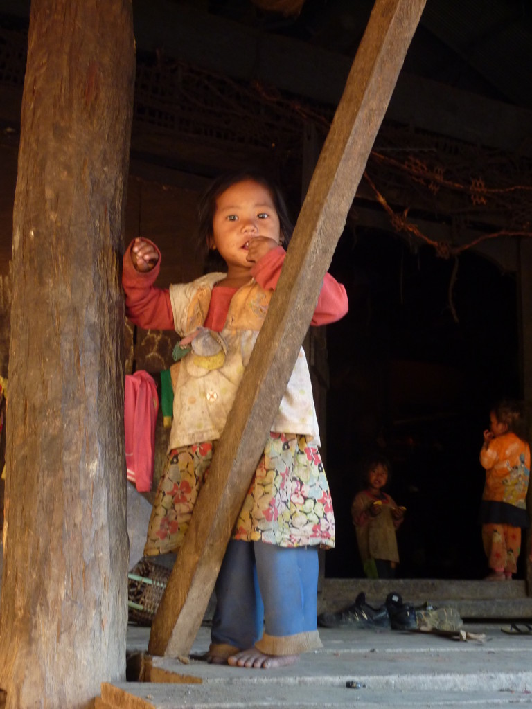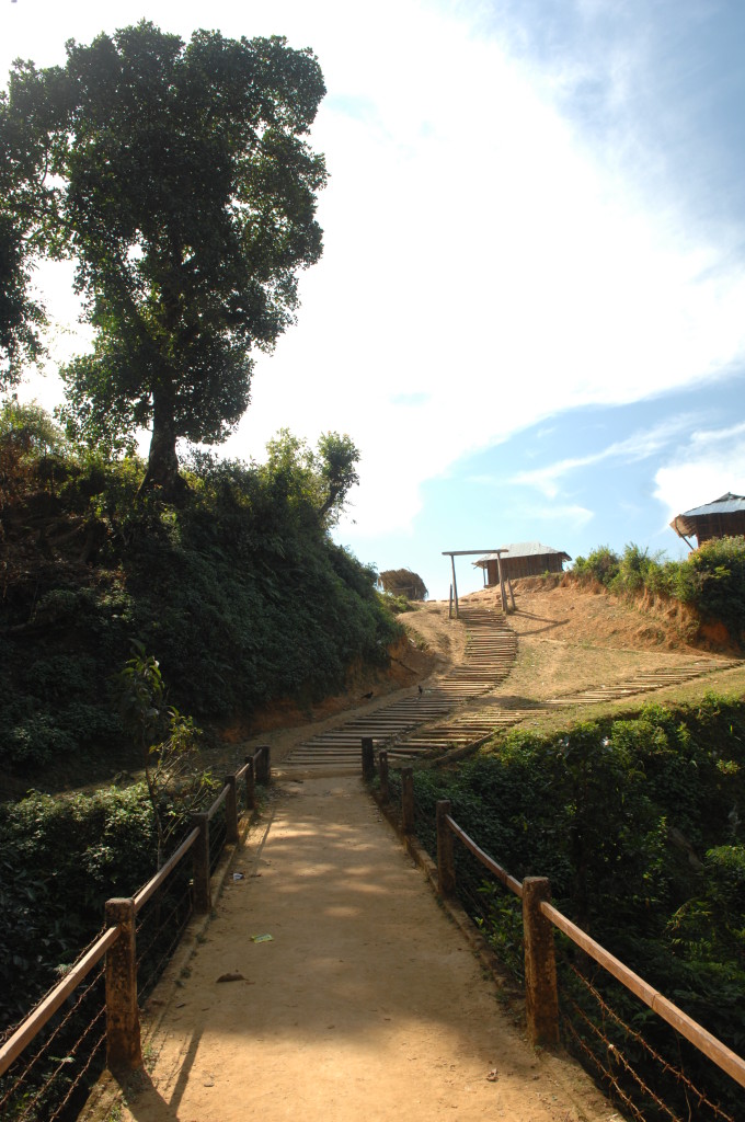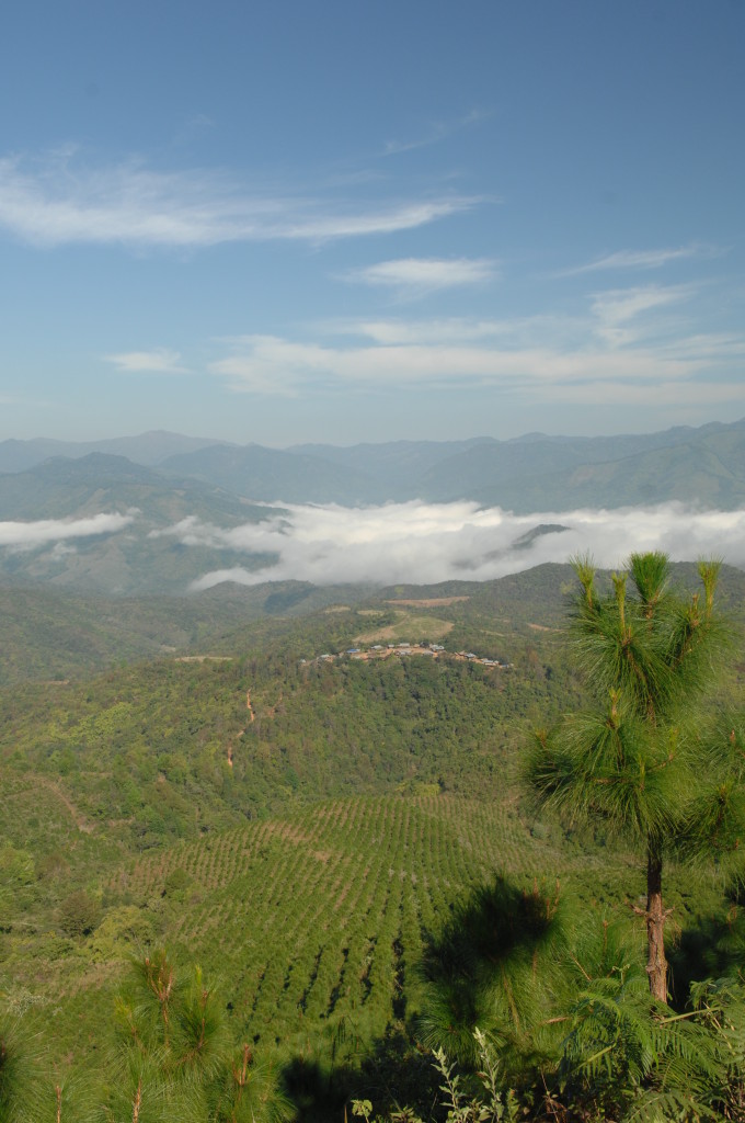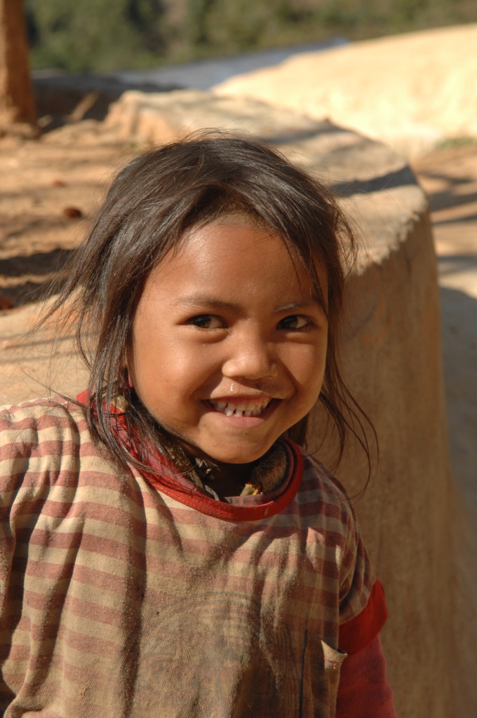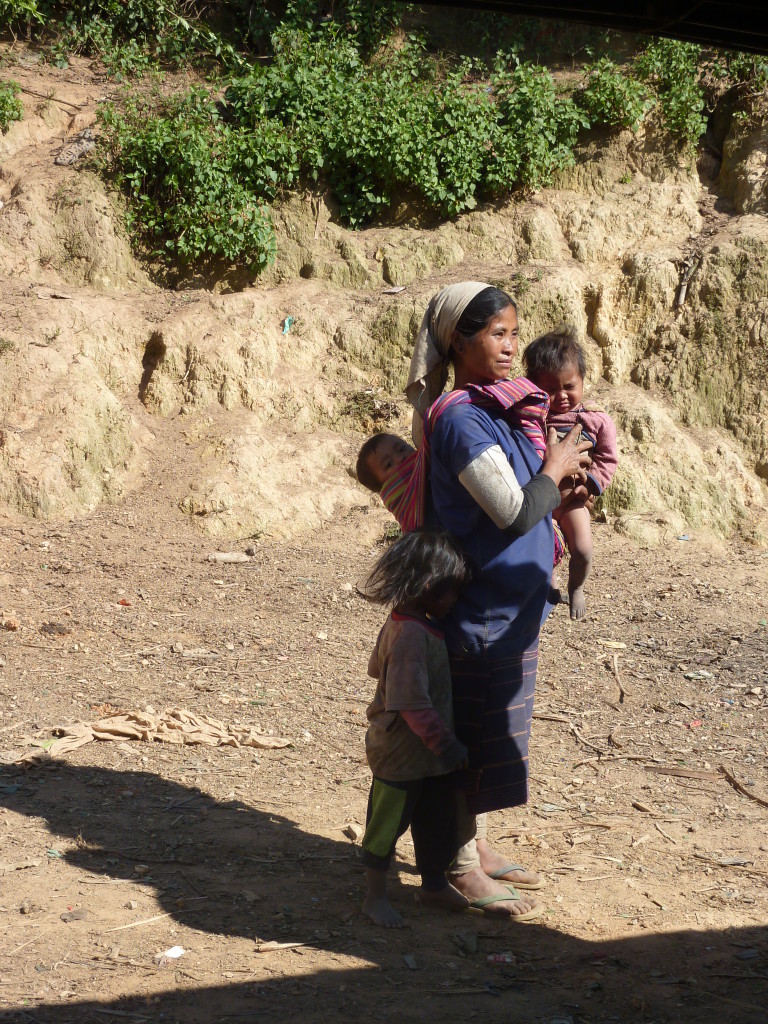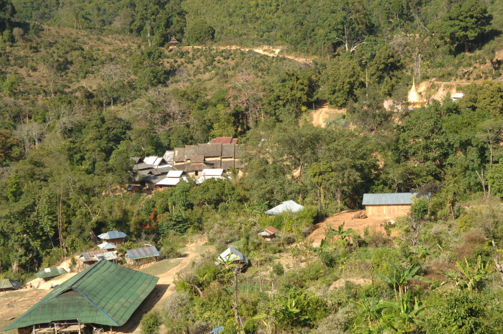 Wie bereits am Vortag löst sich der Morgennebel kurz bevor wir die Talebene hinter Kengtung verlassen. Schon bald windet sich die asphaltierte Straße in zahlreichen Serpentinen bergauf und bergab. Hier haben die Motorsägen mal wieder ganze Arbeit geleistet. Von den ursprünglichen Teak-Wäldern ist nichts mehr übrig. An einigen Stellen hat man mit der Aufforstung begonnen. Auf großen Tafeln verkündet die zuständige Regierungsstelle stolz die Pflanzung von 50 Hektar Pinien im Januar 2013. Besser spät als nie.