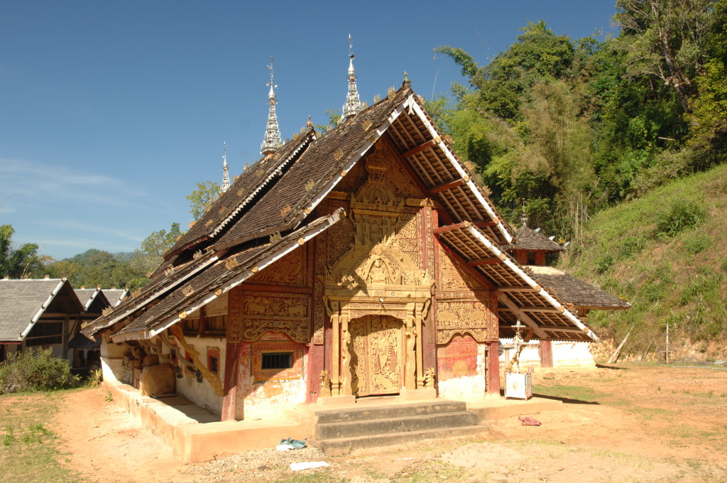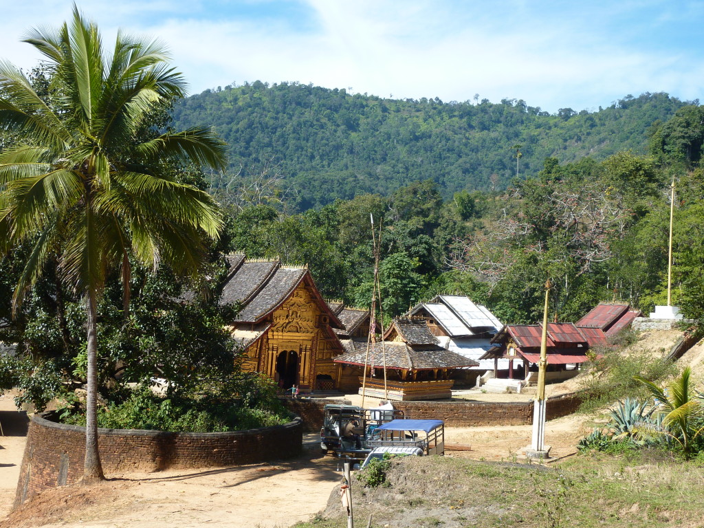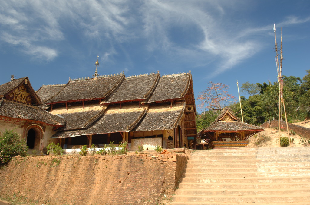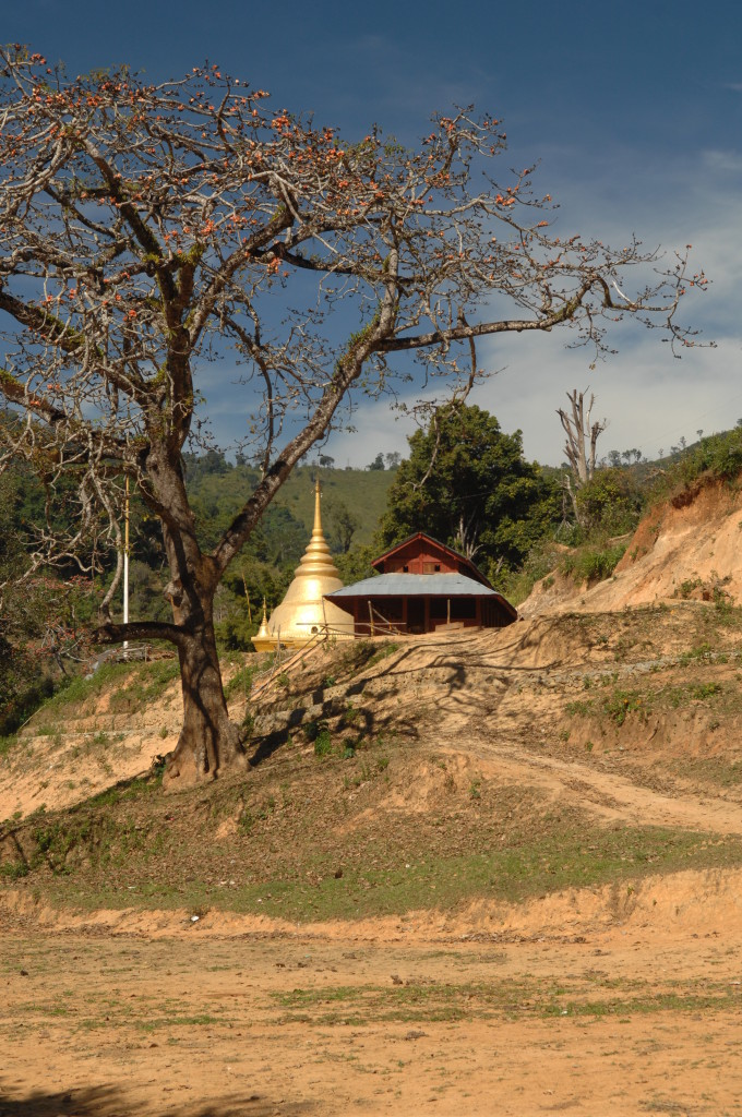 Zwanzig Minuten hinter dem Grenzposten, etwa auf halber Strecke zwischen Kengtung und Mongla, zweigt ein lehmiger Feldweg von der ausgebauten Strecke ab. Zu den alten Klöstern weiter westlich geht es nur zu Fuß oder per Allrad. Unser Fahrzeug ist entsprechend ausgerüstet und kämpft sich tapfer bergauf. Bereits eine Viertelstunde später erreichen wir die Wan Nyat Monastry.