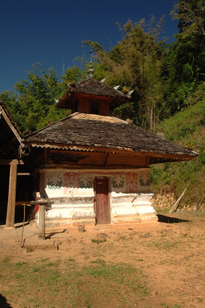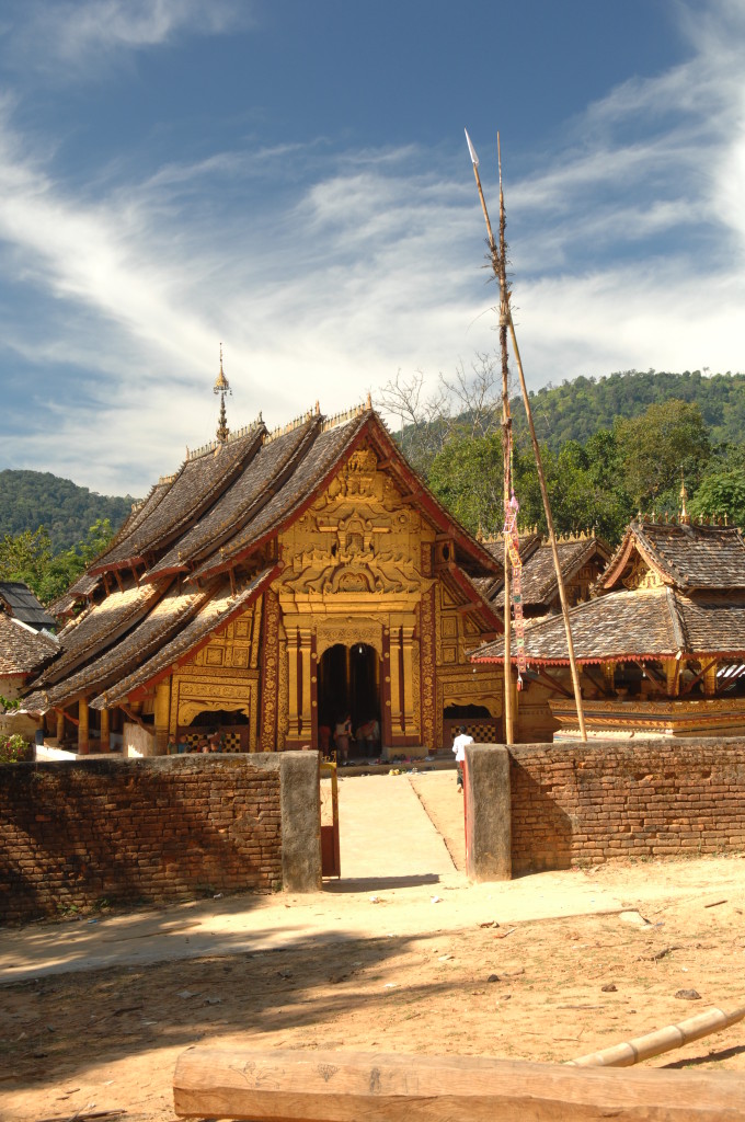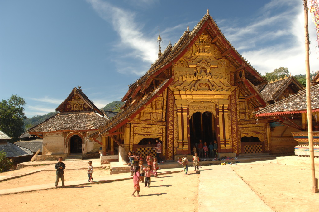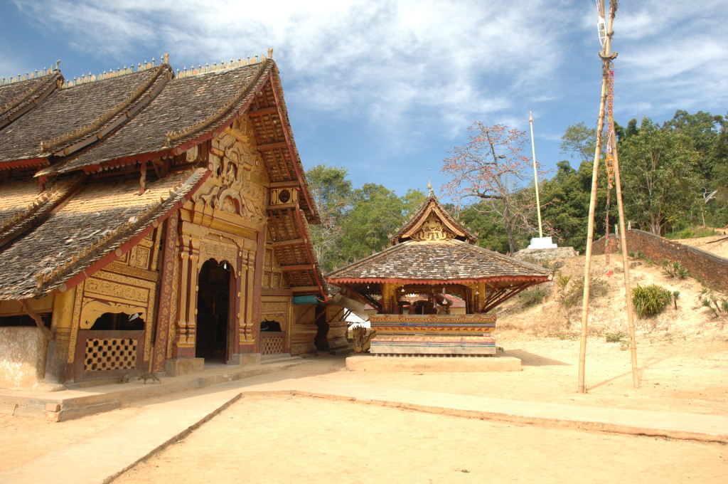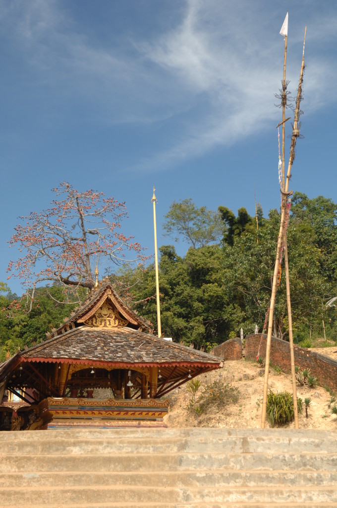 Zwanzig Minuten hinter dem Grenzposten, etwa auf halber Strecke zwischen Kengtung und Mongla, zweigt ein lehmiger Feldweg von der ausgebauten Strecke ab. Zu den alten Klöstern weiter westlich geht es nur zu Fuß oder per Allrad. Unser Fahrzeug ist entsprechend ausgerüstet und kämpft sich tapfer bergauf. Bereits eine Viertelstunde später erreichen wir die Wan Nyat Monastry.