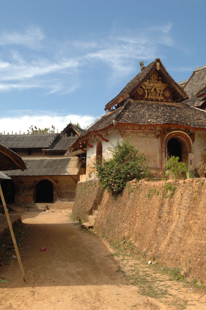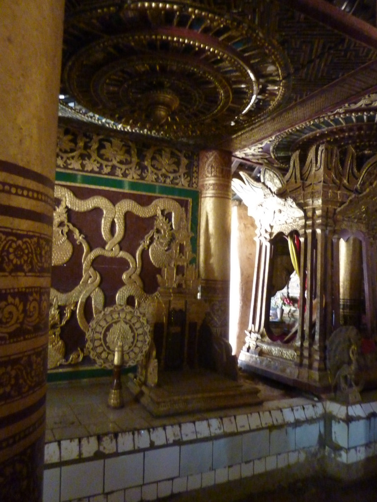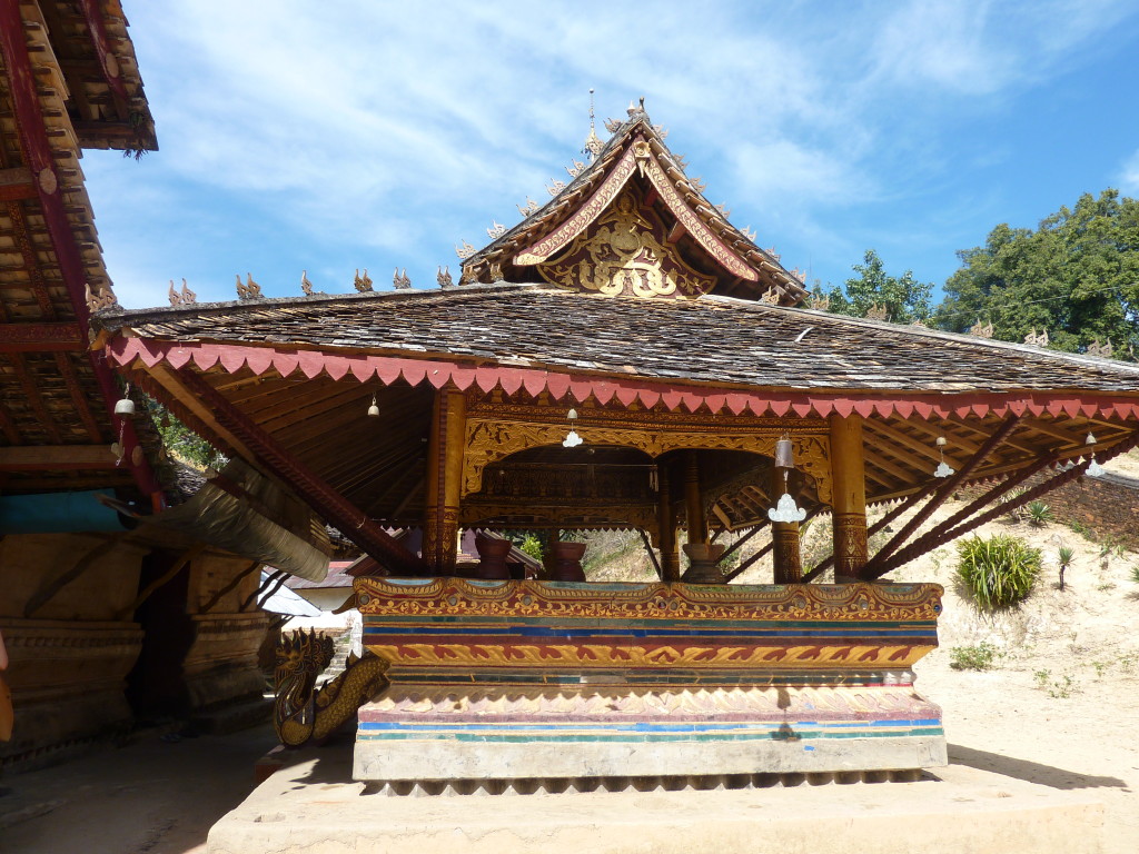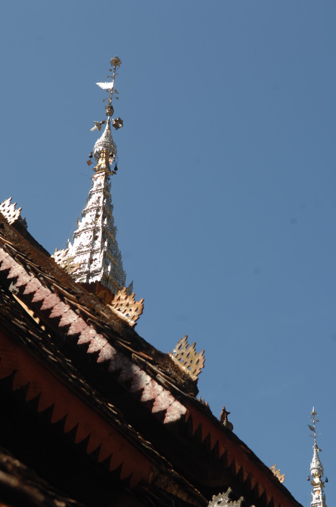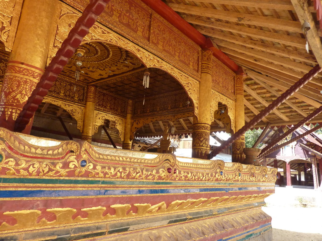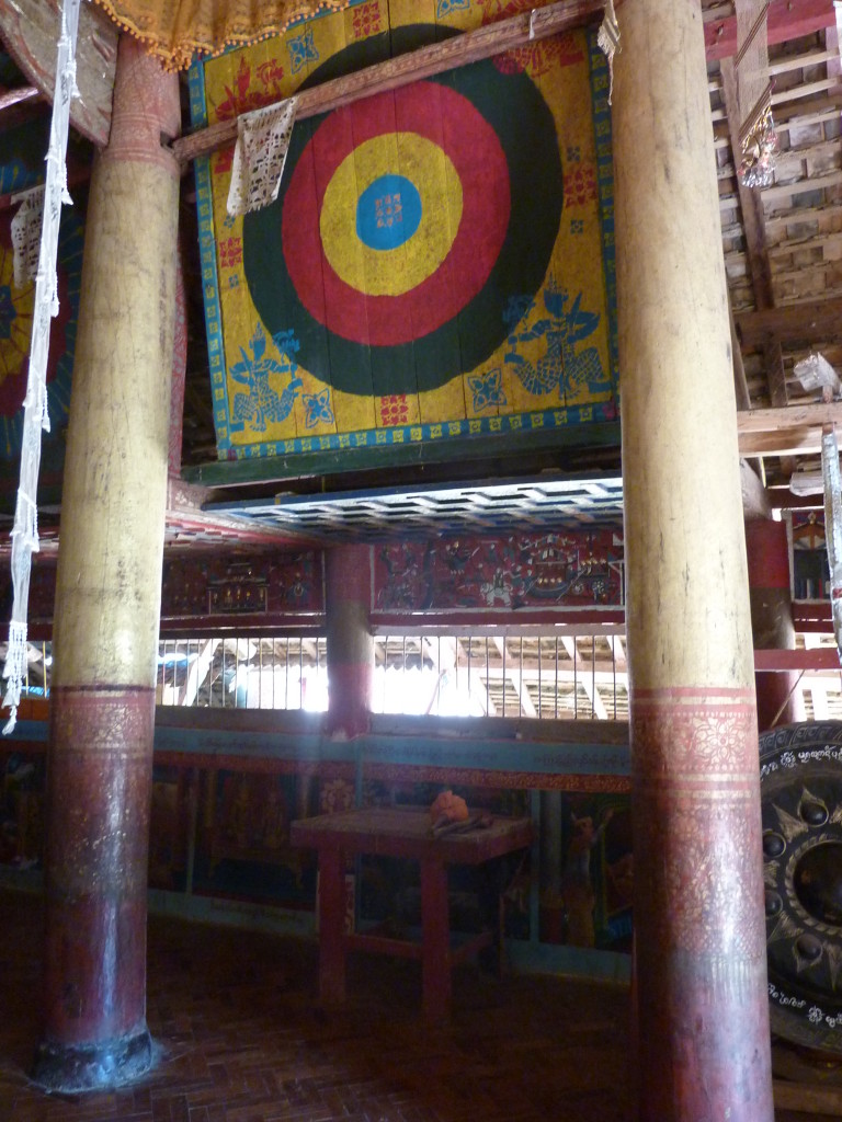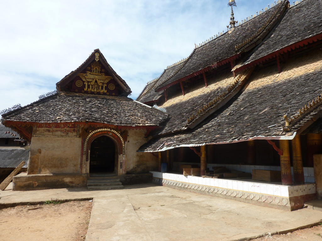 Das Kloster wurde im 16. Jhdt. erbaut und liegt auf einer Lichtung im Bergwald. Mit den Teak-Klöstern, die wir auf der Fahrt nach Bagan besucht haben, hat es wenig gemein. Die Bauweise erinnert mal an die nord-laotische, mal an die tibetische Architektur vergleichbarer Gebäude. Die reichhaltig mit Schnitzereien, Holzmalereien und Mosaiken versehene Ausstattung im Inneren ist ebenfalls ungewöhnlich.