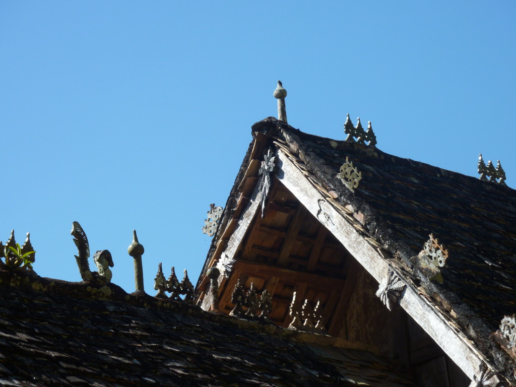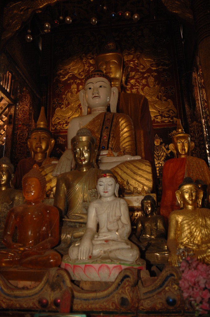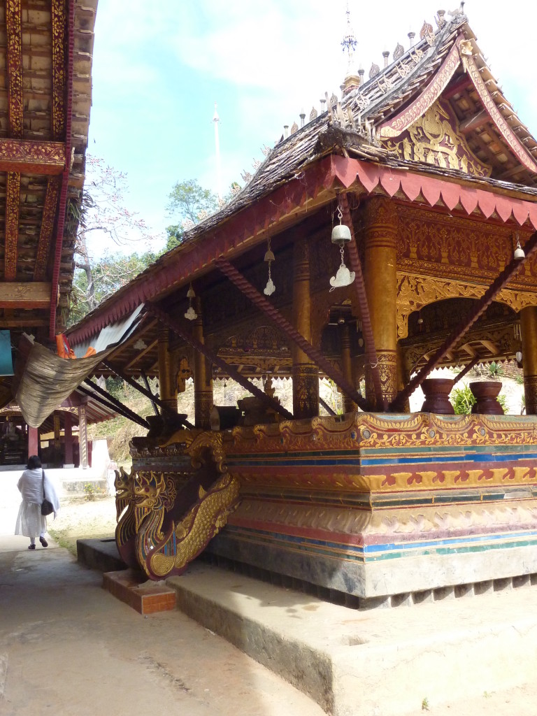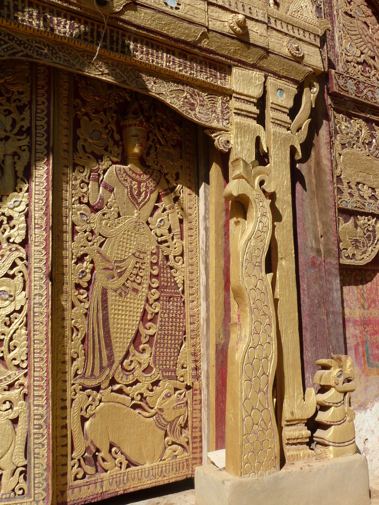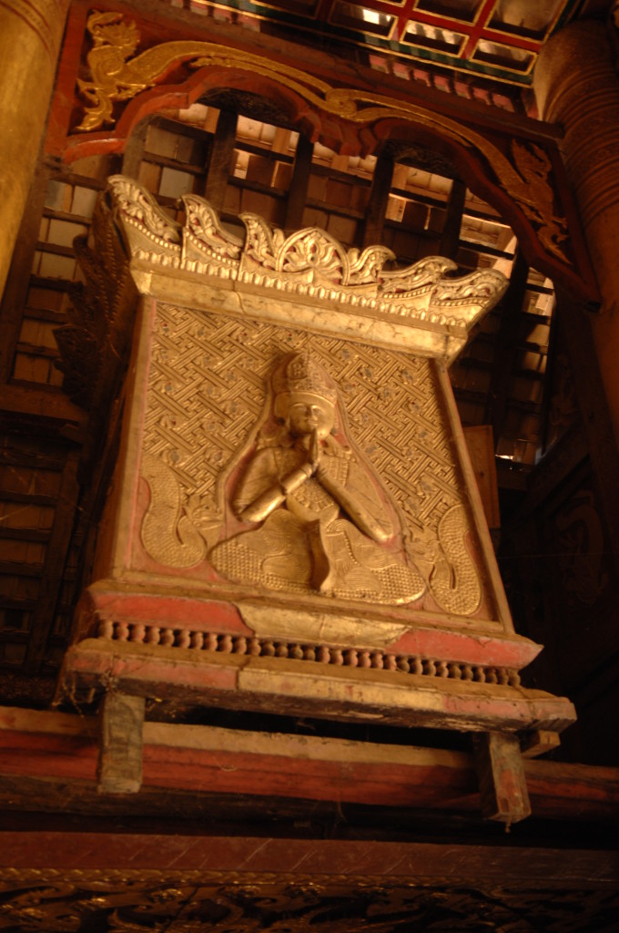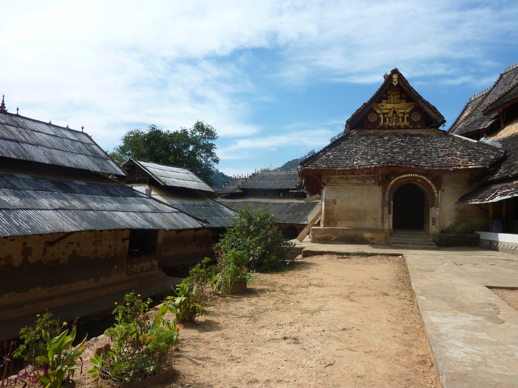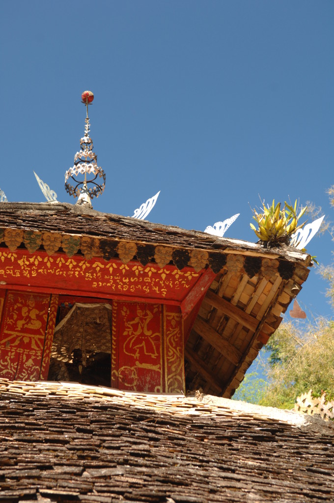 Das Kloster wurde im 16. Jhdt. erbaut und liegt auf einer Lichtung im Bergwald. Mit den Teak-Klöstern, die wir auf der Fahrt nach Bagan besucht haben, hat es wenig gemein. Die Bauweise erinnert mal an die nord-laotische, mal an die tibetische Architektur vergleichbarer Gebäude. Die reichhaltig mit Schnitzereien, Holzmalereien und Mosaiken versehene Ausstattung im Inneren ist ebenfalls ungewöhnlich.
