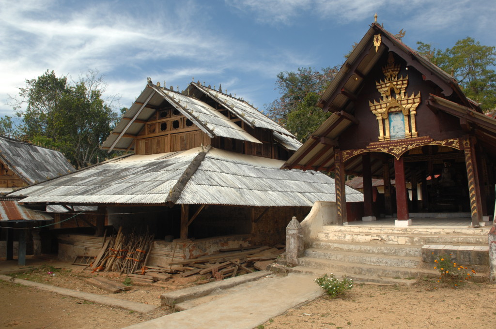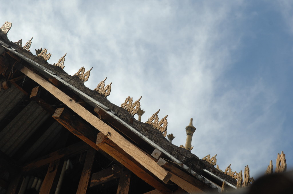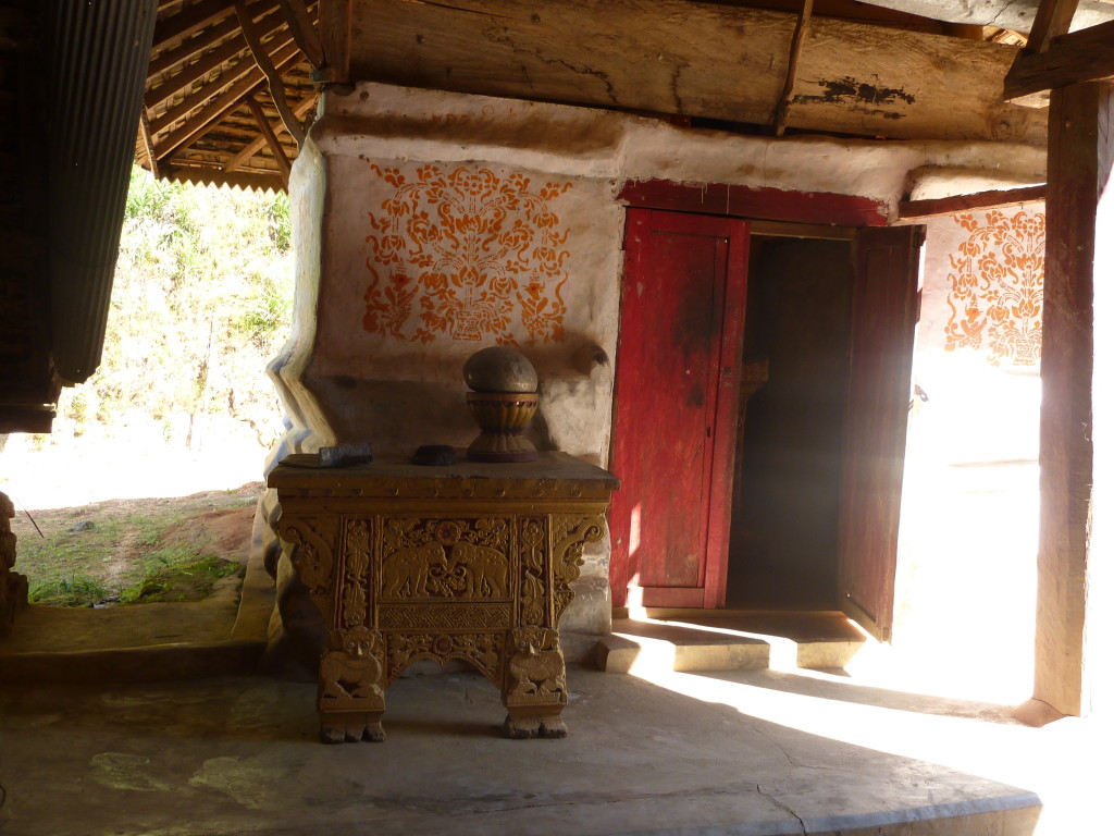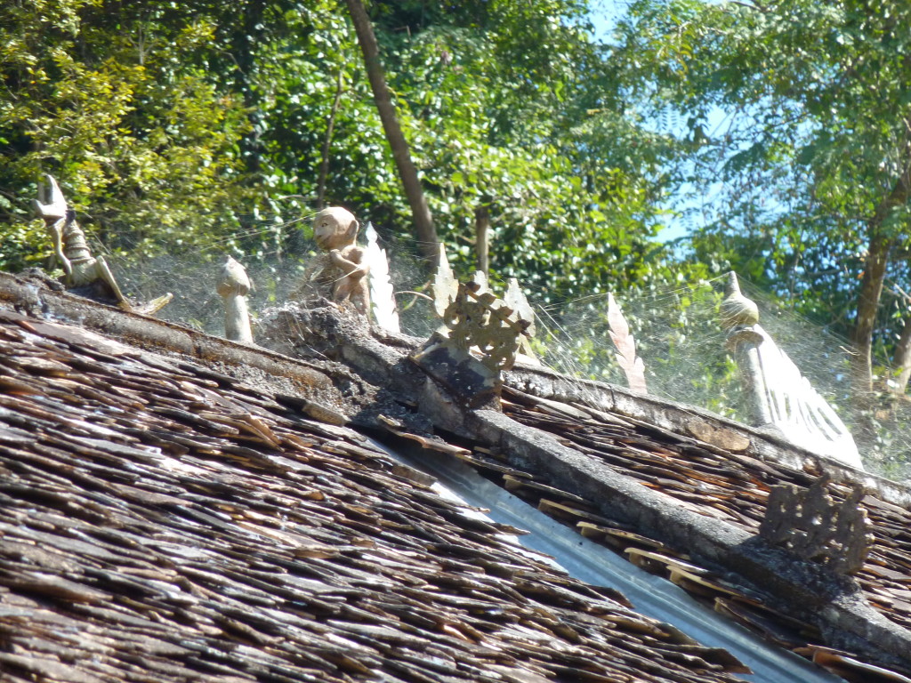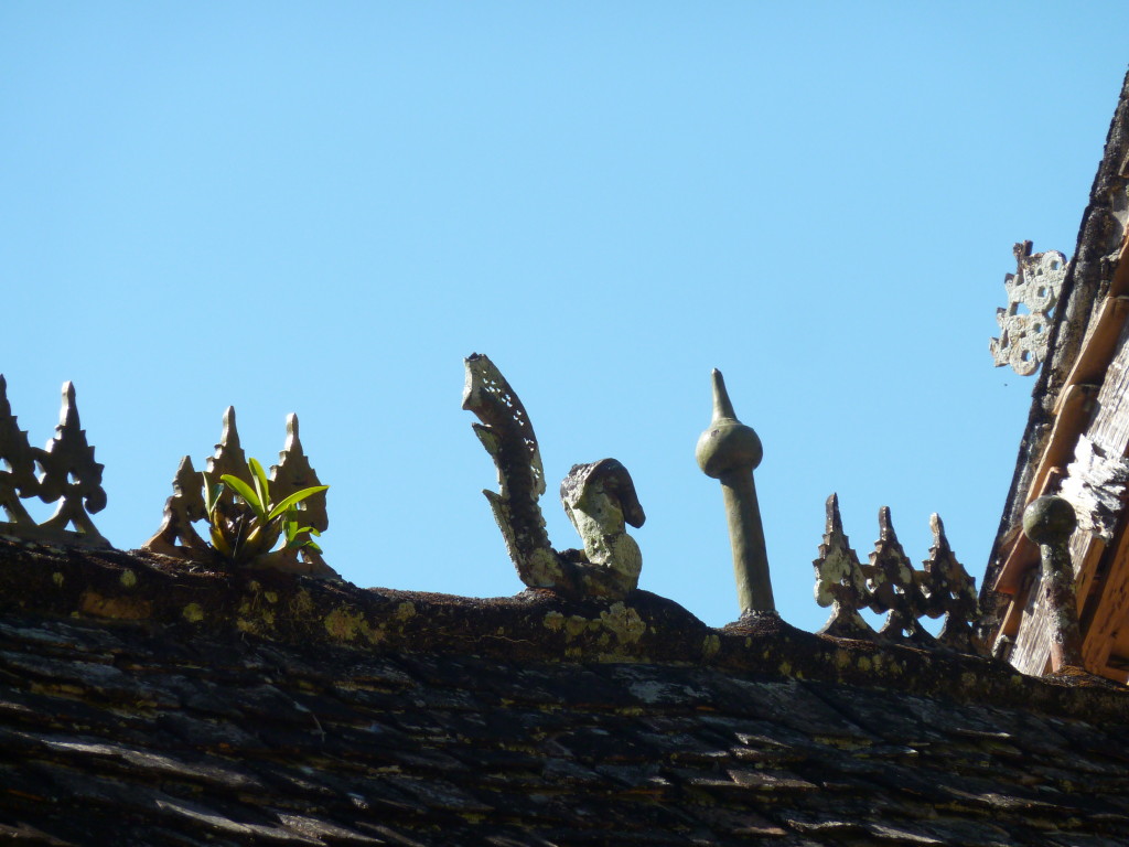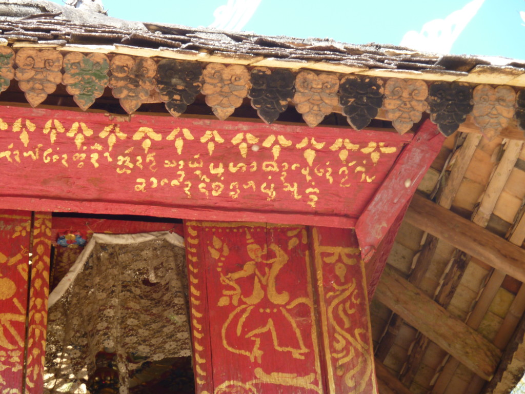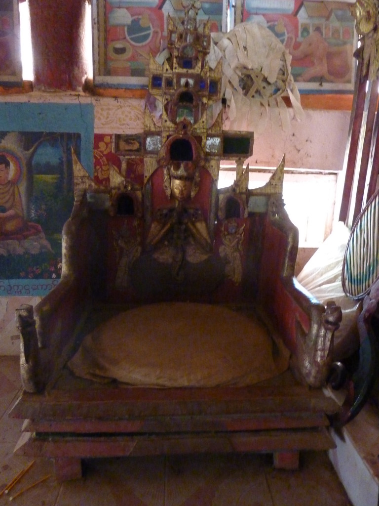 Das Kloster wurde im 16. Jhdt. erbaut und liegt auf einer Lichtung im Bergwald. Mit den Teak-Klöstern, die wir auf der Fahrt nach Bagan besucht haben, hat es wenig gemein. Die Bauweise erinnert mal an die nord-laotische, mal an die tibetische Architektur vergleichbarer Gebäude. Die reichhaltig mit Schnitzereien, Holzmalereien und Mosaiken versehene Ausstattung im Inneren ist ebenfalls ungewöhnlich.
