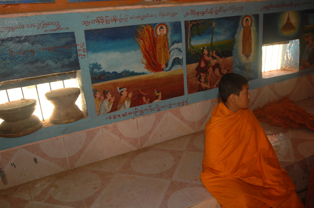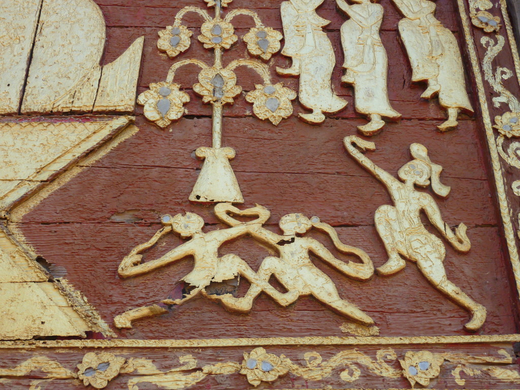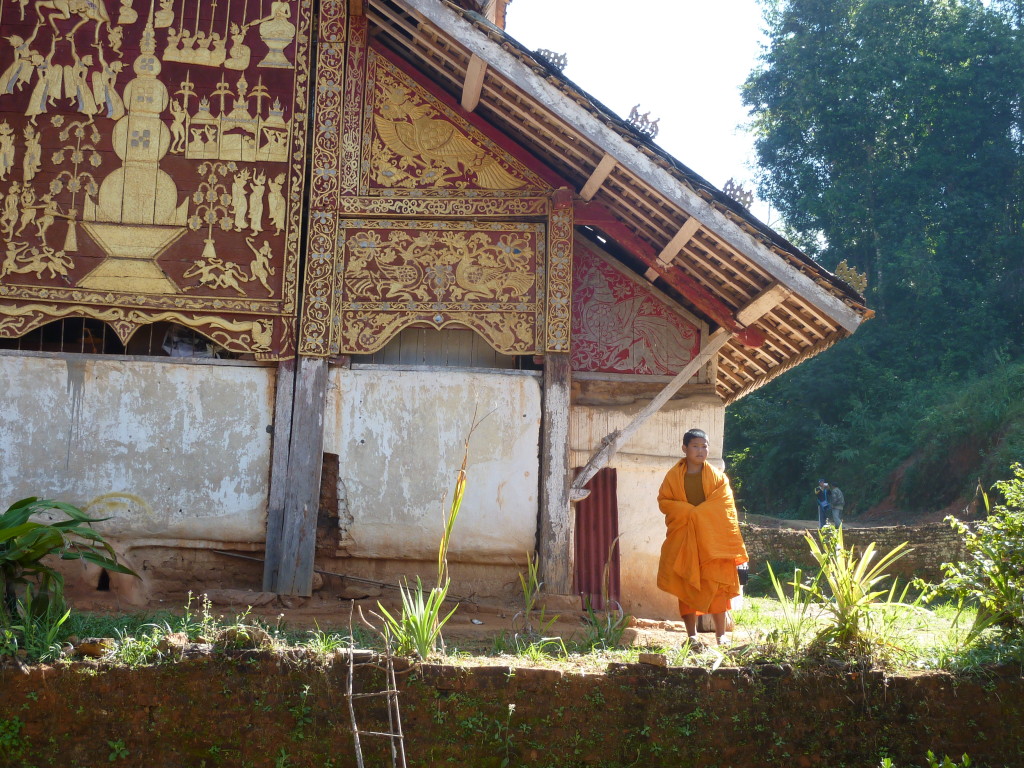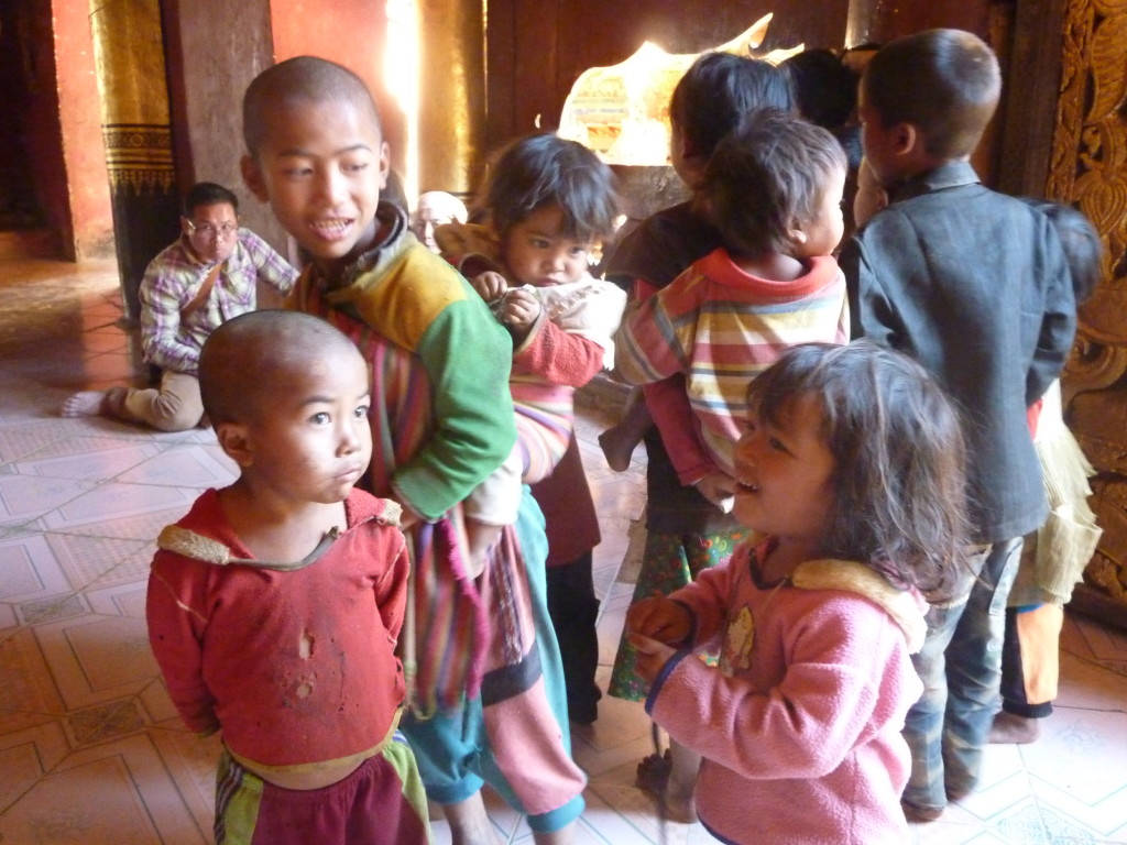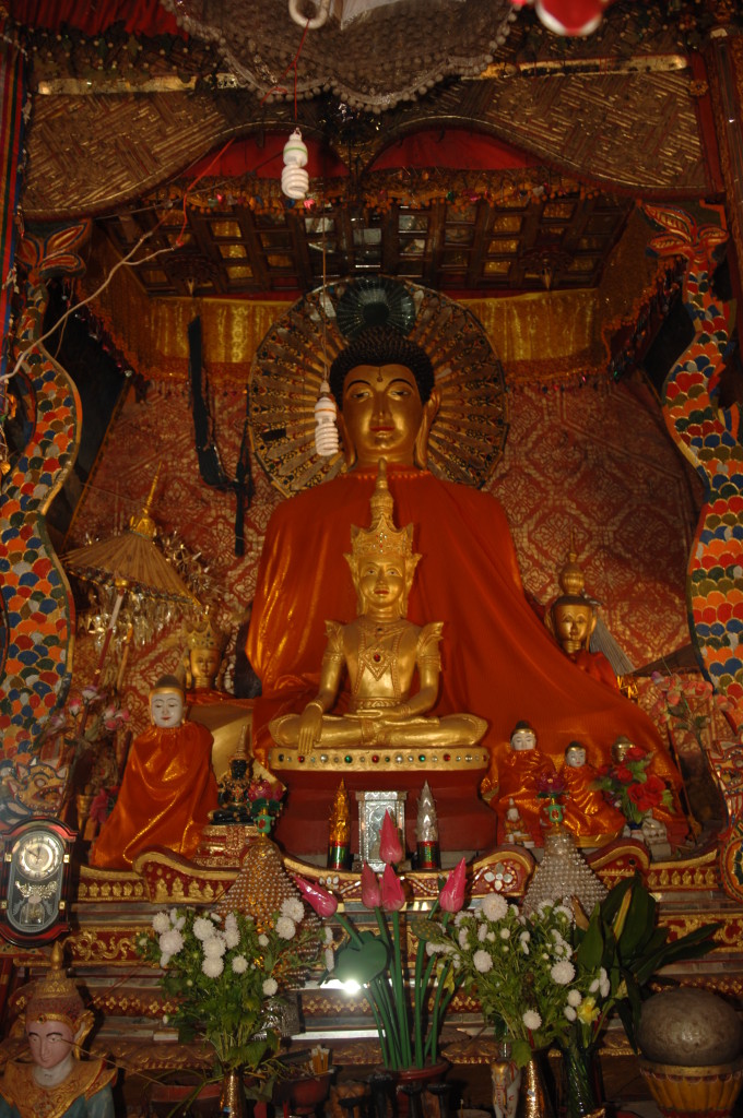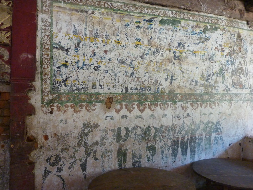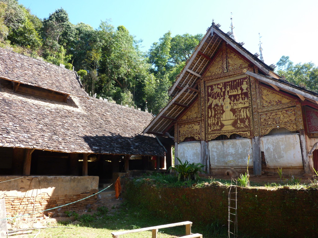 Das Kloster wurde im 16. Jhdt. erbaut und liegt auf einer Lichtung im Bergwald. Mit den Teak-Klöstern, die wir auf der Fahrt nach Bagan besucht haben, hat es wenig gemein. Die Bauweise erinnert mal an die nord-laotische, mal an die tibetische Architektur vergleichbarer Gebäude. Die reichhaltig mit Schnitzereien, Holzmalereien und Mosaiken versehene Ausstattung im Inneren ist ebenfalls ungewöhnlich.