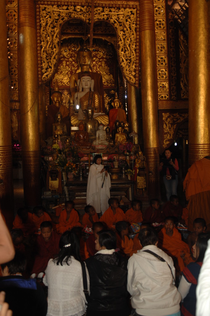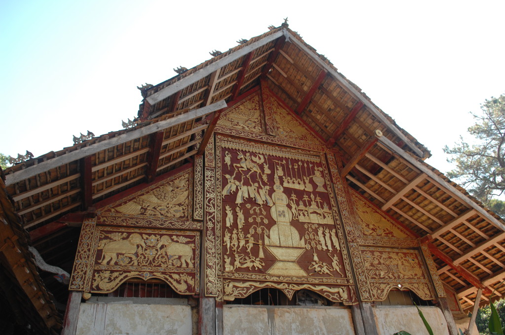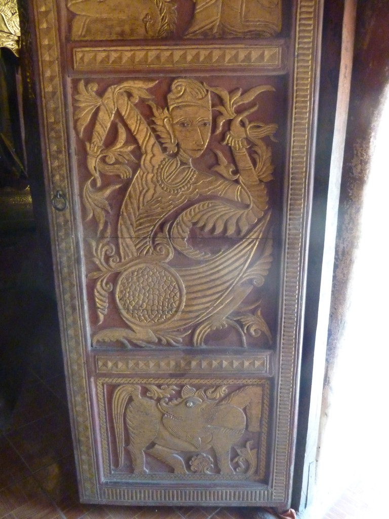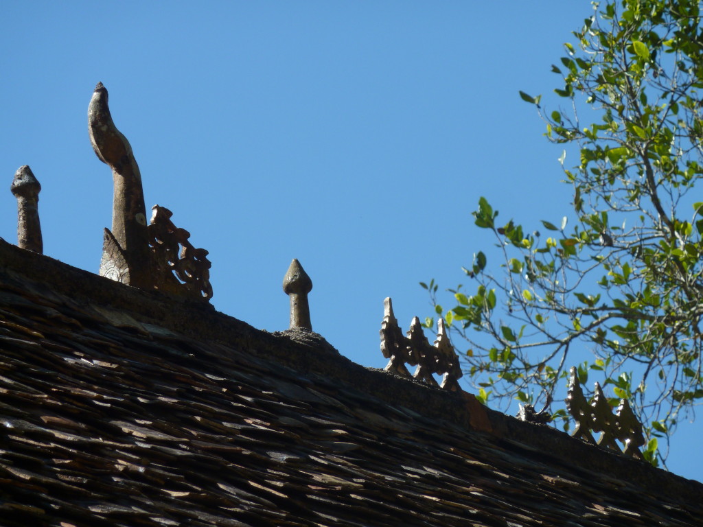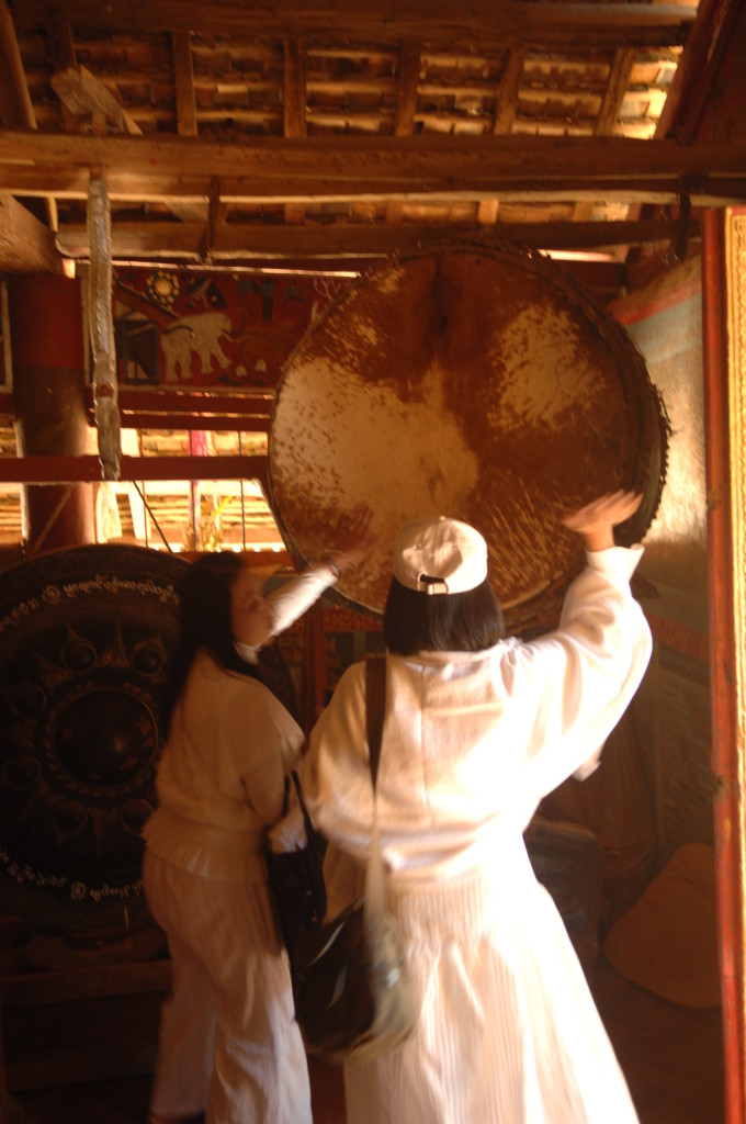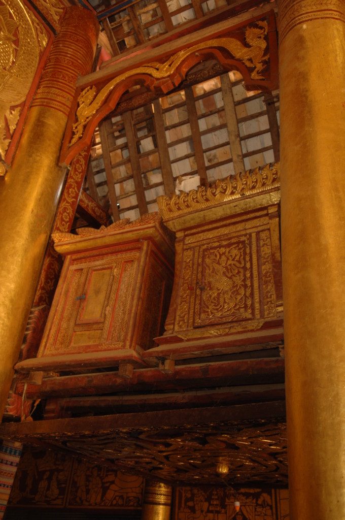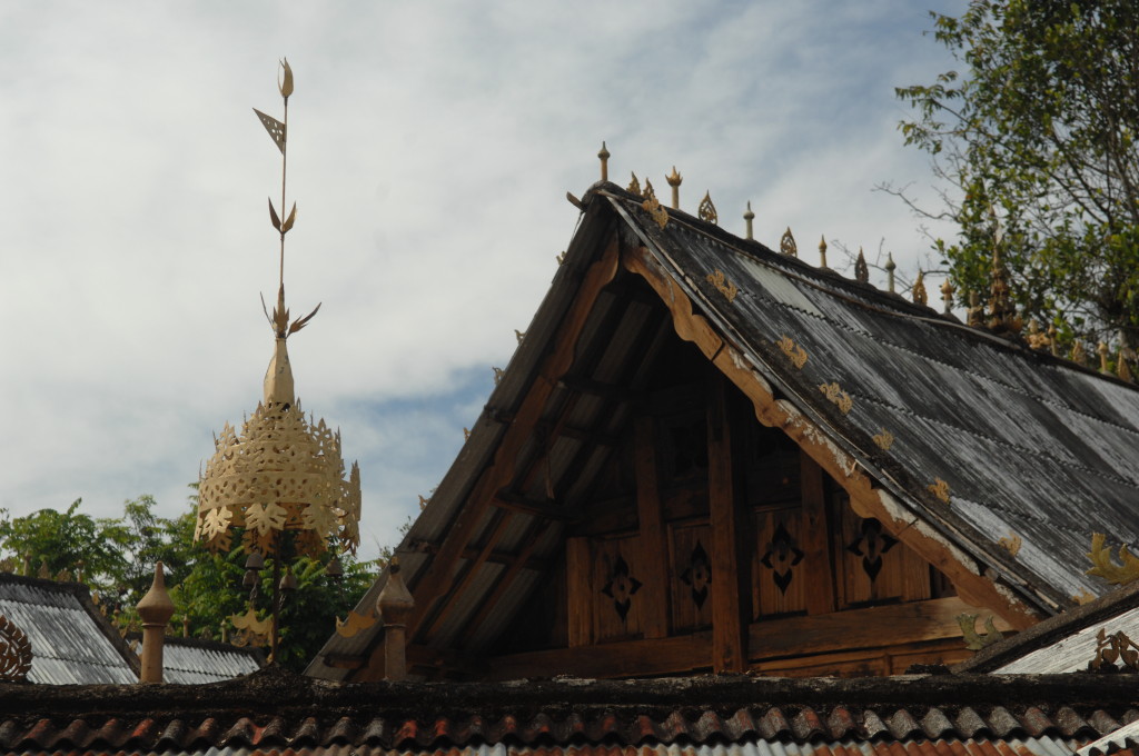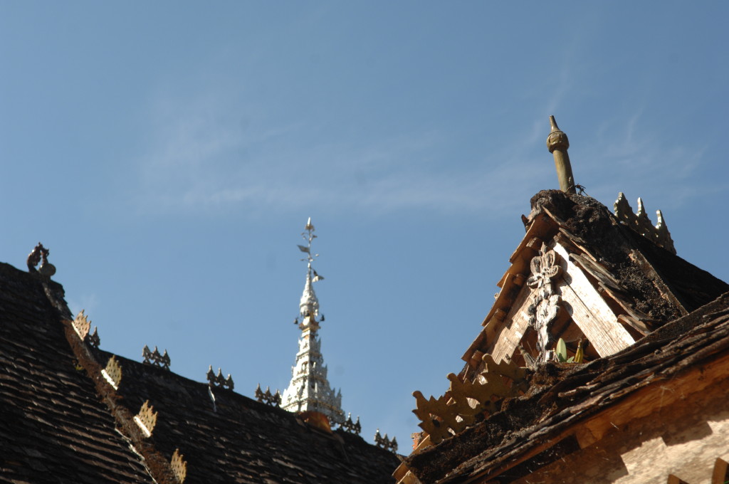 Das Kloster wurde im 16. Jhdt. erbaut und liegt auf einer Lichtung im Bergwald. Mit den Teak-Klöstern, die wir auf der Fahrt nach Bagan besucht haben, hat es wenig gemein. Die Bauweise erinnert mal an die nord-laotische, mal an die tibetische Architektur vergleichbarer Gebäude. Die reichhaltig mit Schnitzereien, Holzmalereien und Mosaiken versehene Ausstattung im Inneren ist ebenfalls ungewöhnlich.