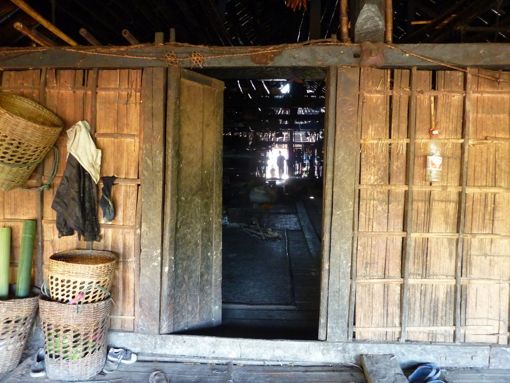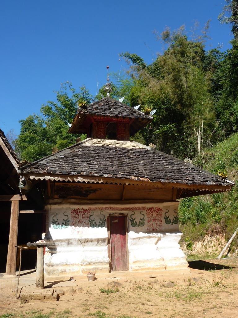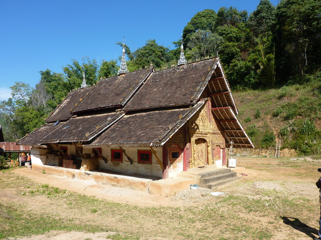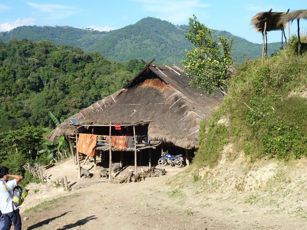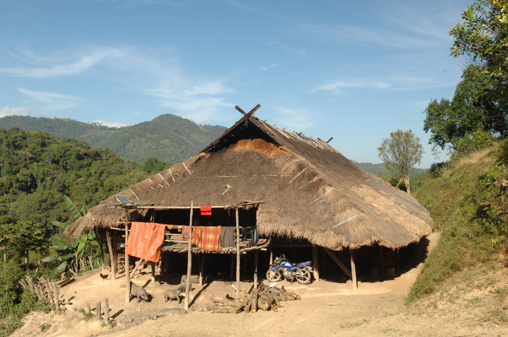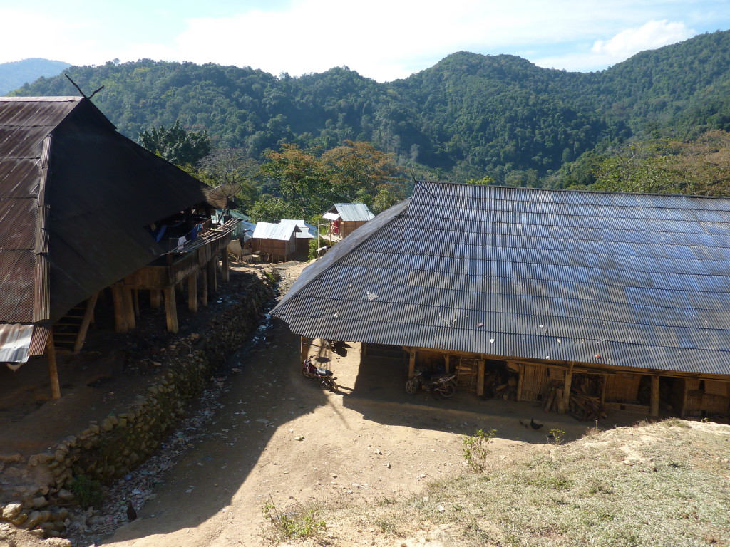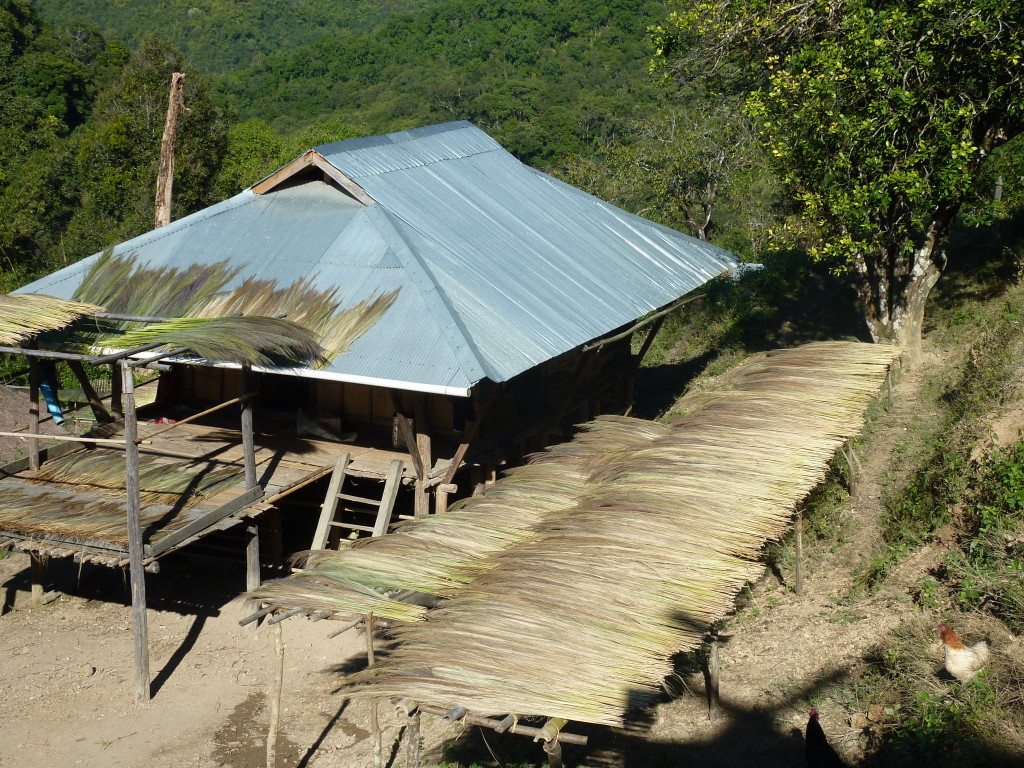 Auf dem Rückweg halten wir erneut vor der Wan Nyat Monastry. Auch unterhalb dieses Klosters befindet sich ein kleines Dorf der Loi Wa. Die vier Langhäuser sind kleiner und bieten nur Platz für jeweils sechs Familien. Die Dächer sind nicht wie im Nachbarort mit Wellblech, sondern traditionell mit Gras gedeckt. Lediglich ein Neubau hat ein Metalldach, das aber schon bald unter einer Schicht Grasbündel verschwinden wird.