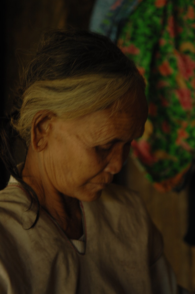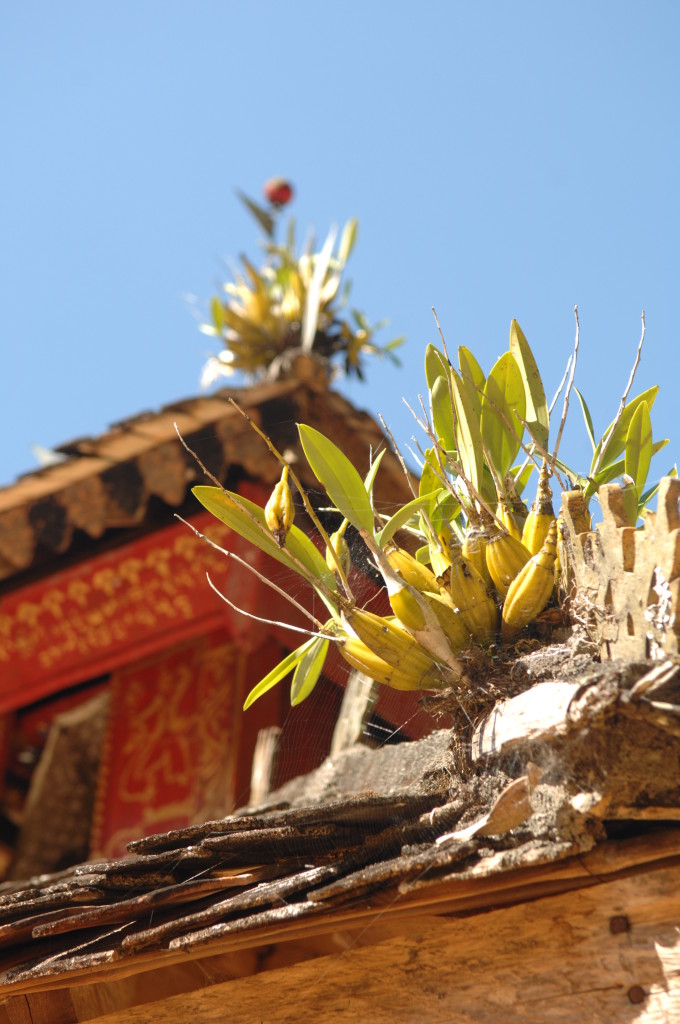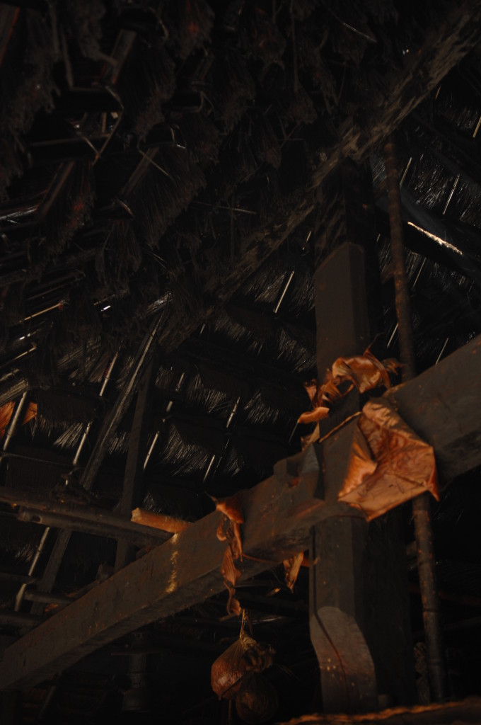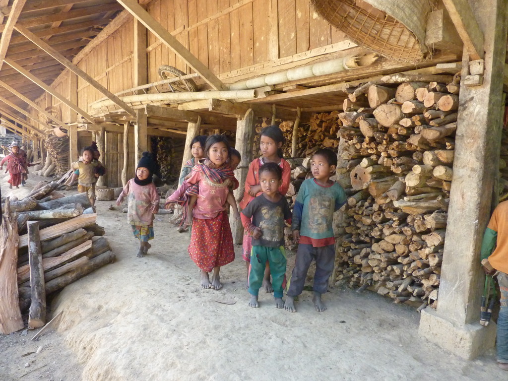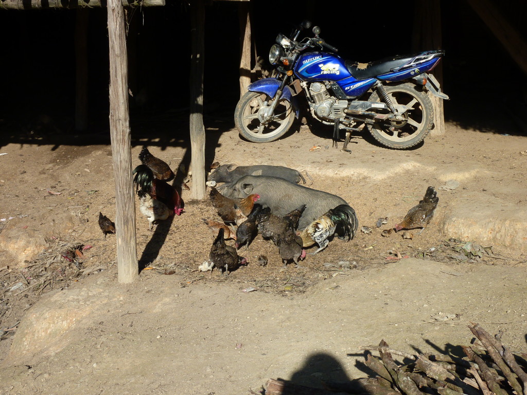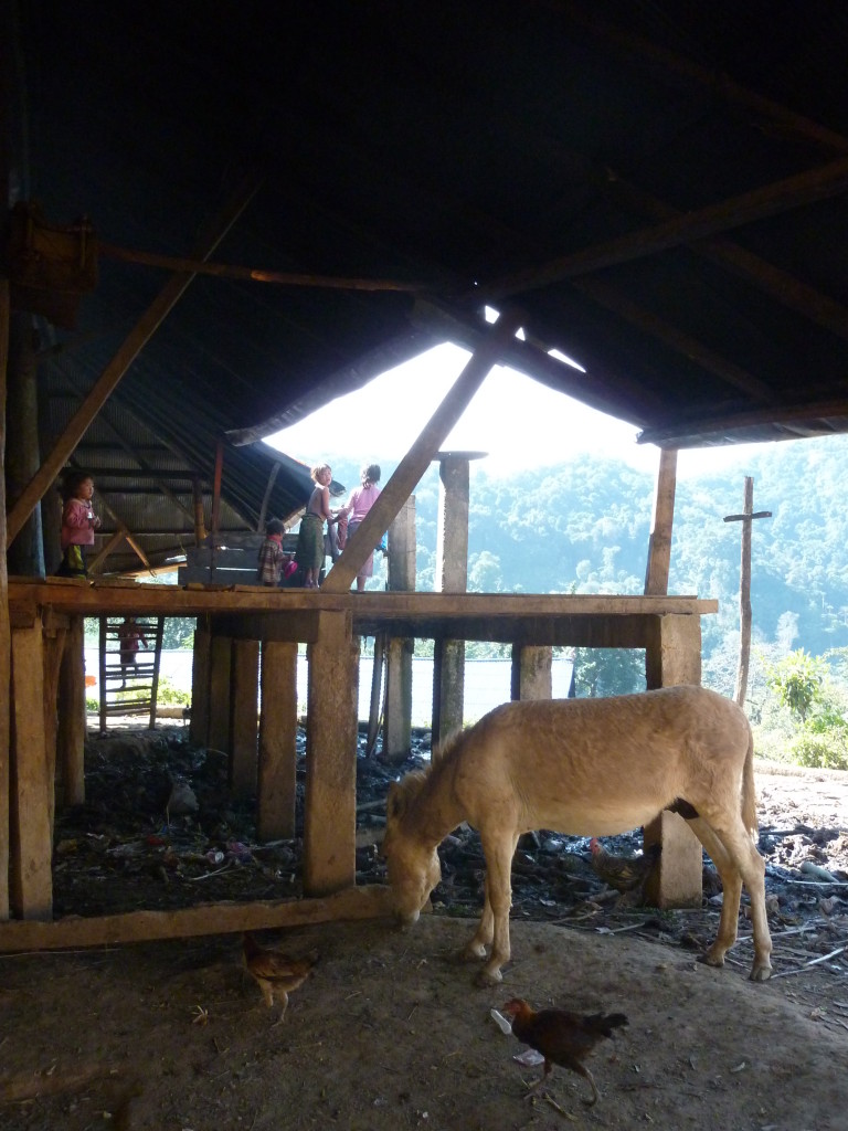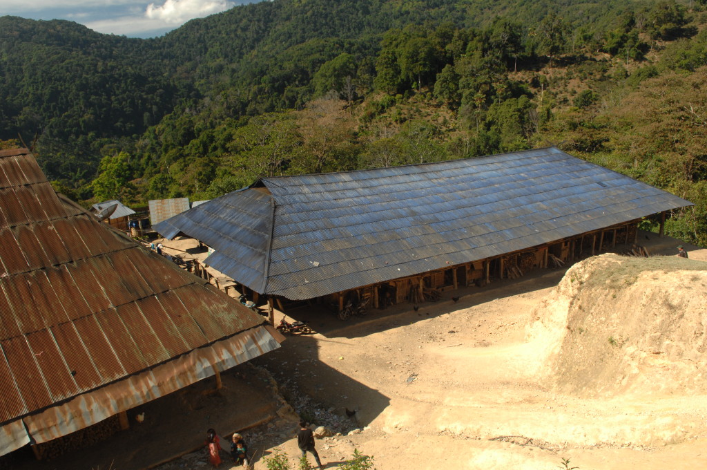 Auf dem Rückweg halten wir erneut vor der Wan Nyat Monastry. Auch unterhalb dieses Klosters befindet sich ein kleines Dorf der Loi Wa. Die vier Langhäuser sind kleiner und bieten nur Platz für jeweils sechs Familien. Die Dächer sind nicht wie im Nachbarort mit Wellblech, sondern traditionell mit Gras gedeckt. Lediglich ein Neubau hat ein Metalldach, das aber schon bald unter einer Schicht Grasbündel verschwinden wird.