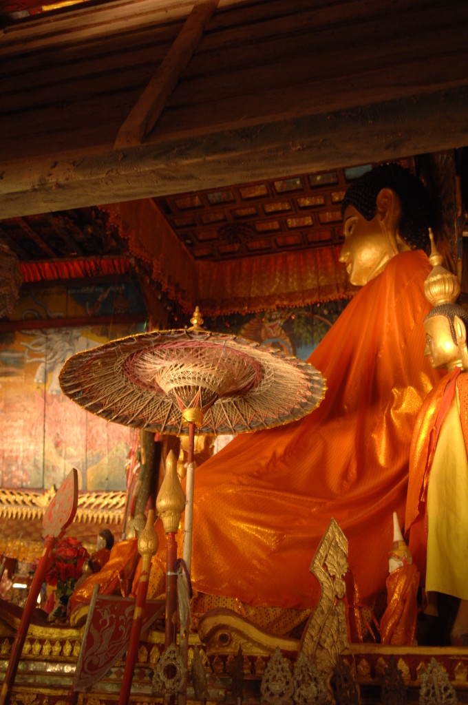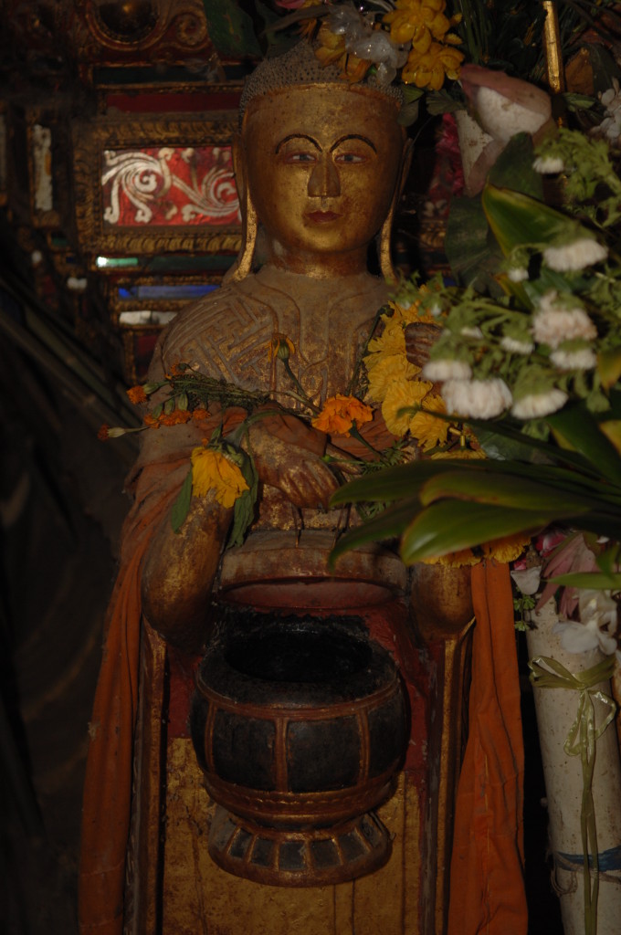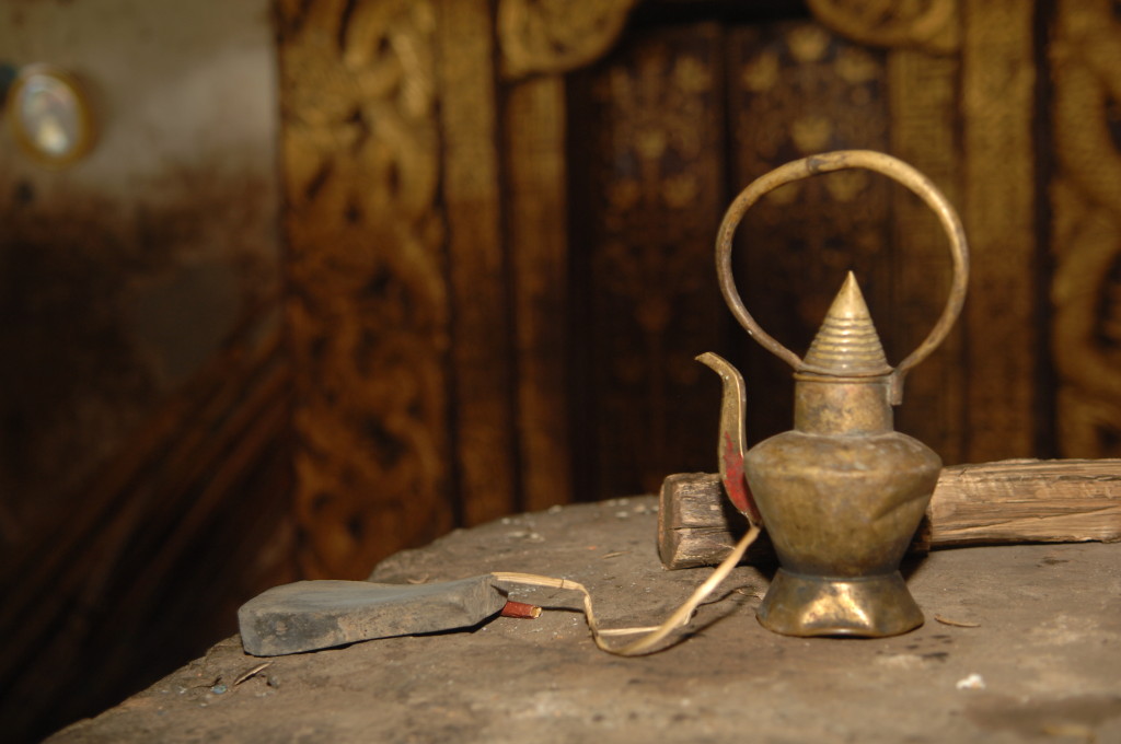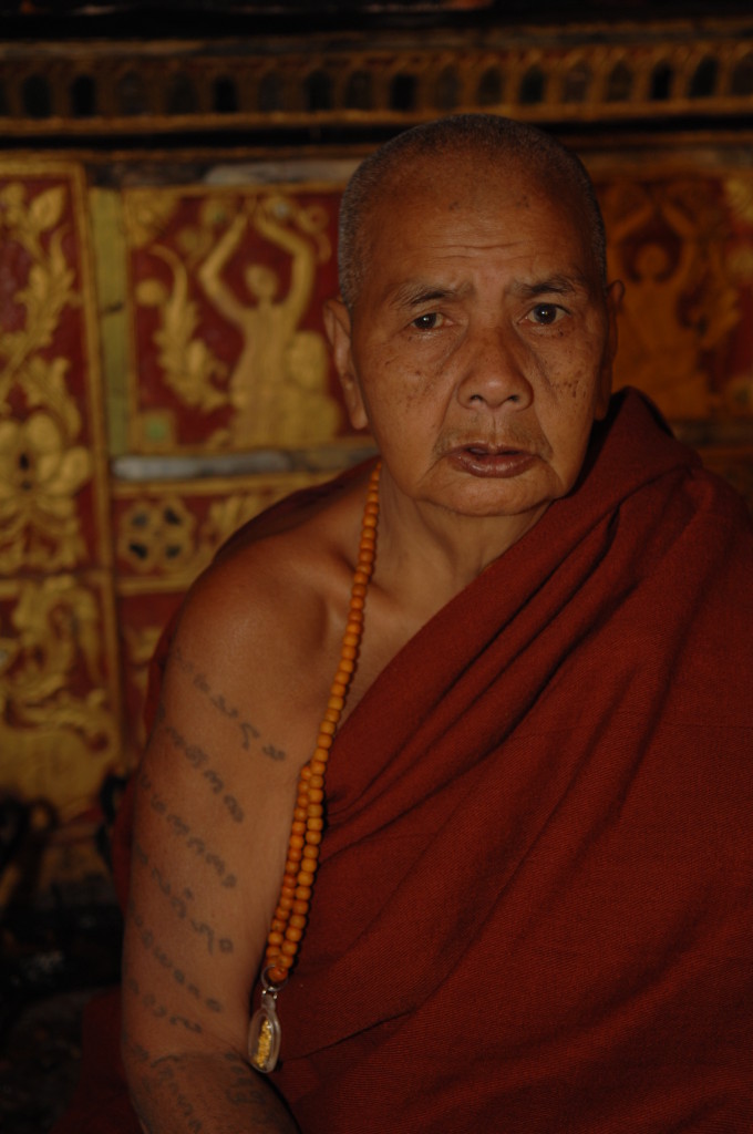 Mit der Ruhe im Tempel ist allerdings schnell Schluss. Kurz nach uns haben es die thailändischen Pilger mit ihren allradgetriebenen Mini-Bussen ebenfalls zum Kloster geschafft. Nach einem kurzen Gebet vor dem großen Buddha übergeben sie dem Abt des Klosters feierlich Decken und einen dicken Geldumschlag. Der alte Mönch bedankt sich bei den großzügigen Spendern und erteilt murmelnd seinen Segen. Dem können und wollen auch wir uns nicht entziehen. Für uns hat er aber eine kleine Erweiterung der Segensformel parat. Sein Gebet endet mit den auch für uns verständlichen Worten „I love you. Goodbye.“
