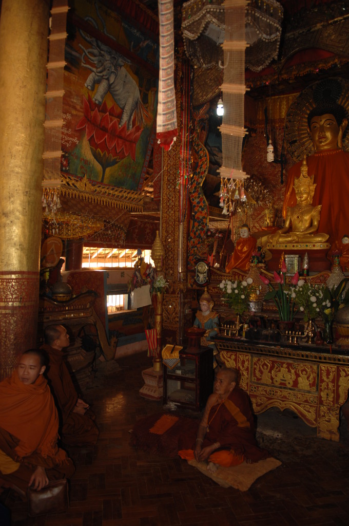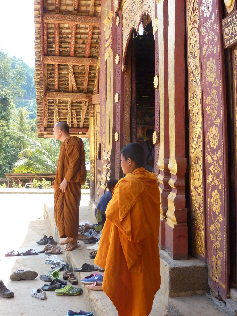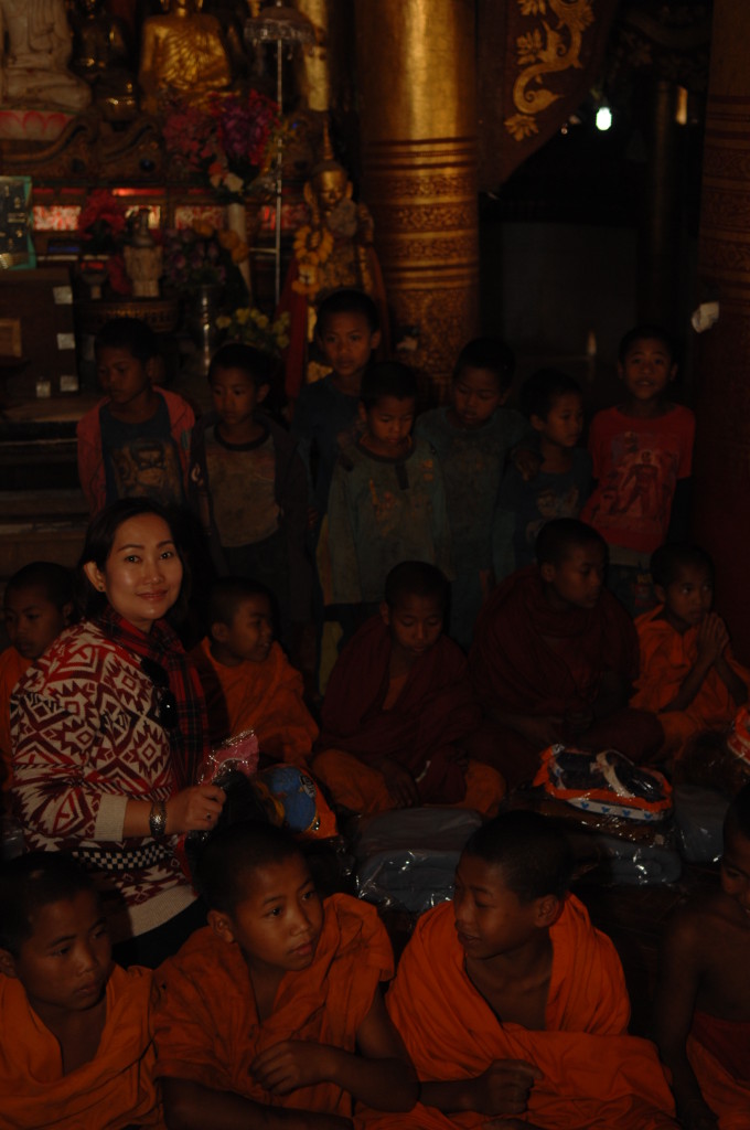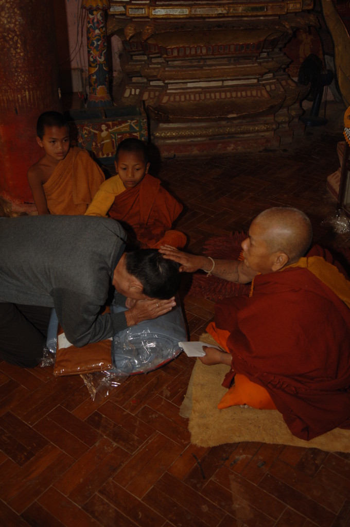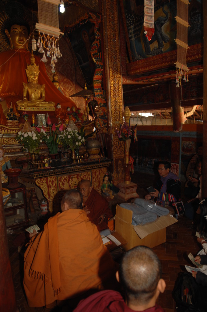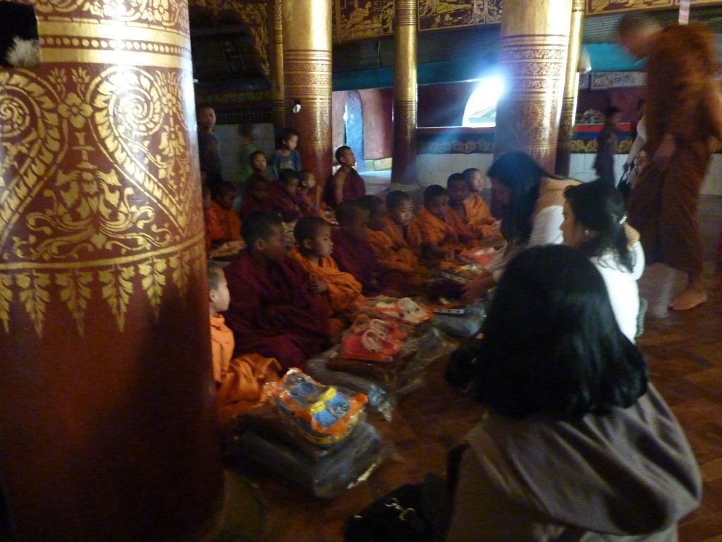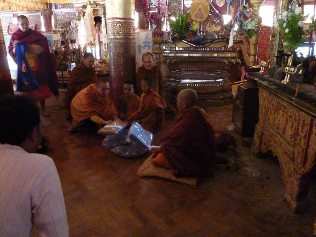 Auf dem Boden haben die weißgewandeten Pilger bereits Stellung bezogen. Dieses Mal sollen die jungen Novizen reich beschenkt werden. In zwei Reihen sitzen sich die jungen Mönche und die Spender aus dem Nachbarland gegenüber. Die Leiterin der Gruppe zückt die Videokamera und auf Kommando werden synchron die Geschenke überreicht, unter anderem Wollmützen und Plastik-Clogs. Letztere ein paar Nummern größer als nötig, zum Reinwachsen geeignet. Auch für das leibliche Wohl ist gedacht. Aus einer großen Kühlbox werden Beutelchen mit einer scharfen, mit viel Zitronengras gewürzten Wurst und scharfe Chilisoße sowie in Bananenblättern gegarter Klebreis verteilt. Richtig geraten: wir dürfen uns diesem gemeinsamen Essen natürlich ebenfalls nicht entziehen.
