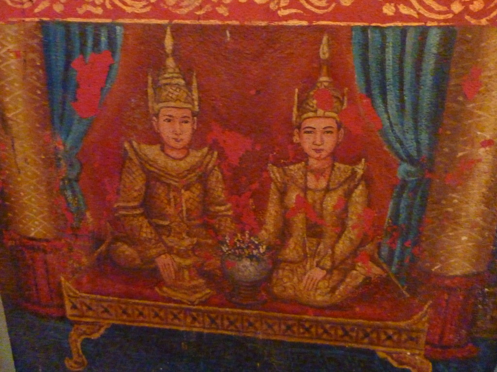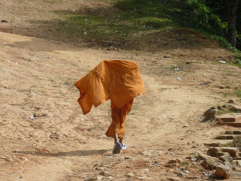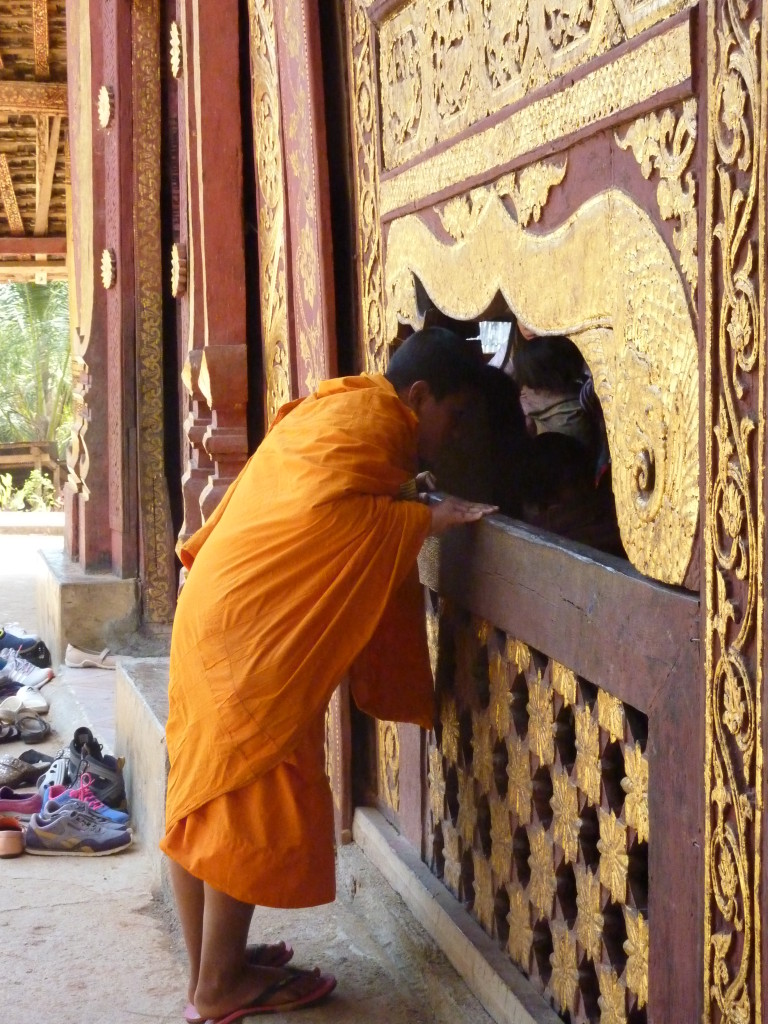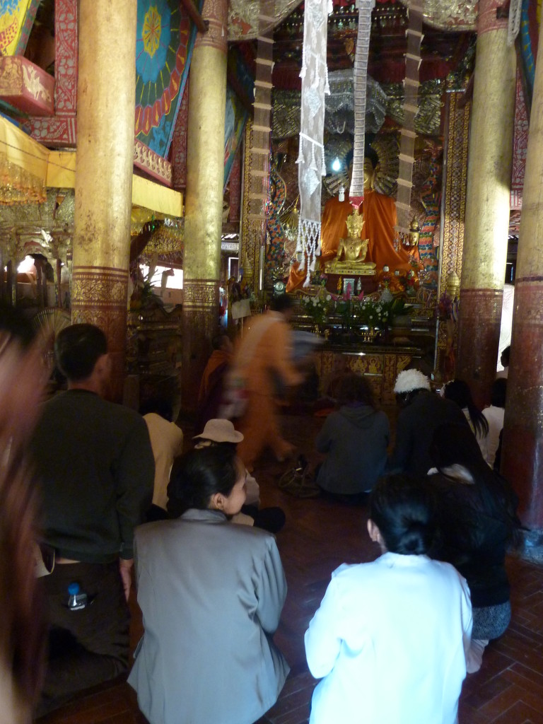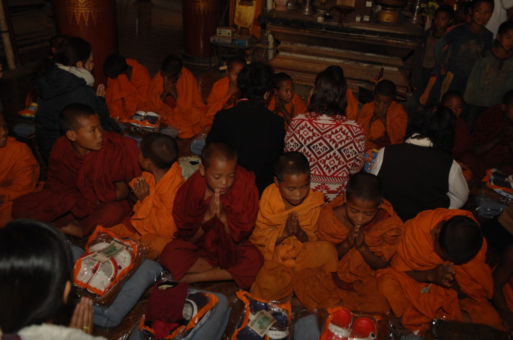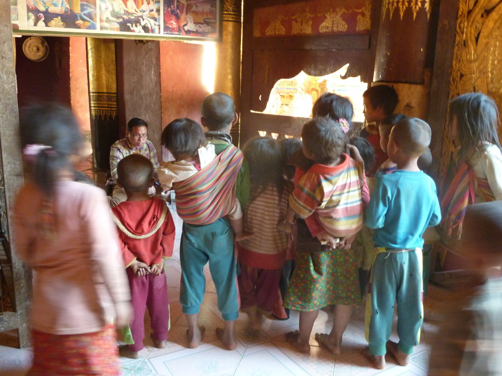 Auf dem Boden haben die weißgewandeten Pilger bereits Stellung bezogen. Dieses Mal sollen die jungen Novizen reich beschenkt werden. In zwei Reihen sitzen sich die jungen Mönche und die Spender aus dem Nachbarland gegenüber. Die Leiterin der Gruppe zückt die Videokamera und auf Kommando werden synchron die Geschenke überreicht, unter anderem Wollmützen und Plastik-Clogs. Letztere ein paar Nummern größer als nötig, zum Reinwachsen geeignet. Auch für das leibliche Wohl ist gedacht. Aus einer großen Kühlbox werden Beutelchen mit einer scharfen, mit viel Zitronengras gewürzten Wurst und scharfe Chilisoße sowie in Bananenblättern gegarter Klebreis verteilt. Richtig geraten: wir dürfen uns diesem gemeinsamen Essen natürlich ebenfalls nicht entziehen.
