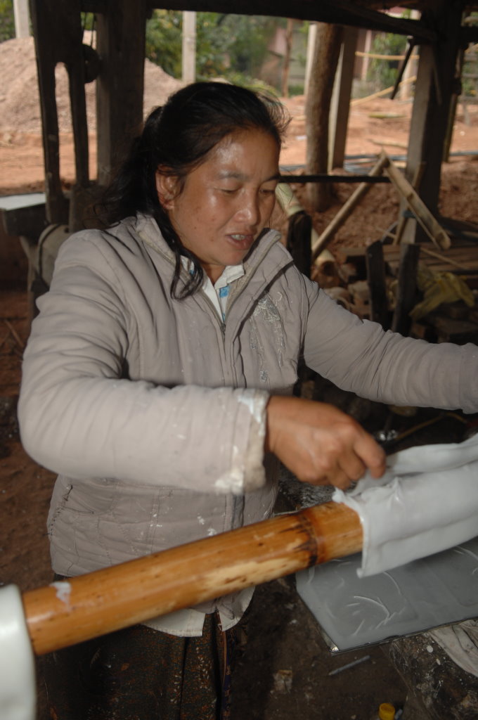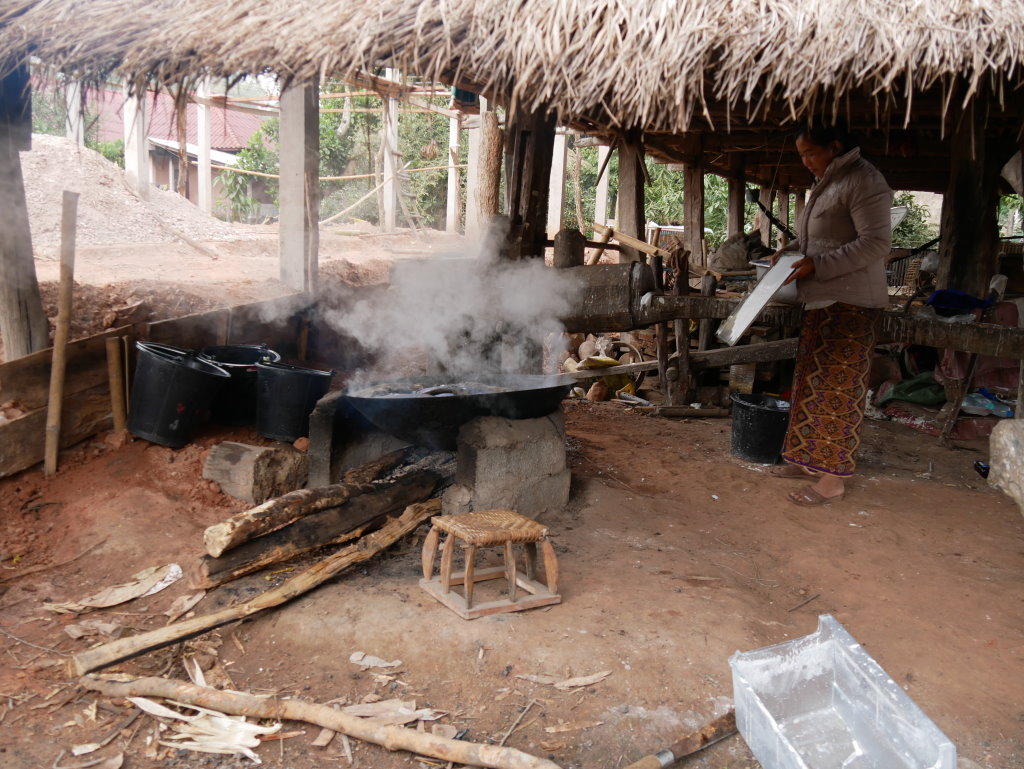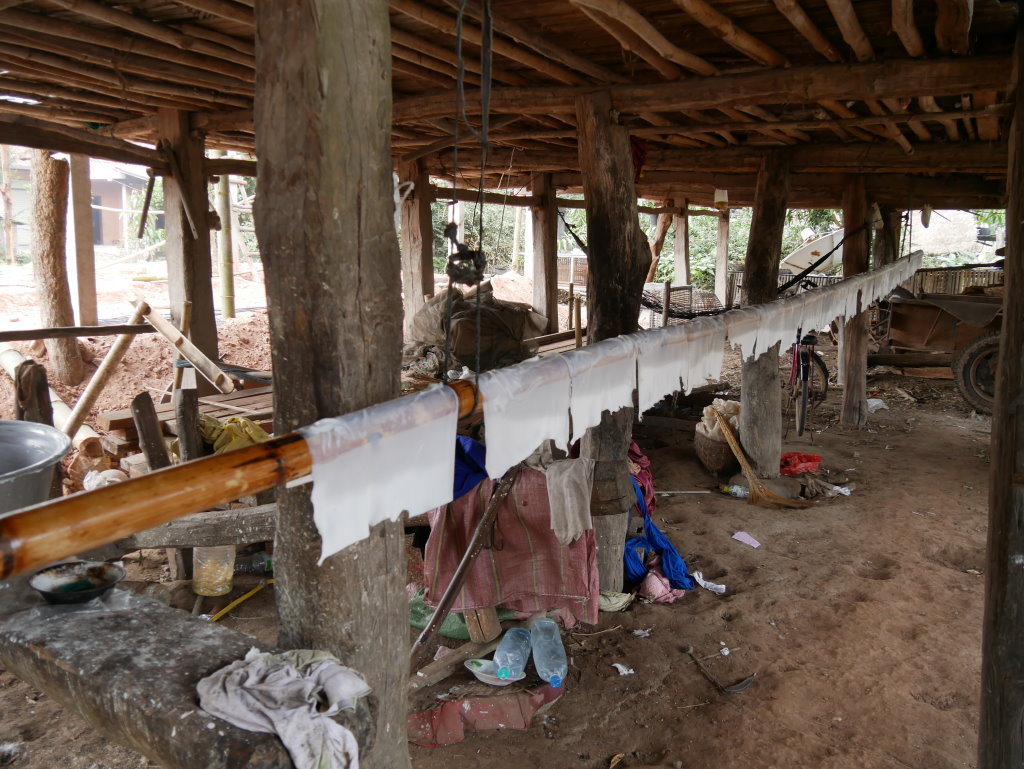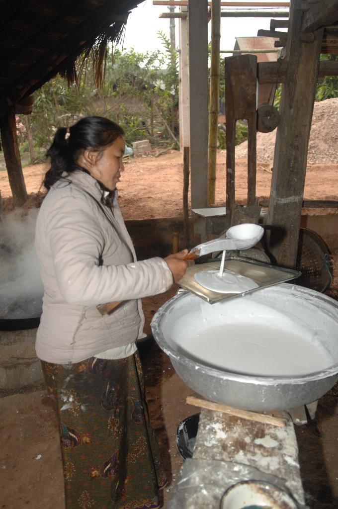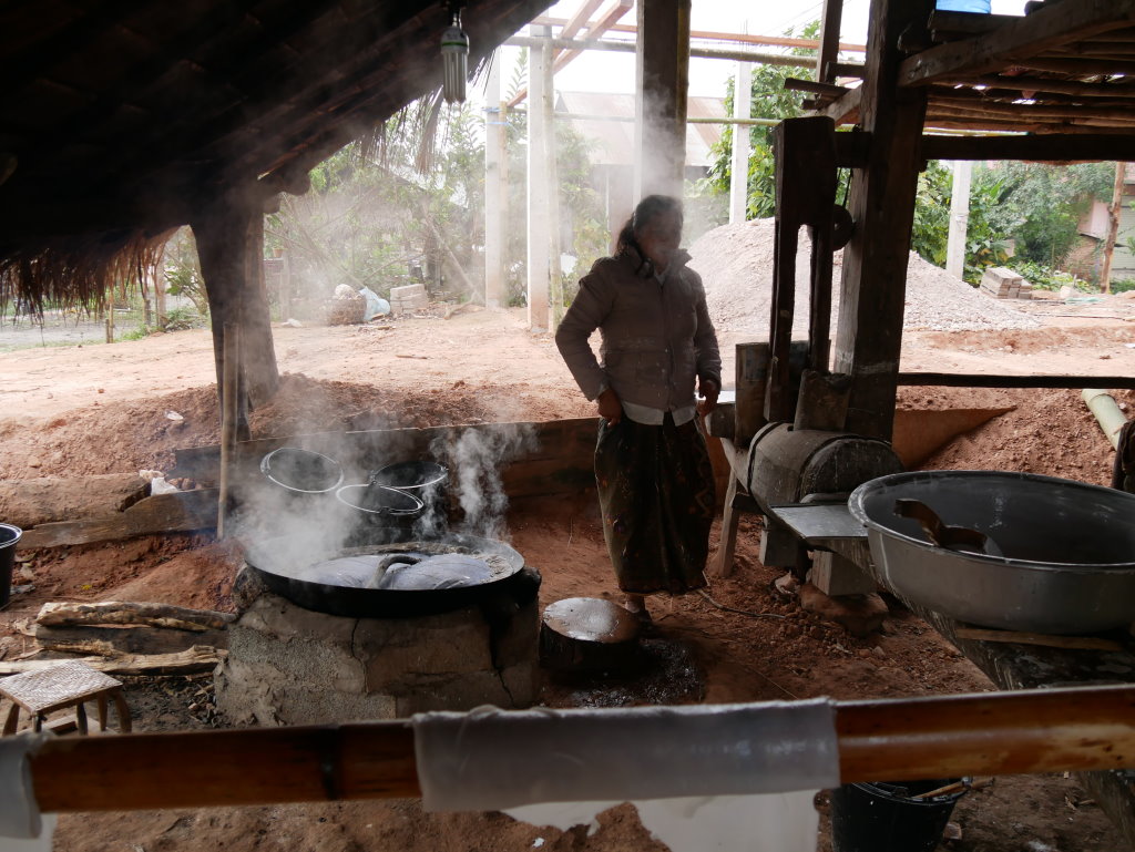 Nach dem Frühstück holt uns Thong Khao mit seinem Fahrer ab und wir rumpeln auf einer holprigen Schotterpiste aus der Stadt. Diesmal haben wir einen Mini-Van ganz für uns allein. Kurz hinter der südwestlichen Stadtgrenze halten wir zum ersten Mal. Im Dorf Silisuang leben die Thai Lư̄. Es ist vor allem für seine Nudelmacher bekannt. Aus unerfindlichen Gründen haben die meisten jedoch am heutigen Mittwoch einen Ruhetag eingelegt, der Nudel-Wok dampft heute nur in einer kleinen Manufaktur am Ortsrand.