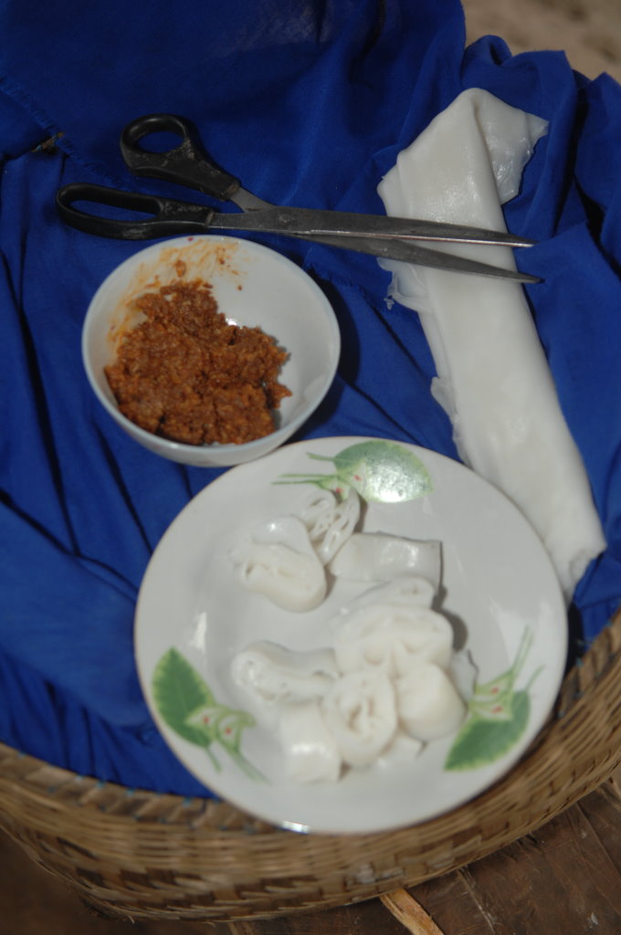 Der Teig aus Wasser und Reismehl wird auf einem rechteckigen Blech verteilt und dann im zum Dampfgarer umfunktionierten Wok gedämpft. Die fertige Nudelplatte kann man am besten mit einer großen Lasagne-Nudel vergleichen. Zum Abkühlen wird sie über einen Balken gehängt oder auf Bambusrosten in der Sonne getrocknet. Mit einer Schere in Streifen geschnitten kann sie kalt oder warm mit einer mehr oder weniger scharfen Chili-Paste verkostet werden.
