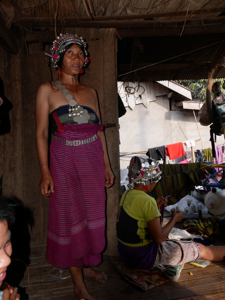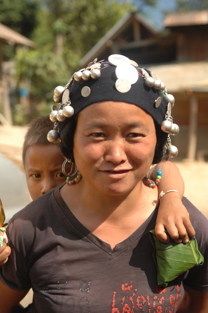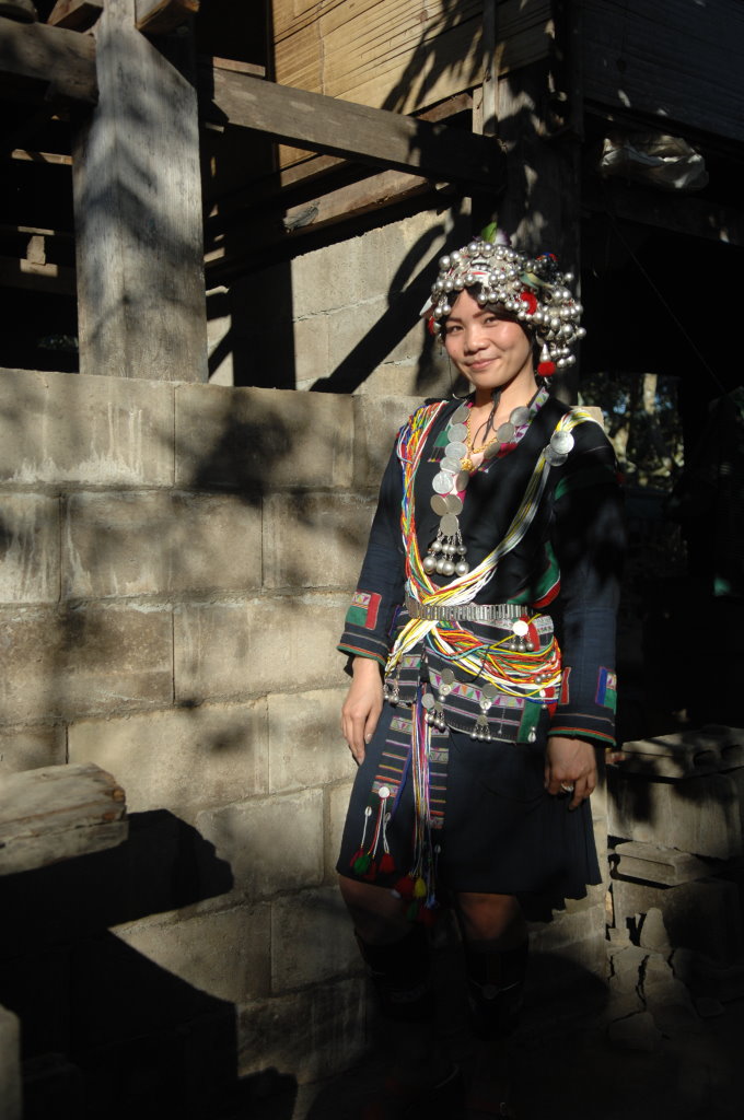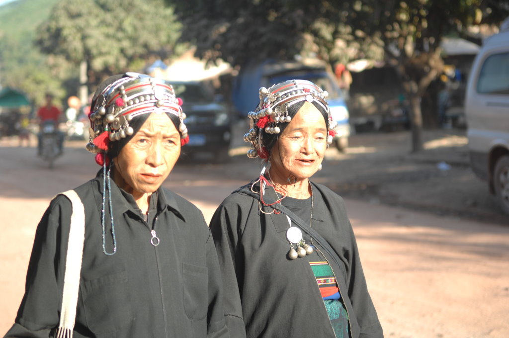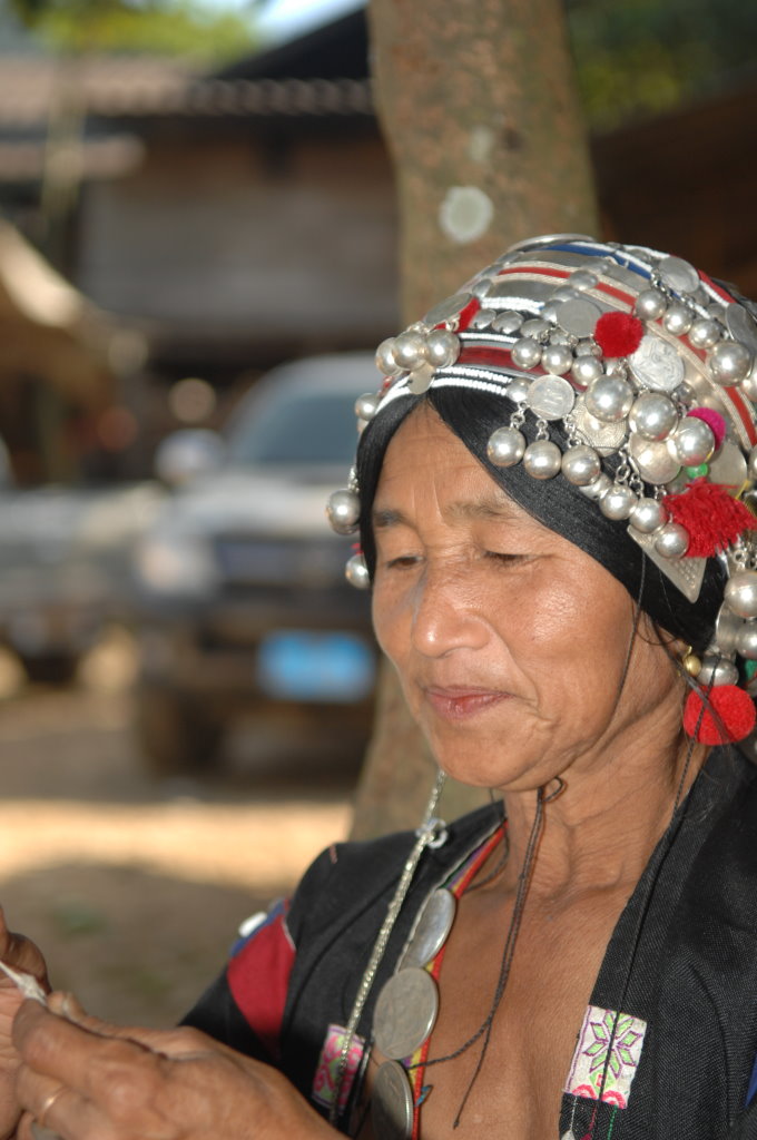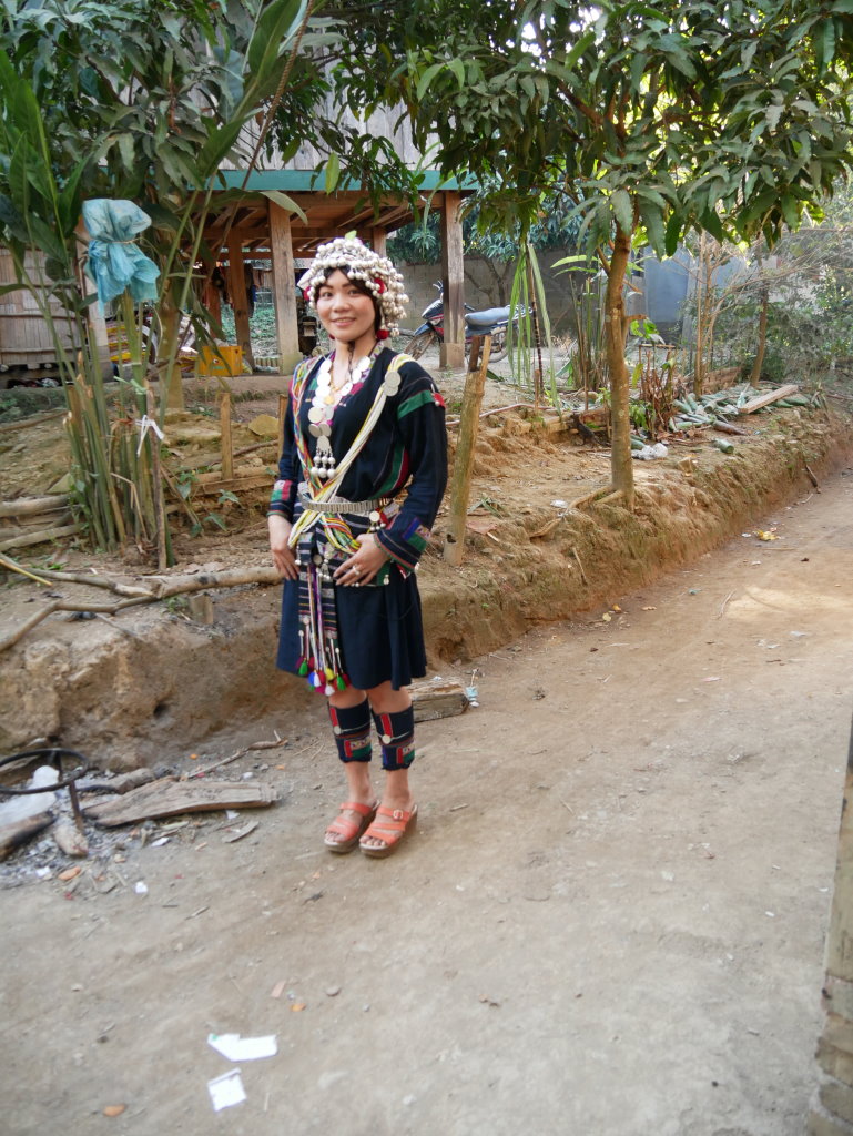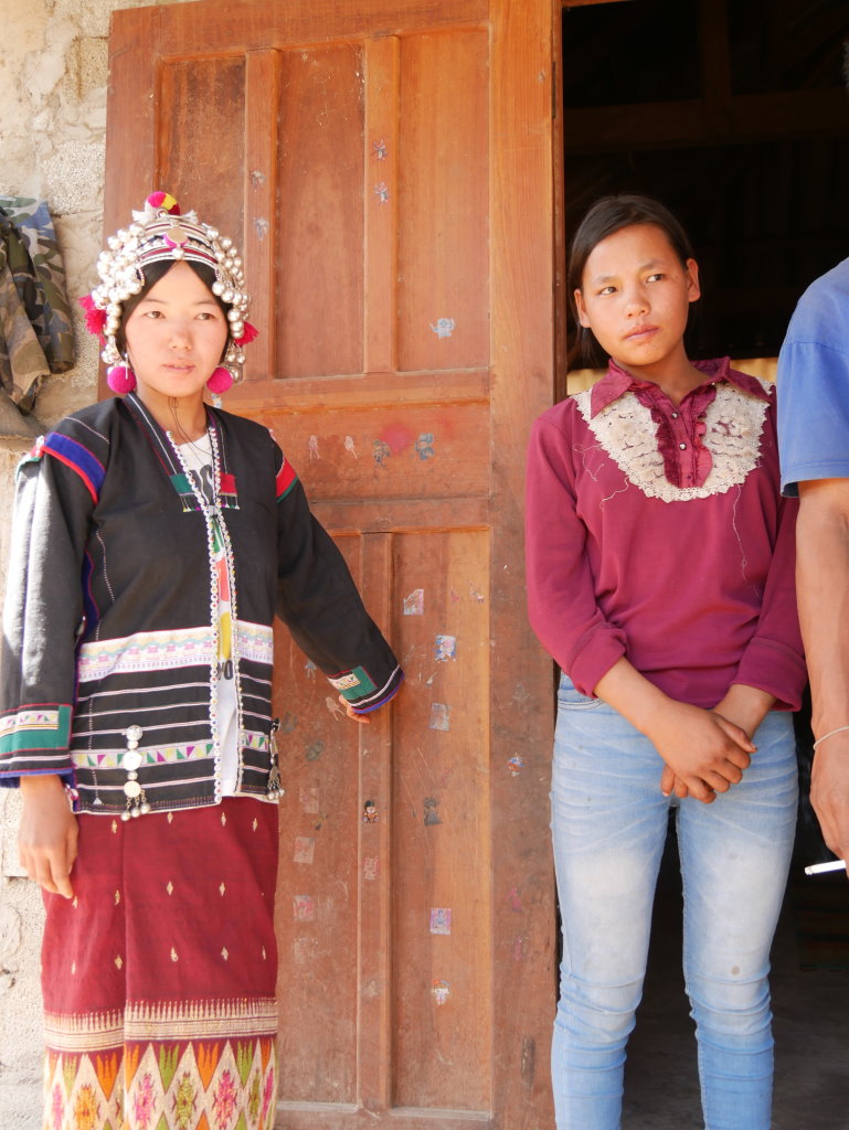 Auf halber Strecke erreichen wir das Dorf Cha Oub der Akha Jejor. Am diesem späten Vormittag ist nicht viel los. Wohl auch deshalb, weil gestern hier das traditionelle Neujahrsfest der Akha gefeiert wurde. Die einen Tag dauernden Feierlichkeiten sind an kein festes Datum gebunden. Jedes Dorf hat seinen eigenen Termin innerhalb des Neujahrsmonats. Viele Akha-Frauen tragen nicht mehr die typische Tracht. Den mit Silberschmuck verzierten Kopfschmuck haben allerdings viele angelegt. Traditionell scheint auch das eine oder andere bei der Ernährung geprägt zu sein. In einem kleinen Laden an der Hauptstraße liefert ein junger Mann seine Jagdbeute ab: zwei Affen, die er offensichtlich in einer Falle gefangen hat.