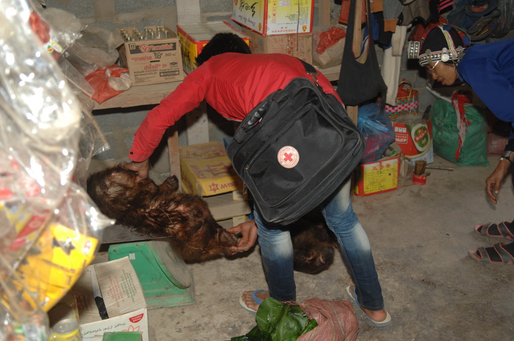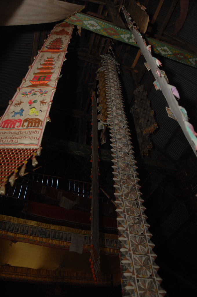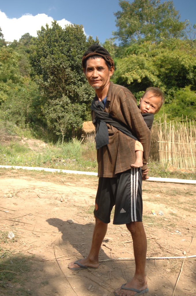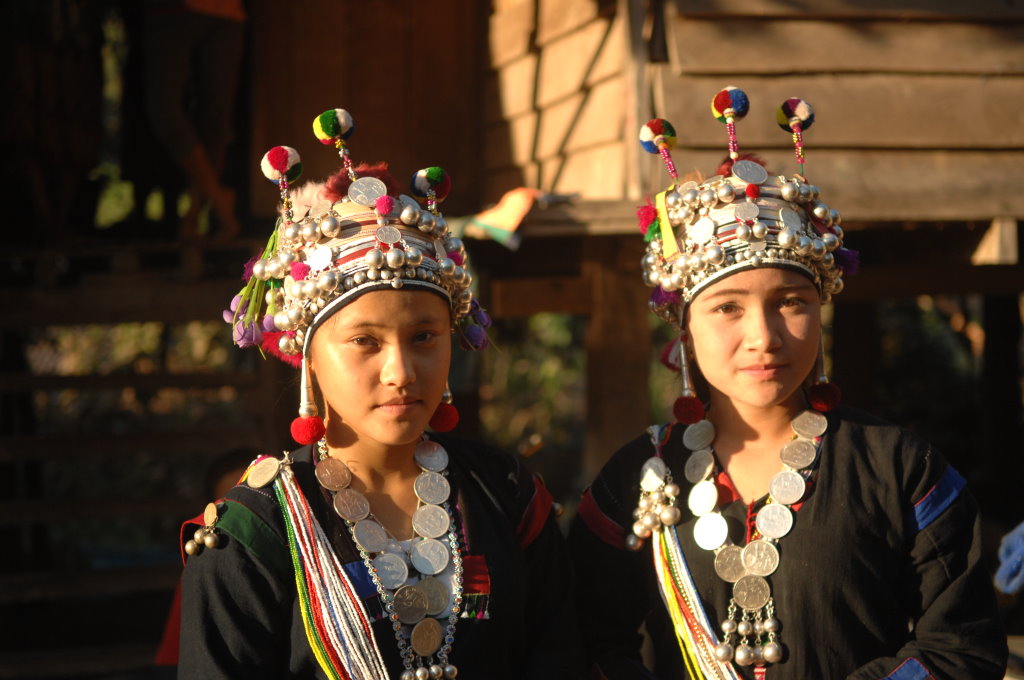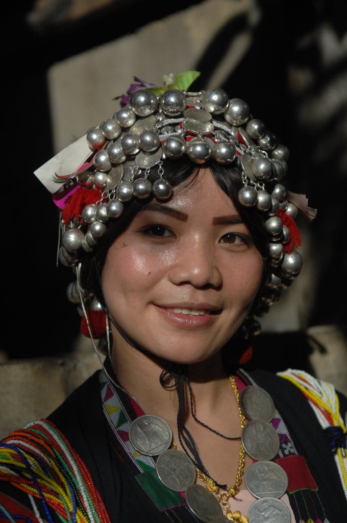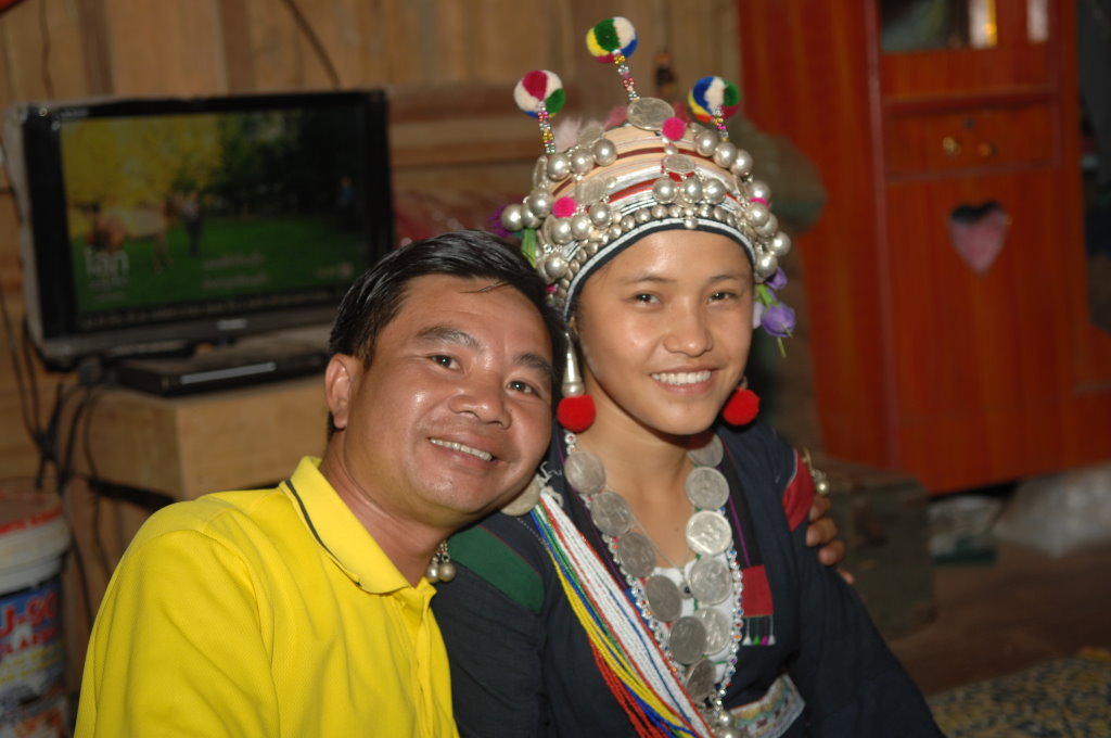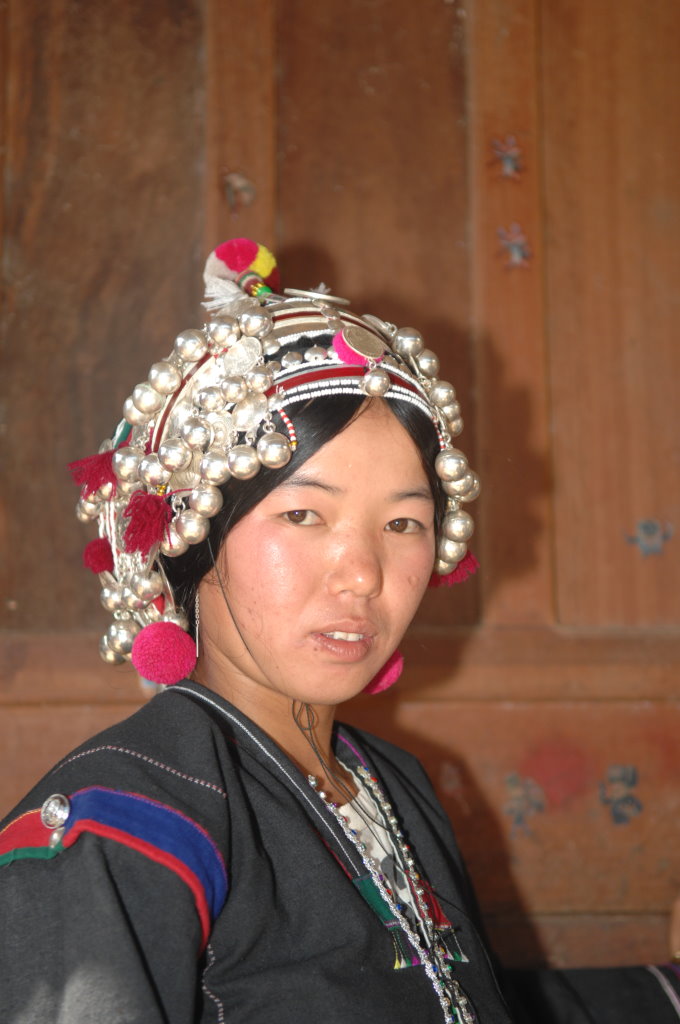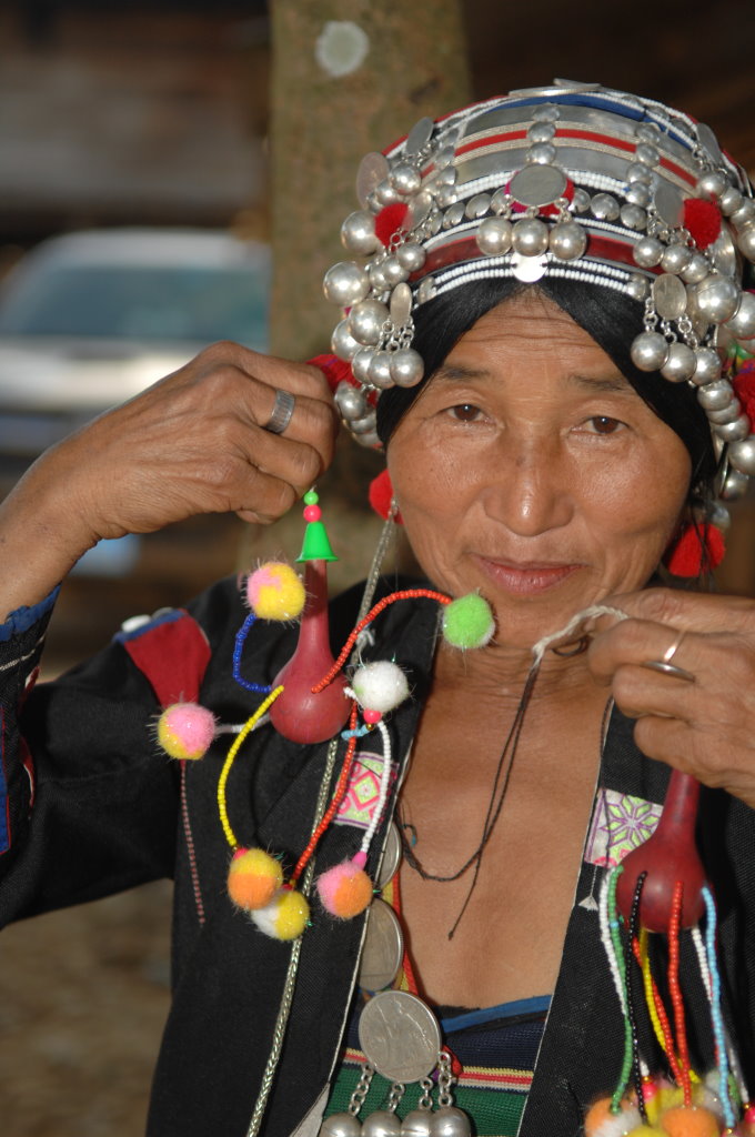 Auf halber Strecke erreichen wir das Dorf Cha Oub der Akha Jejor. Am diesem späten Vormittag ist nicht viel los. Wohl auch deshalb, weil gestern hier das traditionelle Neujahrsfest der Akha gefeiert wurde. Die einen Tag dauernden Feierlichkeiten sind an kein festes Datum gebunden. Jedes Dorf hat seinen eigenen Termin innerhalb des Neujahrsmonats. Viele Akha-Frauen tragen nicht mehr die typische Tracht. Den mit Silberschmuck verzierten Kopfschmuck haben allerdings viele angelegt. Traditionell scheint auch das eine oder andere bei der Ernährung geprägt zu sein. In einem kleinen Laden an der Hauptstraße liefert ein junger Mann seine Jagdbeute ab: zwei Affen, die er offensichtlich in einer Falle gefangen hat.