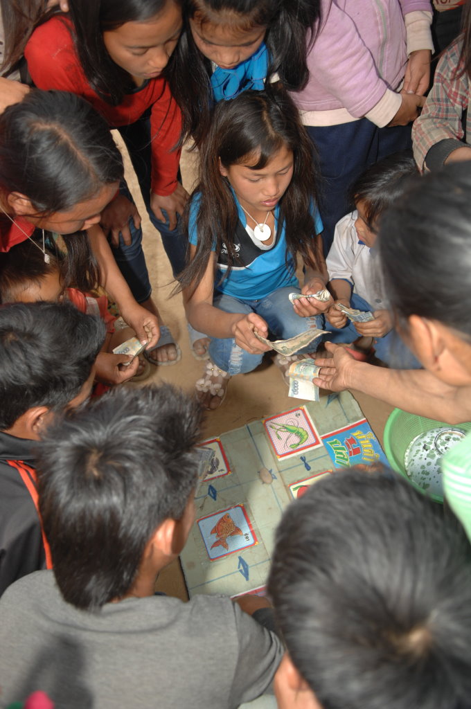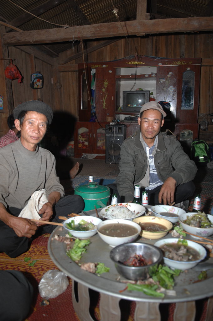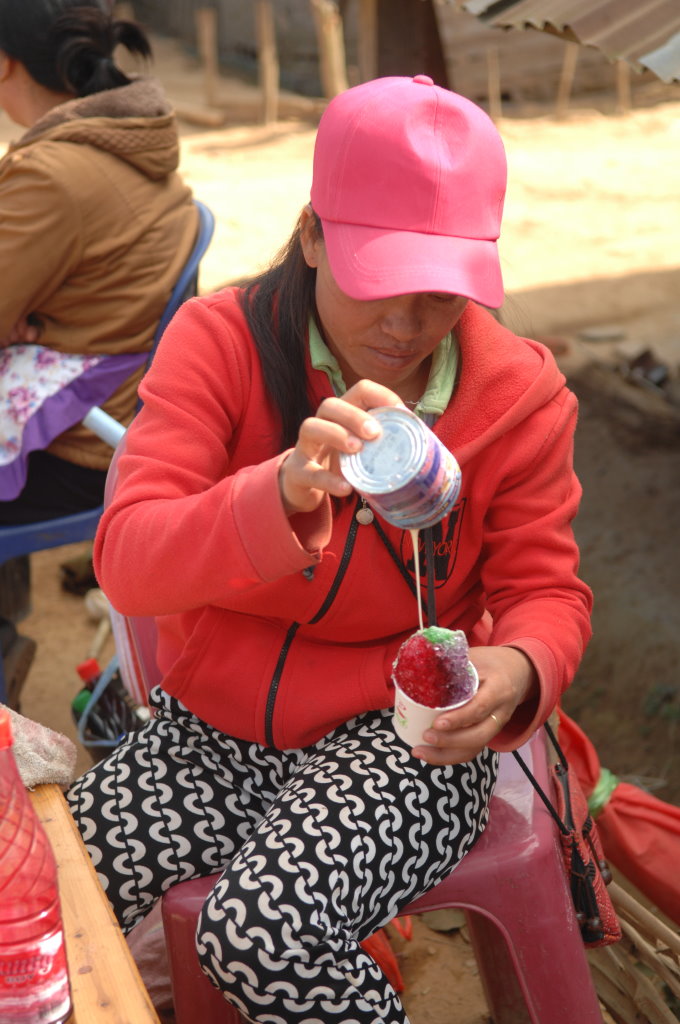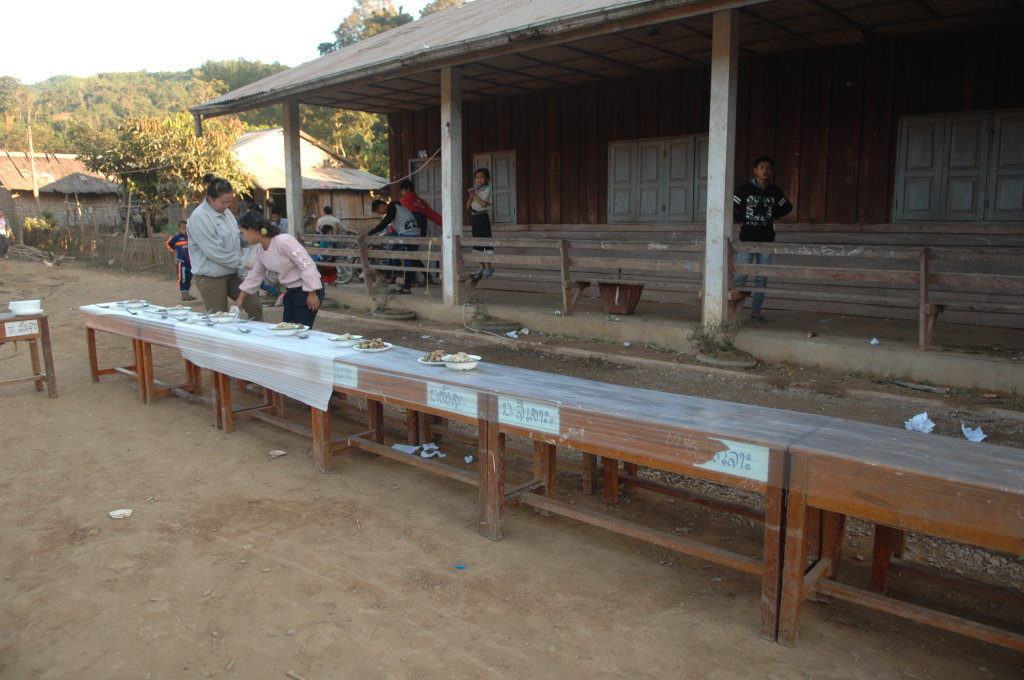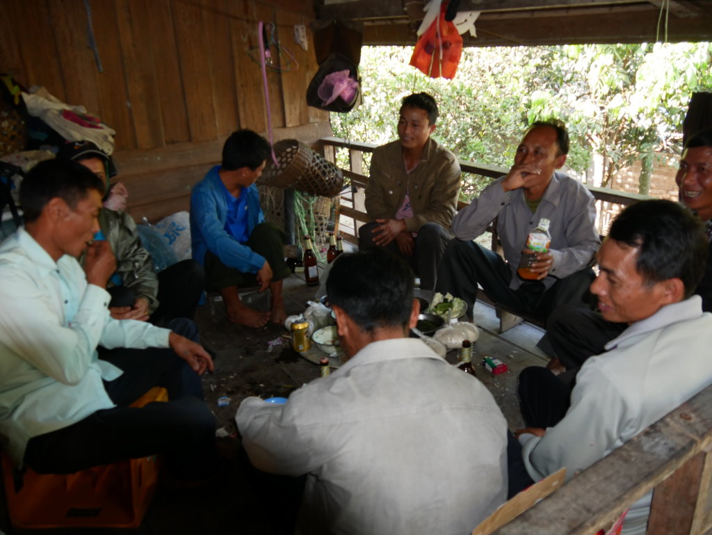 Auch der nächste Ort wird von Akha bewohnt. Im Dorf Santhao leben die Akha Phuli – unterscheidbar von ihren Nachbarn im Dorf zuvor am unterschiedlich aufgebauten Kopfputz. In der Schule ist gerade große Pause. Während die Kleinen sich bei der Eisfrau einen Becher mit Sirup auf zerstoßenem Eis kaufen, haben sich die Großen zum Würfelspiel versammelt. Der Einsatz sind 1000 kip (10 Cent) – so viel wie auch das Eis kostet. Auf uns wartet bei einem Freund des Fahrers ein kleiner Imbiss. Es gibt typisch nordlaotische Currys mit Fisch und Gemüse, dazu chinesisches Bier, Tee und natürlich den unvermeidlichen selbstgebrannten Schnaps Lao Lao. Diese Kombination wird uns heute noch öfter begegnen.