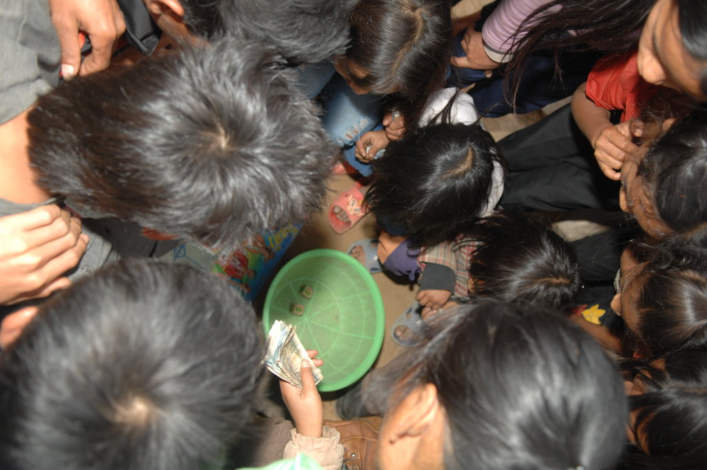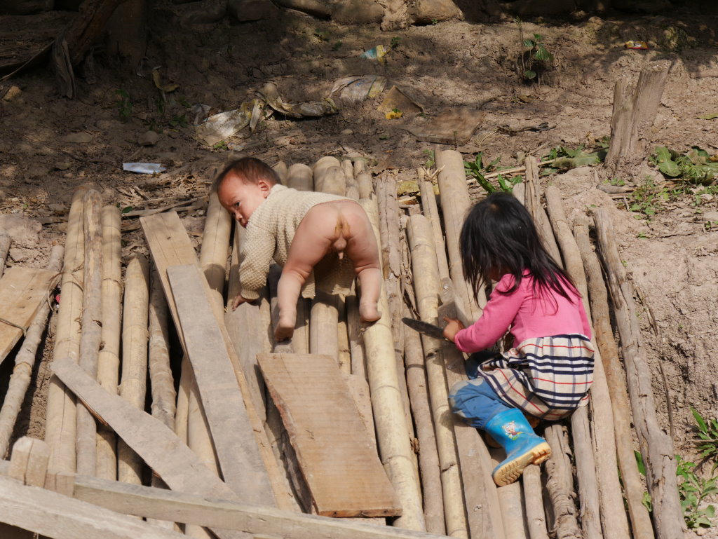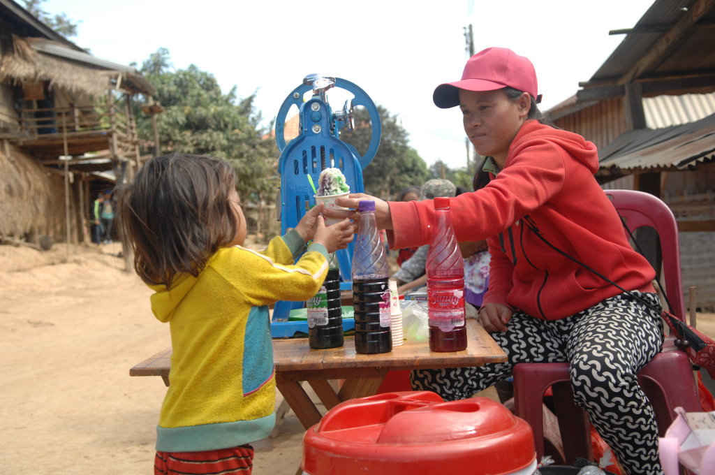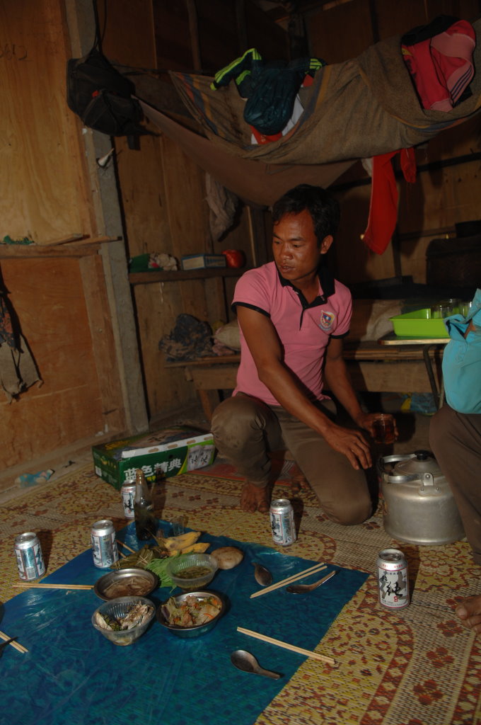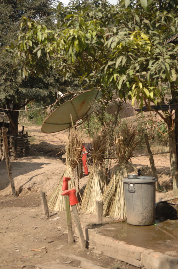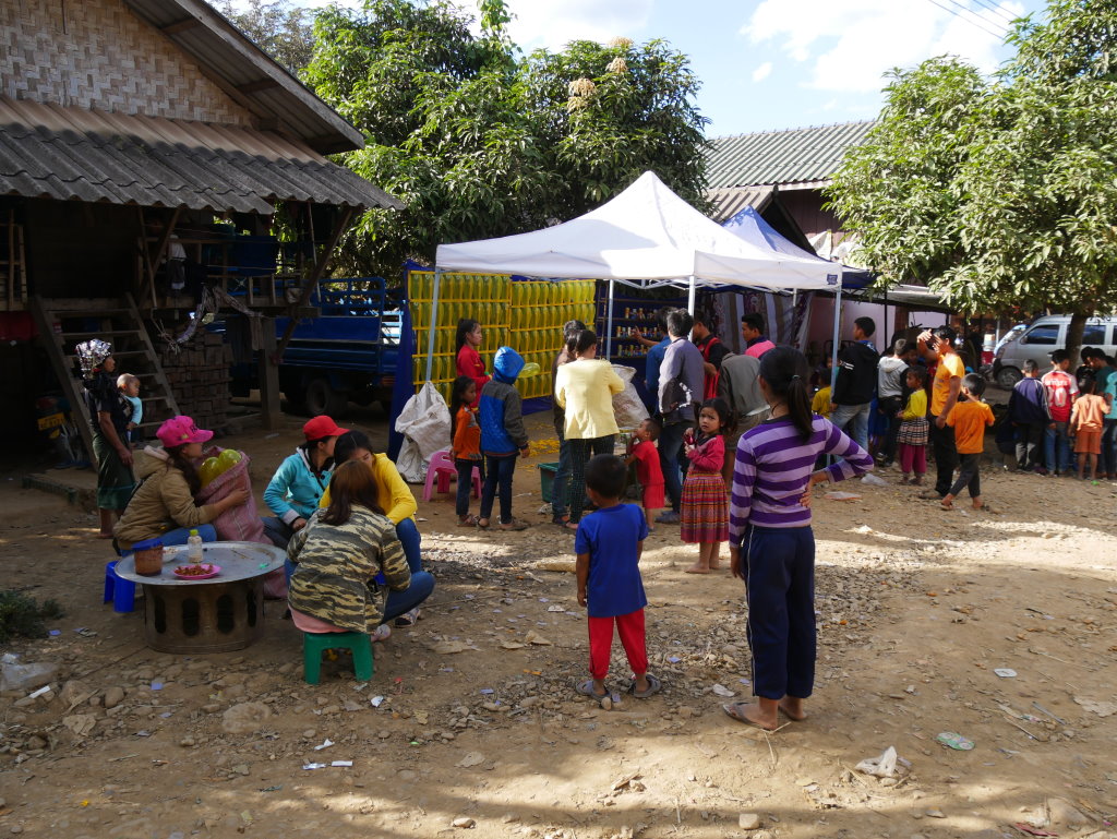 Auch der nächste Ort wird von Akha bewohnt. Im Dorf Santhao leben die Akha Phuli – unterscheidbar von ihren Nachbarn im Dorf zuvor am unterschiedlich aufgebauten Kopfputz. In der Schule ist gerade große Pause. Während die Kleinen sich bei der Eisfrau einen Becher mit Sirup auf zerstoßenem Eis kaufen, haben sich die Großen zum Würfelspiel versammelt. Der Einsatz sind 1000 kip (10 Cent) – so viel wie auch das Eis kostet. Auf uns wartet bei einem Freund des Fahrers ein kleiner Imbiss. Es gibt typisch nordlaotische Currys mit Fisch und Gemüse, dazu chinesisches Bier, Tee und natürlich den unvermeidlichen selbstgebrannten Schnaps Lao Lao. Diese Kombination wird uns heute noch öfter begegnen.