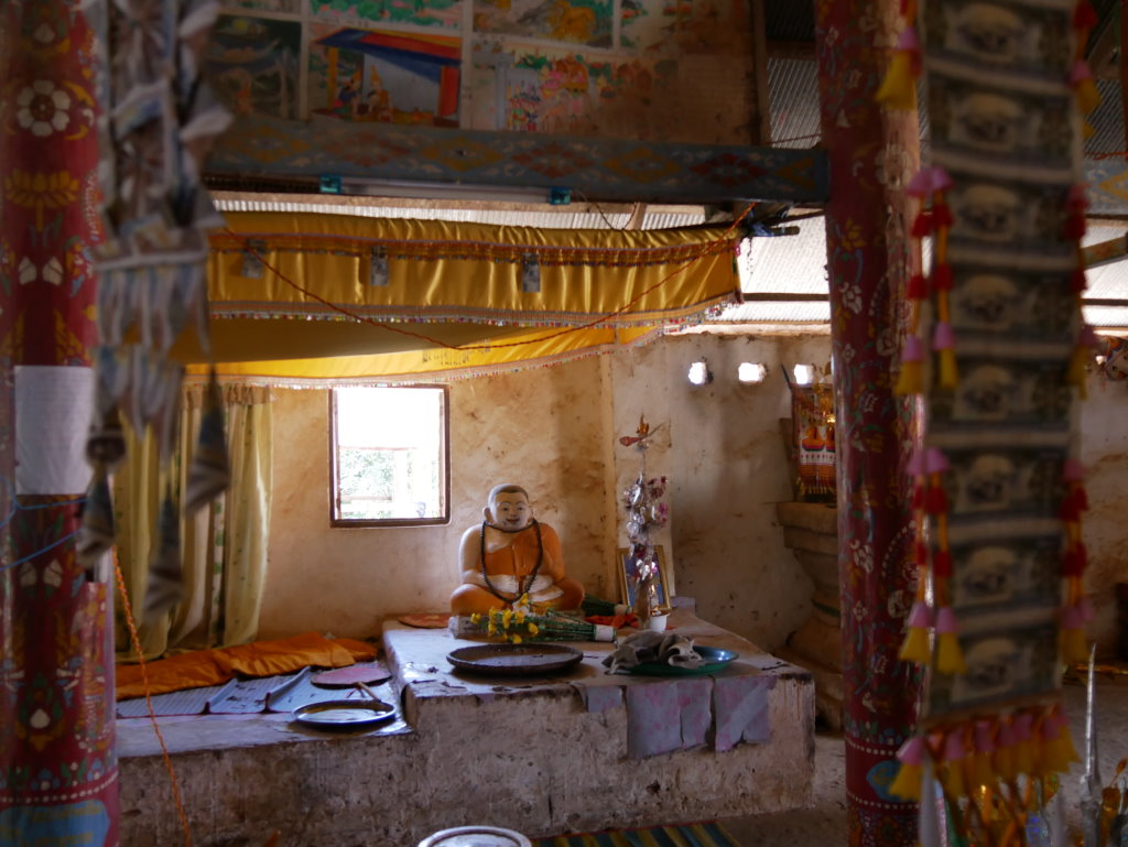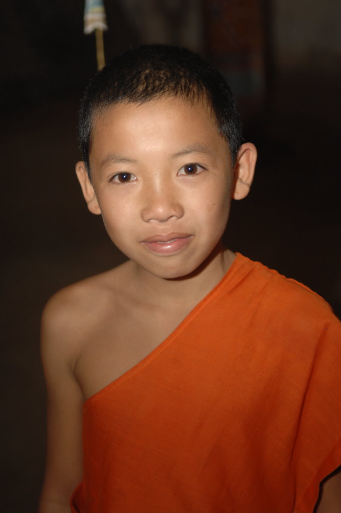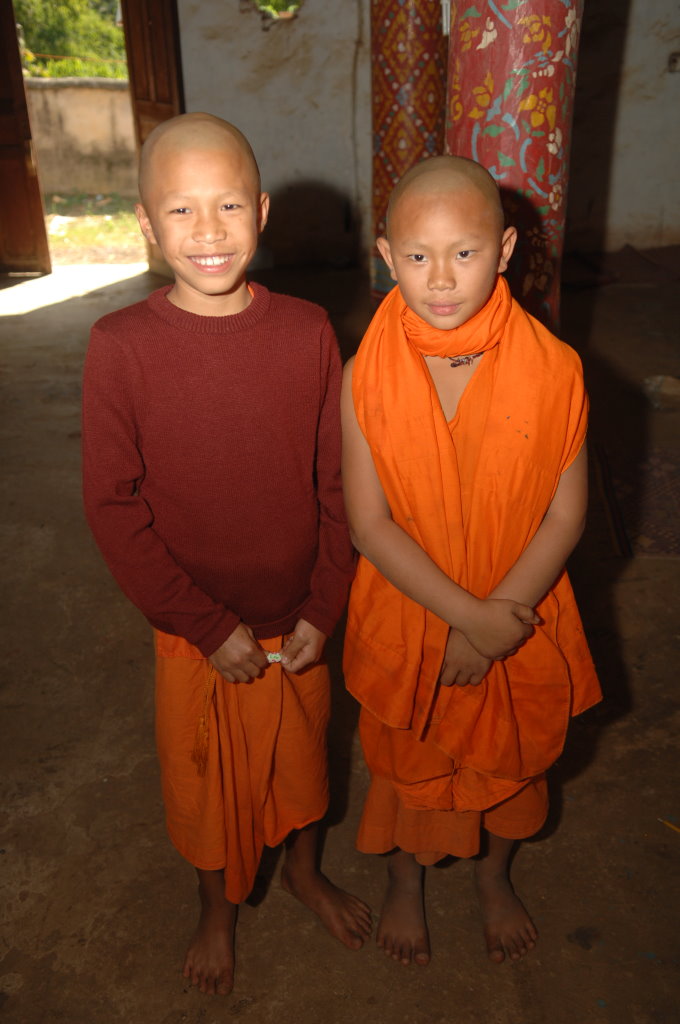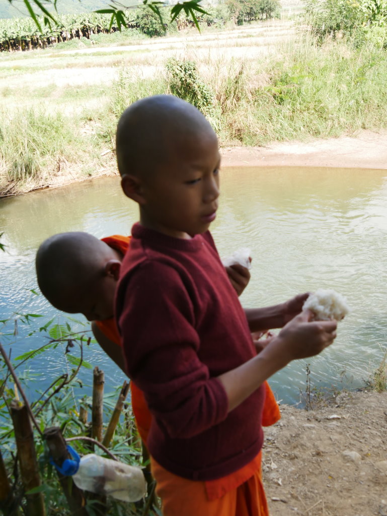 Einige Kilometer weiter befindet sich ein Dorf der Thai Lư̄ mit einem Kloster an der Hauptstraße. Drei zunächst ziemlich kamerascheue junge Novizen führen uns zu einer Böschung am Fluss. Zuvor hatten sie sich in der Klosterküche eine Handvoll Klebreis besorgt, mit dem sie nun die Fische füttern.