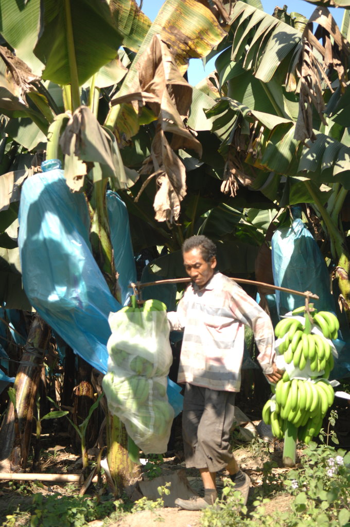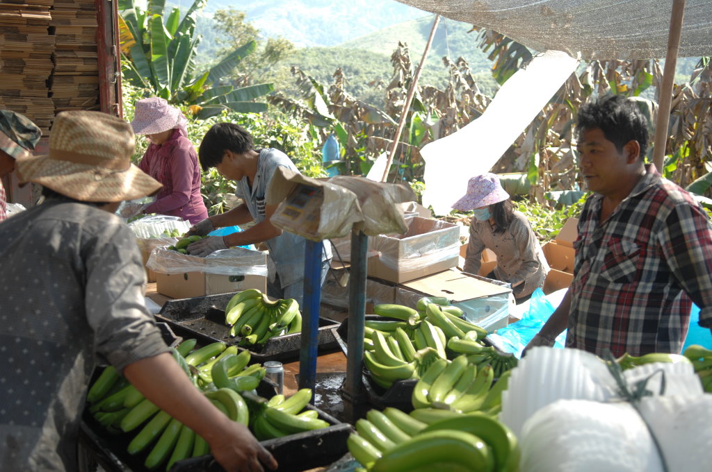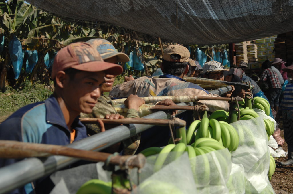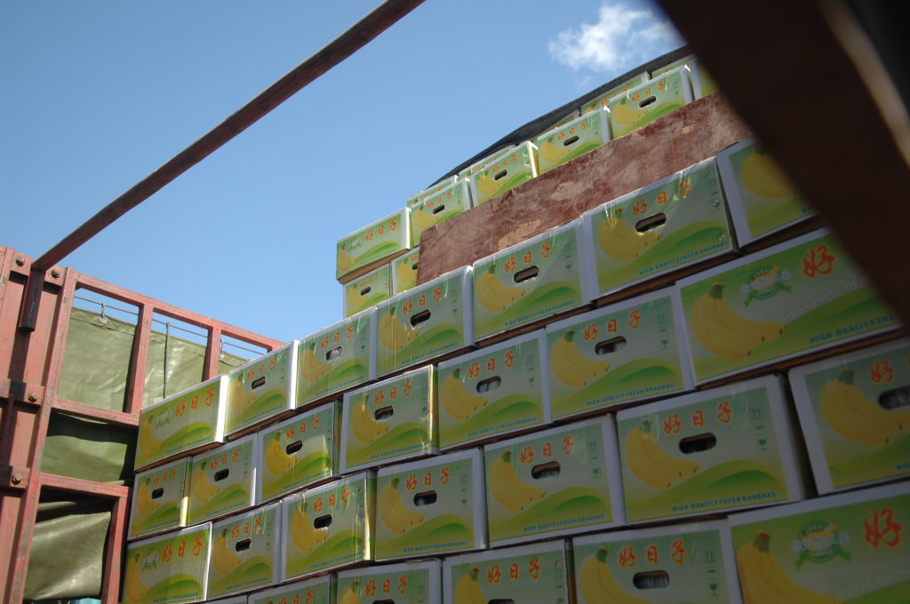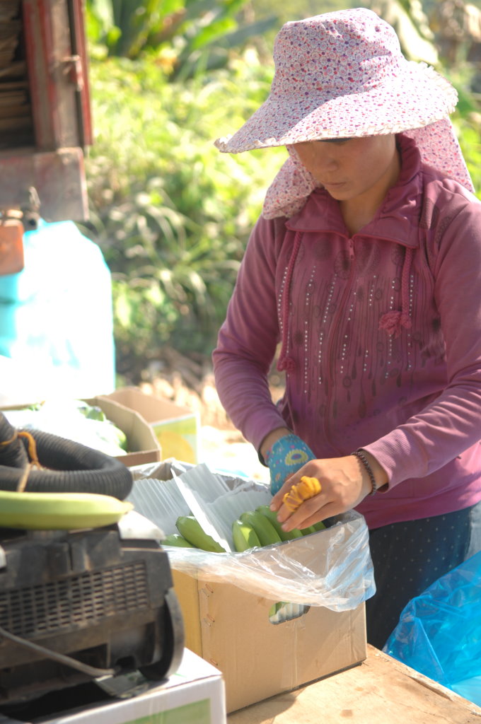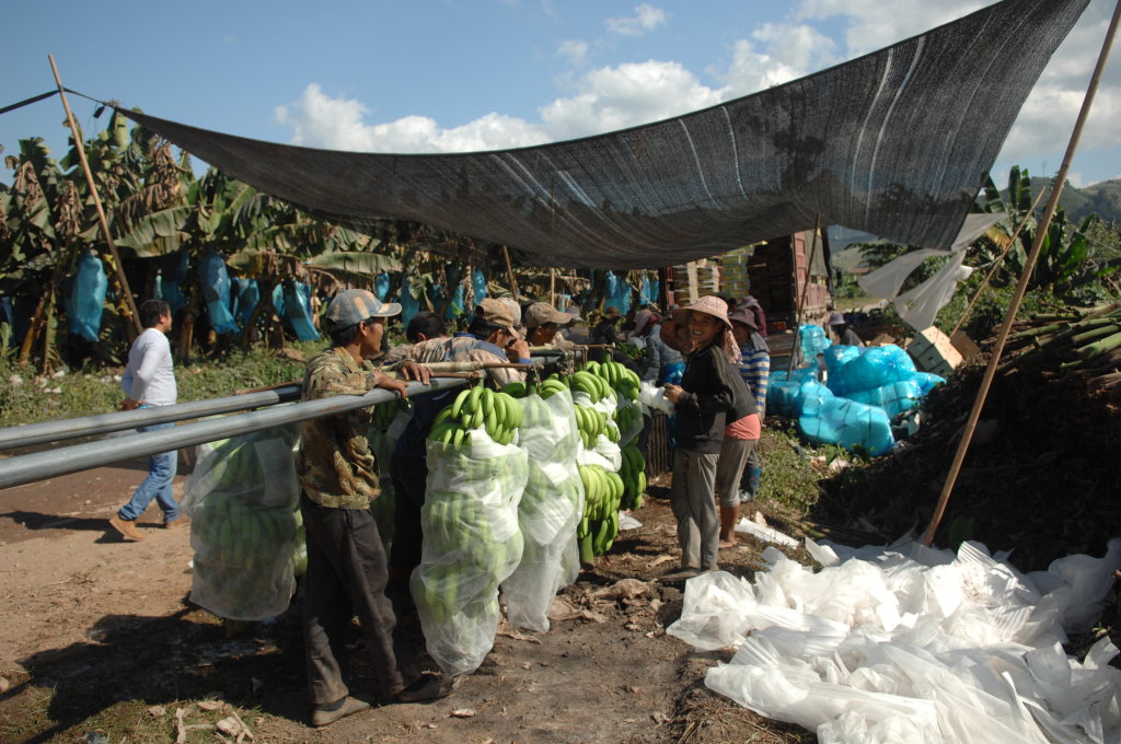 Weiter geht die Fahrt durch endlose Bananen-Plantagen, die fast ausschließlich von Chinesen betrieben werden. Nach der Blüte werden die sich nun entwickelnden Stauden in Plastiksäcke gehüllt, um die Früchte möglichst unbeschädigt ernten zu können. Die Bananen werden noch grün geerntet und vor Ort gewaschen, abgewogen und in Kisten verpackt. Dann geht es mit dem LKW direkt nach China und von dort in alle Welt.