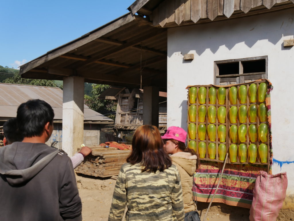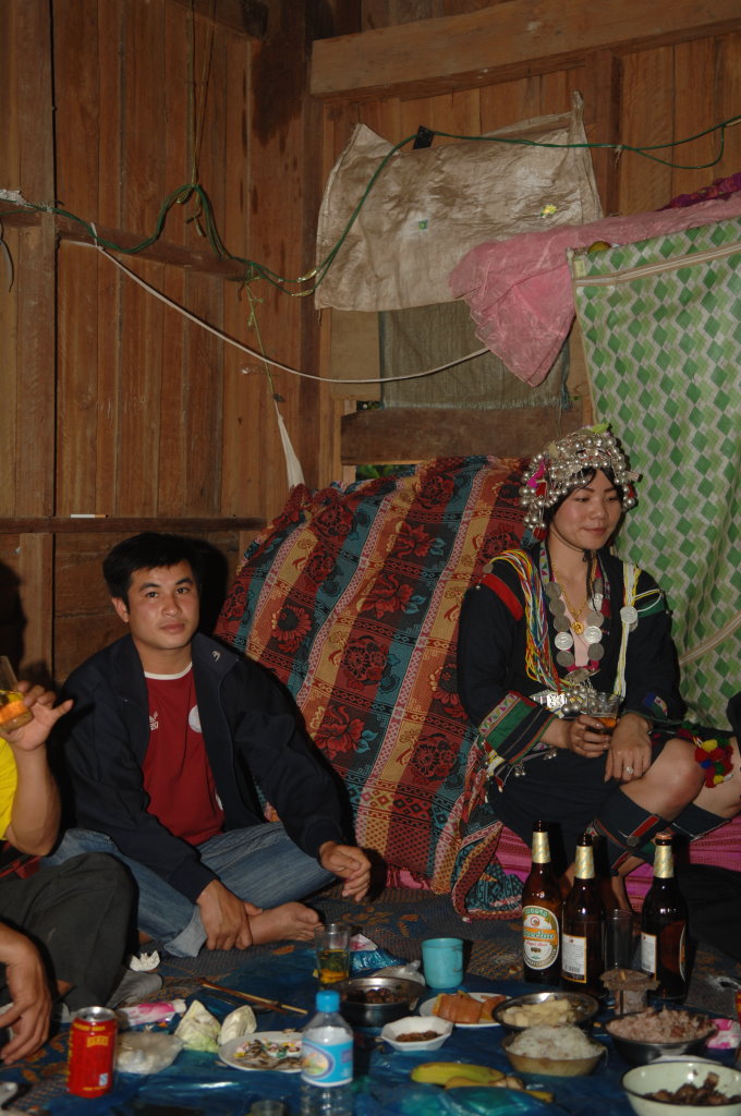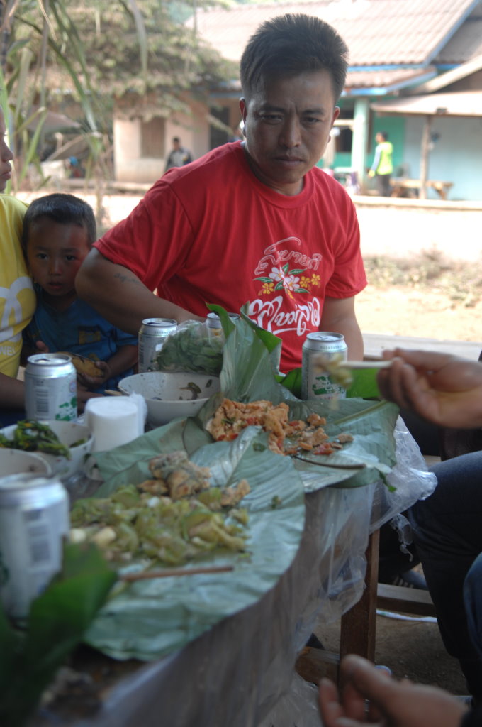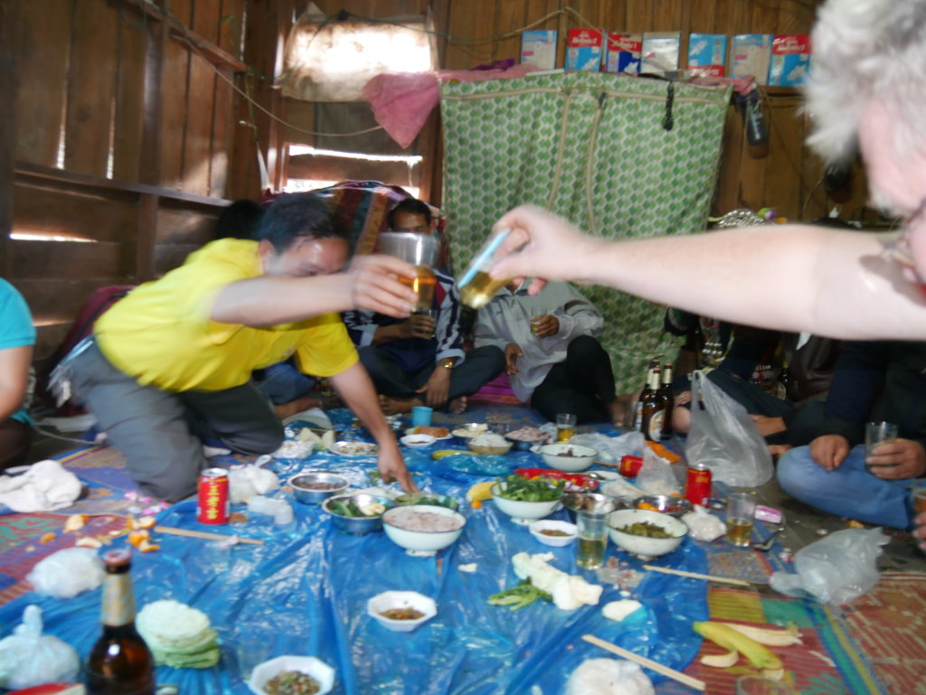 Gegen 14 Uhr erreichen wir ein weiteres Akha-Dorf. Hier in Jarkhamping wird heute das Neujahrsfest gefeiert. Wie das geht, das können wir jetzt hautnah miterleben. Wir sind noch keine zwei Meter gegangen, da dürfen wir uns schon an einen Tisch zu einigen Jugendlichen setzen. Aus einer an ein Handy angeschlossenen überdimensionalen Box dröhnt laute Technomusik. Die uns bereits vom ersten Imbiss bekannten Currys werden von unserem Guide um weitere Gerichte erweitert. Er packt gebratenes Tofu, Gemüse und Omelette aus den mitgebrachten Bananenblätter-Päckchen. Dazu gibt es chinesisches Bier (Qing Dao Bai Ao Beer) und wieder irgendetwas Selbstgebranntes, diesmal nicht klar sondern honigfarben und in Gläsern mit Eiswürfeln serviert.