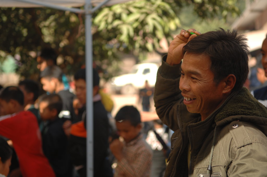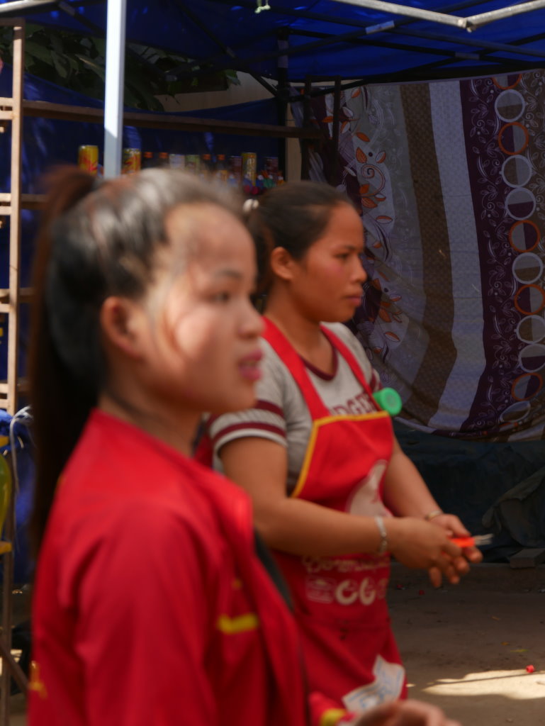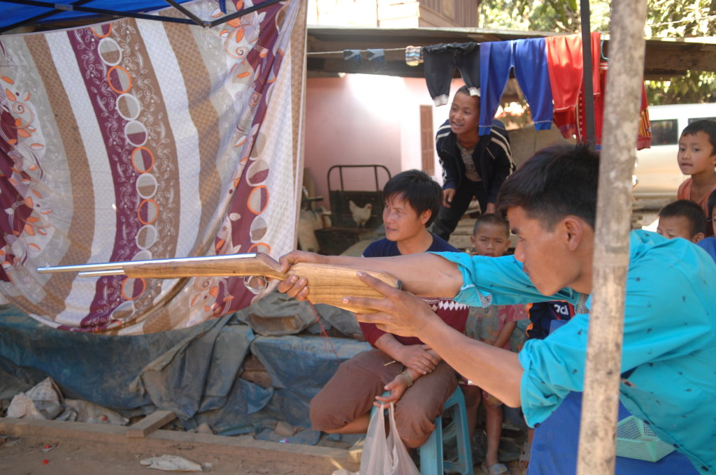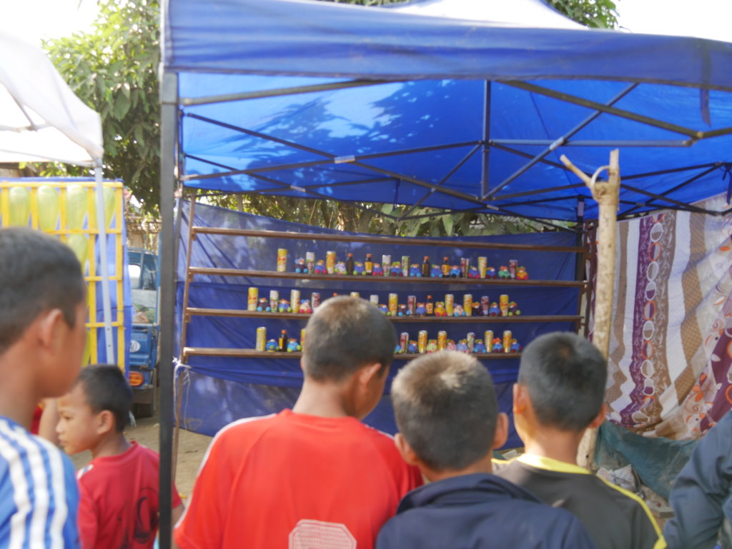 Im Dorf geht’s schon um diese Uhrzeit ziemlich rund. Zwei Schießbuden – wahlweise mit Darts oder Luftgewehr – werden besonders frequentiert. Allzu weit kommen wir nicht bei unserem kleinen Dorfrundgang, schon bald werden erneut zu Tisch geben. Dieses Spiel wiedeholt sich noch mehrmals und mit zunehmendem Alkoholpegel schwindet auch die Kamerascheu der Akha-Mädchen.