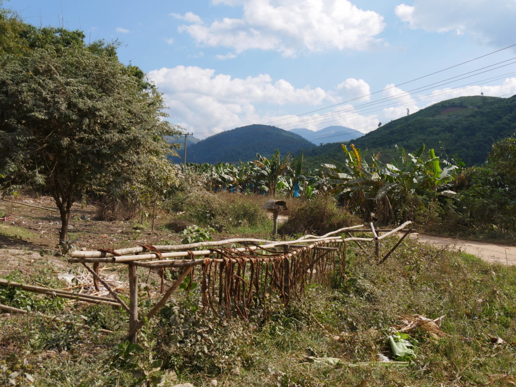 Weiter geht es auf der „Dancing Street“ 17 B entlang der nördlichen Grenze des Nam Ha Nationalparks. Von den ursprünglichen Urwald-Gebieten außerhalb der Schutzzone ist nicht viel geblieben. Vor allem Bananen-Plantagen und Zuckerrohrfelder säumen die Straße und erstrecken sich bis auf die entfernten Anhöhen, gelegentlich von einer Kautschuk-Plantage unterbrochen.