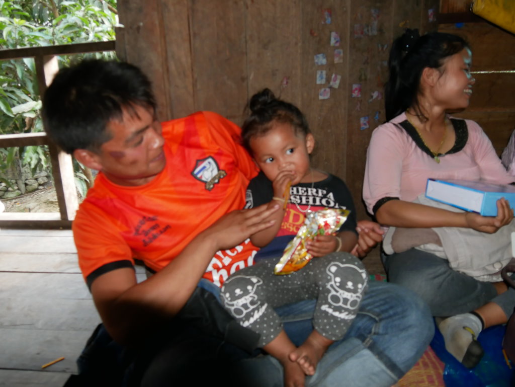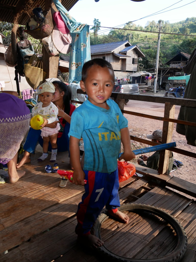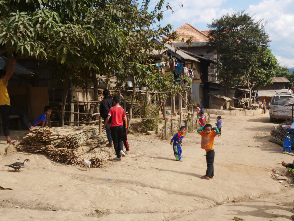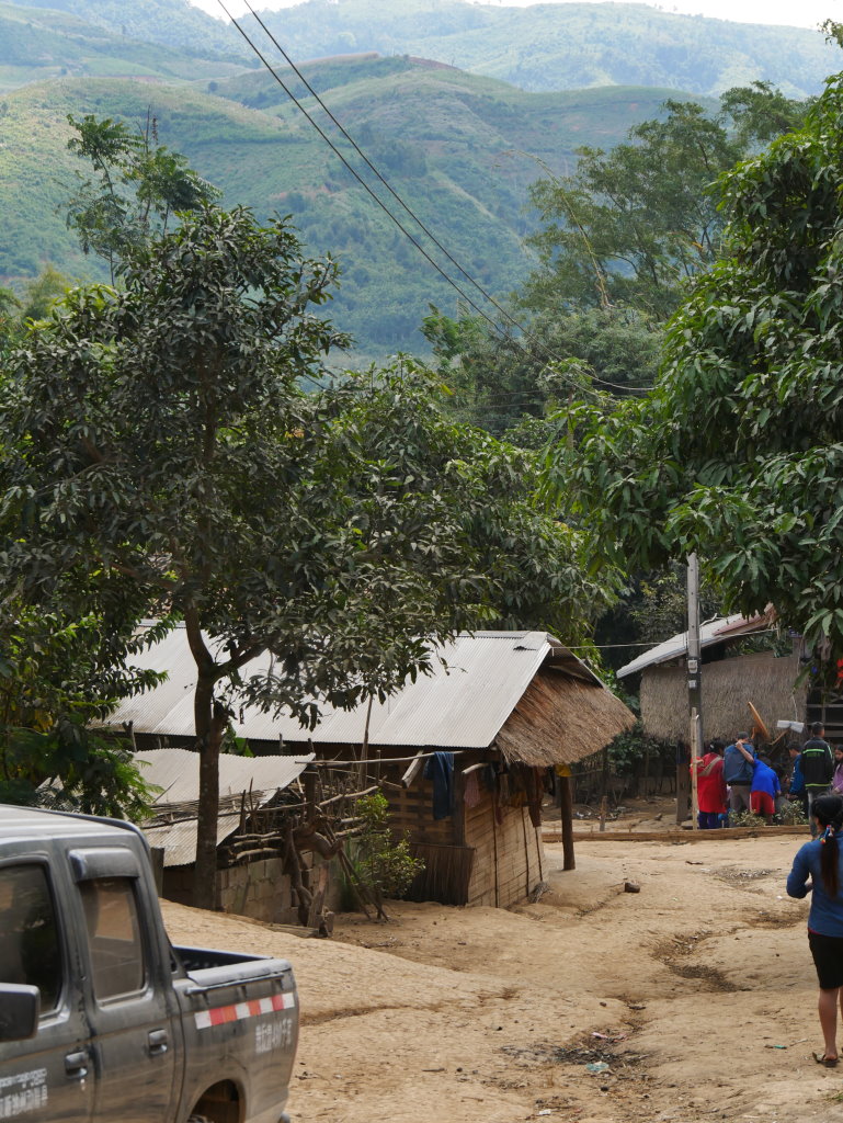 Der Direktor der örtlichen Schule hat uns zudem als Sprachtrainer für sein reichlich eingerostetes Englisch „entdeckt“ und zerrt uns nun ebenfalls von Hütte zu Hütte. Widerspruch zwecklos. Zum Glück insistiert schließlich unser Guide, da wir noch vor Sonnenuntergang das nur noch 10 Kilometer entfernte Muang Long erreichen müssen.