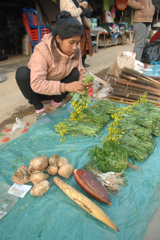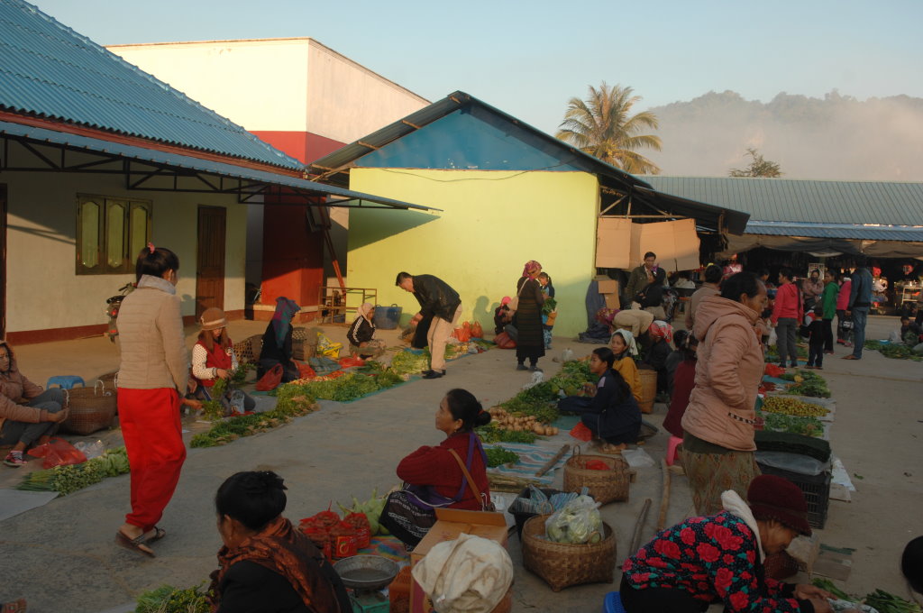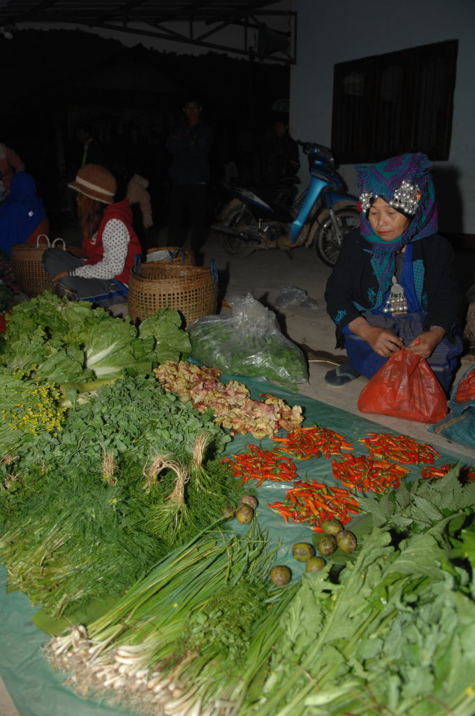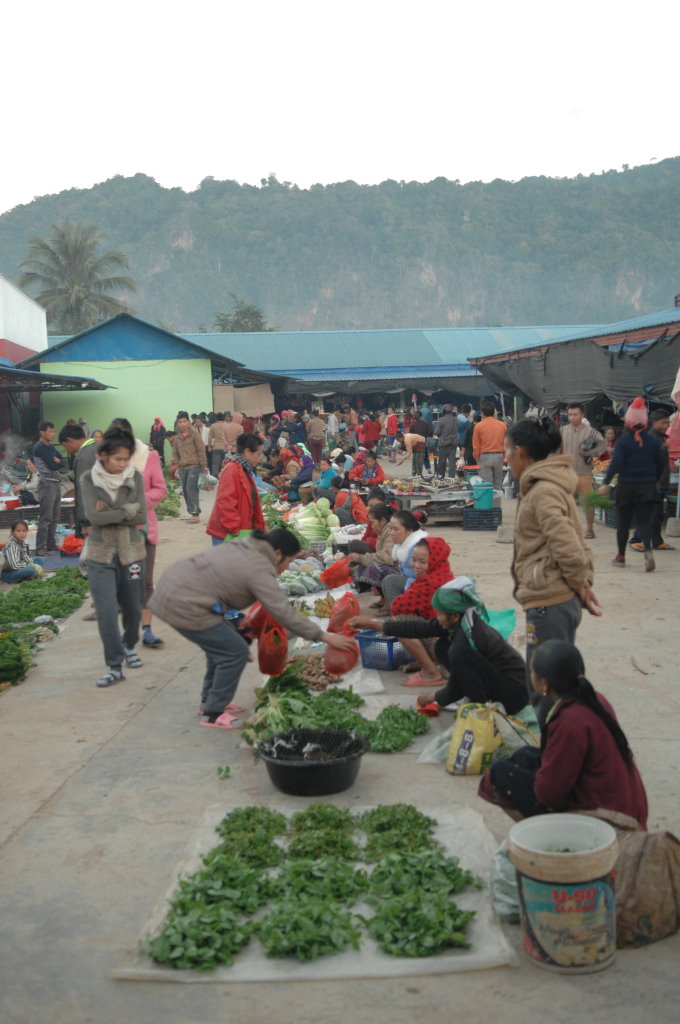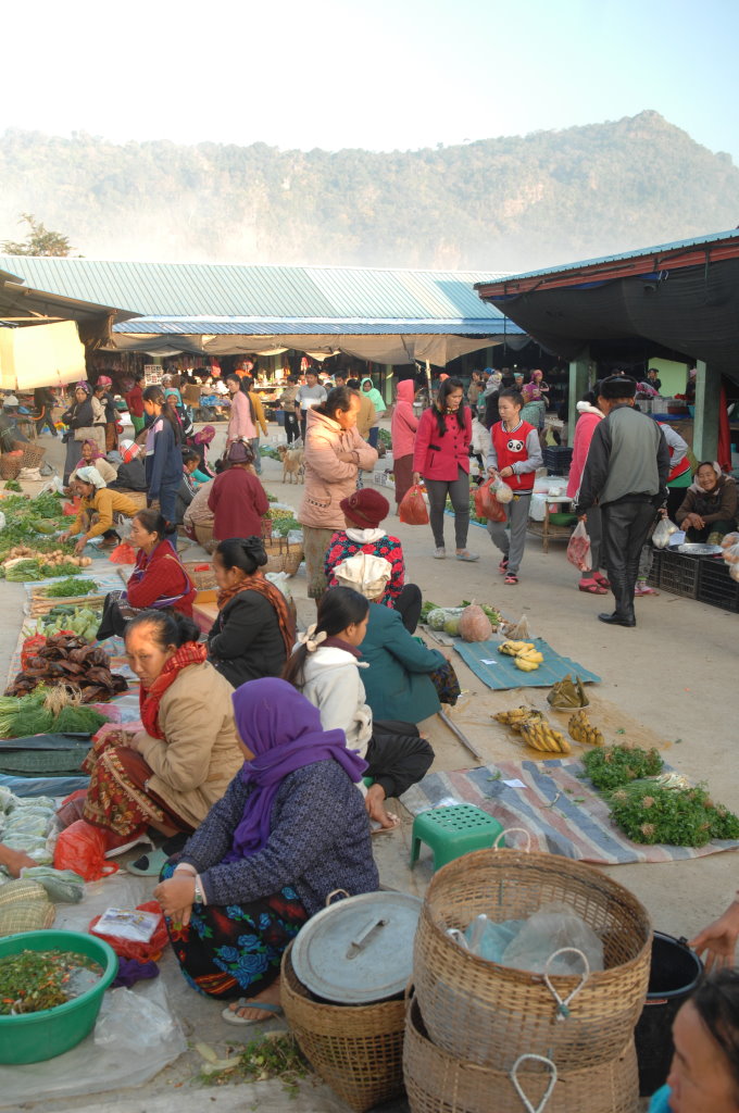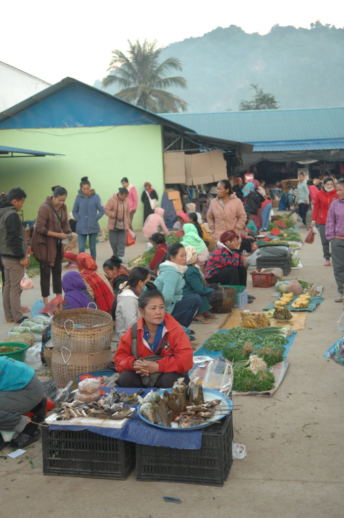 Märkte sind faszinierend, egal wo auf dieser Welt. Da lohnt auch mal frühes Aufstehen. Morgens um 6.30 Uhr herrscht bereits reger Betrieb. Zahlreiche Bauersfrauen unterschiedlicher Ethnien sind aus der Umgebung von Muang Long in die Stadt gekommen, um ihre Produkte zu verkaufen. Neben allerlei Gemüse vom Feld und aus dem Garten liegen auch Zutaten für die Anreicherung des Speiseplans bereit, die für den europäischen Gaumen eher ungewöhnlich sind: für den der’s mag sind Eichhörnchen oder fette Kröten wahrscheinlich das höchste – letztere werden noch lebend an die Kunden verkauft.