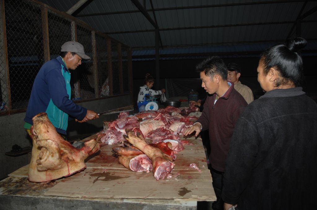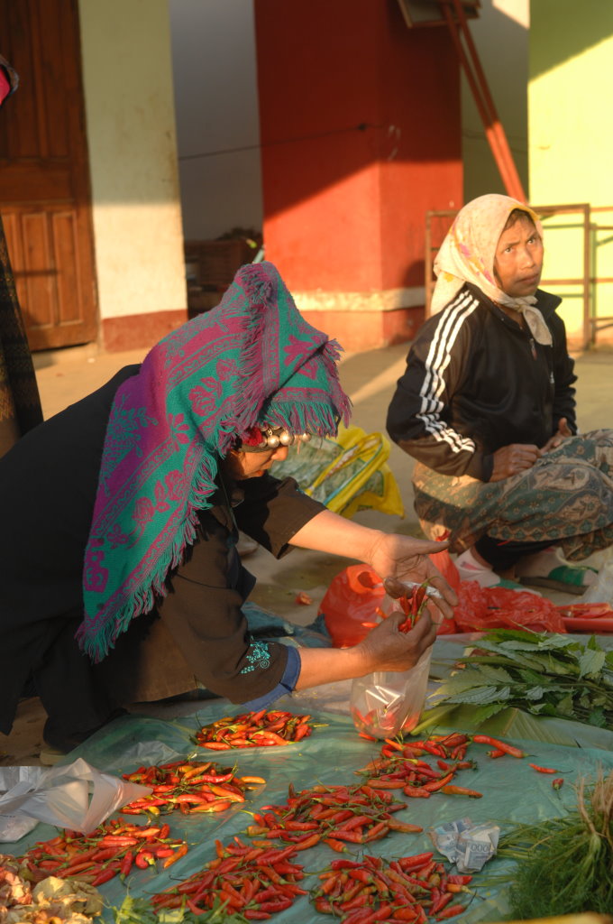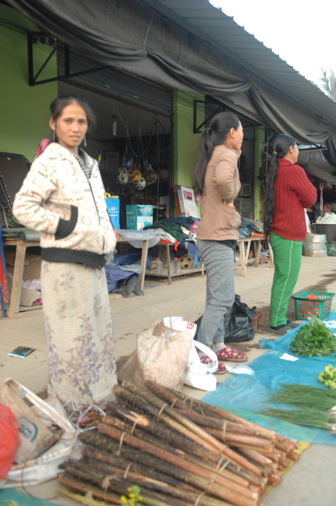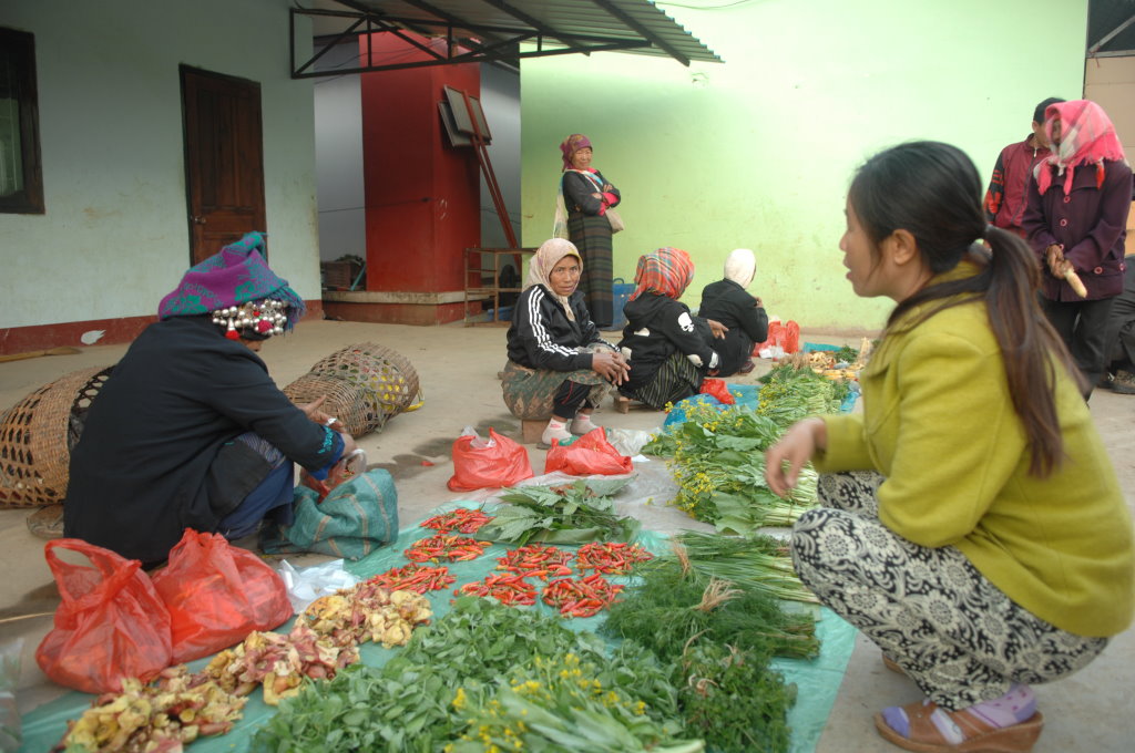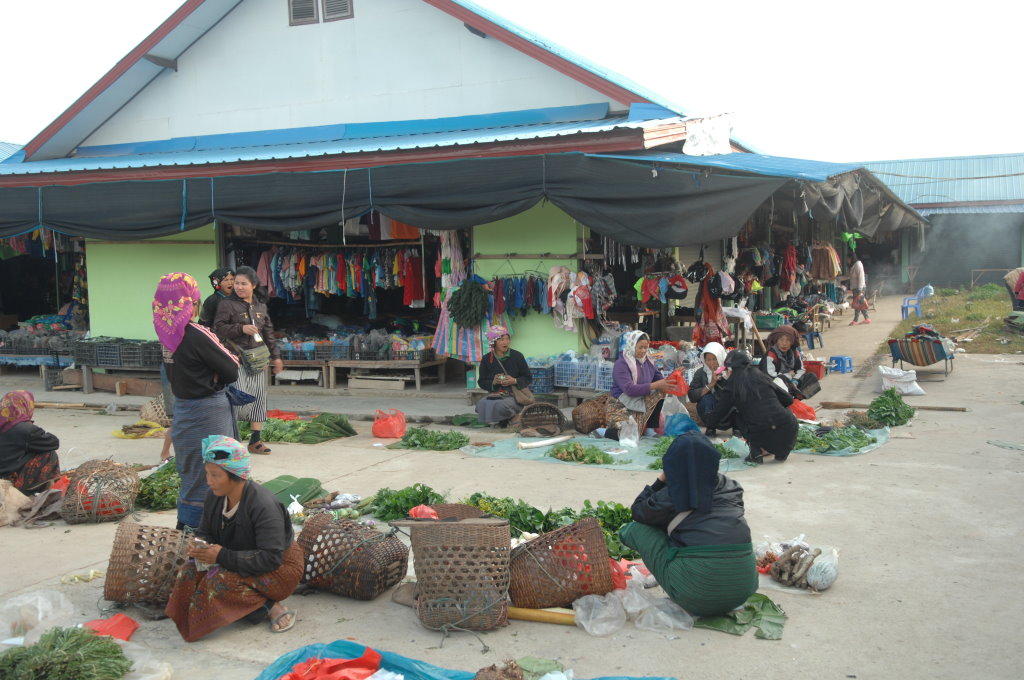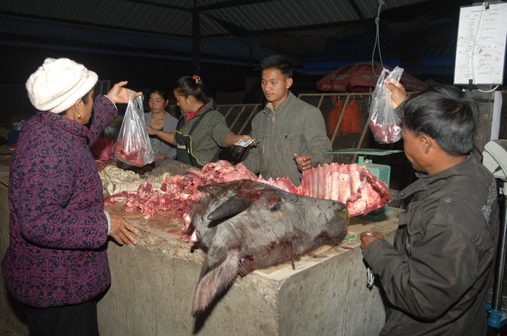 Märkte sind faszinierend, egal wo auf dieser Welt. Da lohnt auch mal frühes Aufstehen. Morgens um 6.30 Uhr herrscht bereits reger Betrieb. Zahlreiche Bauersfrauen unterschiedlicher Ethnien sind aus der Umgebung von Muang Long in die Stadt gekommen, um ihre Produkte zu verkaufen. Neben allerlei Gemüse vom Feld und aus dem Garten liegen auch Zutaten für die Anreicherung des Speiseplans bereit, die für den europäischen Gaumen eher ungewöhnlich sind: für den der’s mag sind Eichhörnchen oder fette Kröten wahrscheinlich das höchste – letztere werden noch lebend an die Kunden verkauft.