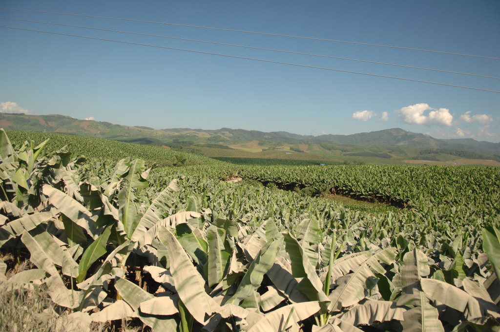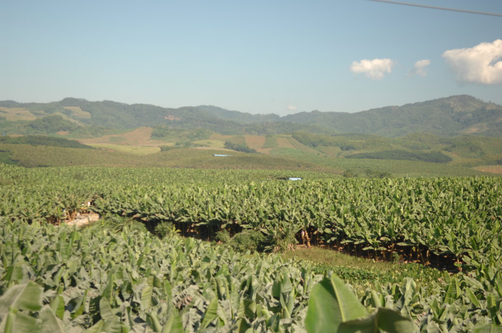 Und los geht die Fahrt ins 71 (Fahrt-)Kilometer entfernte Xieng Kok. War die Straße gestern schon ziemlich holprig, so ist heute zeitweise Schlagloch-Slalom für Fortgeschrittene angesagt. Die Landschaft mit den sanften Hügeln ist eigentlich wunderschön, aber leider nicht allzu abwechslungsreich. Auch hier führt die Strecke durch Kautschuk- und vor allem ausgedehnte Bananen-Plantagen. Erst einige Kilometer vor dem Ziel wird sich das ändern. Dann säumen abgeerntete, terrassierte Reisfelder die Strecke, auf denen gerade (unter Plastikabdeckungen) Bohnen gezogen werden.