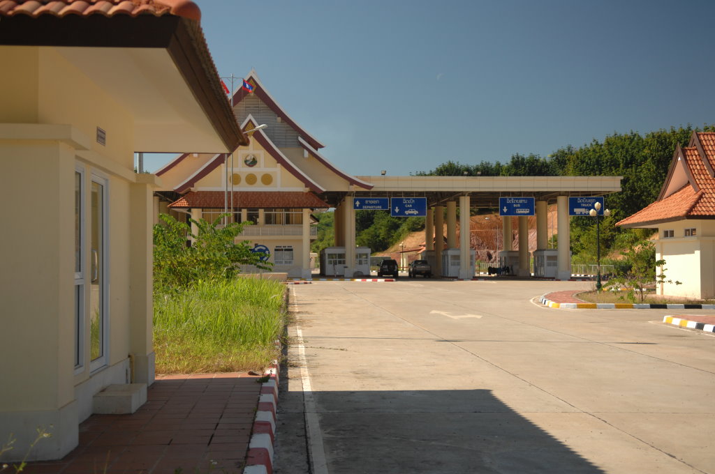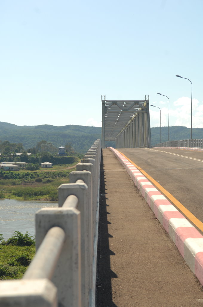 Weiter geht die Fahrt und wir nähern uns allmählich der Grenze. Kaum haben wir die Grenzstadt Xieng Kuk passiert und sind Richtung Mekong abgebogen, ist die Straße plötzlich zweispurig und sogar asphaltiert. Nach einigen Kilometern am Fluss entlang kommt schließlich die Freundschaftsbrücke bei Kenglat in Sicht.