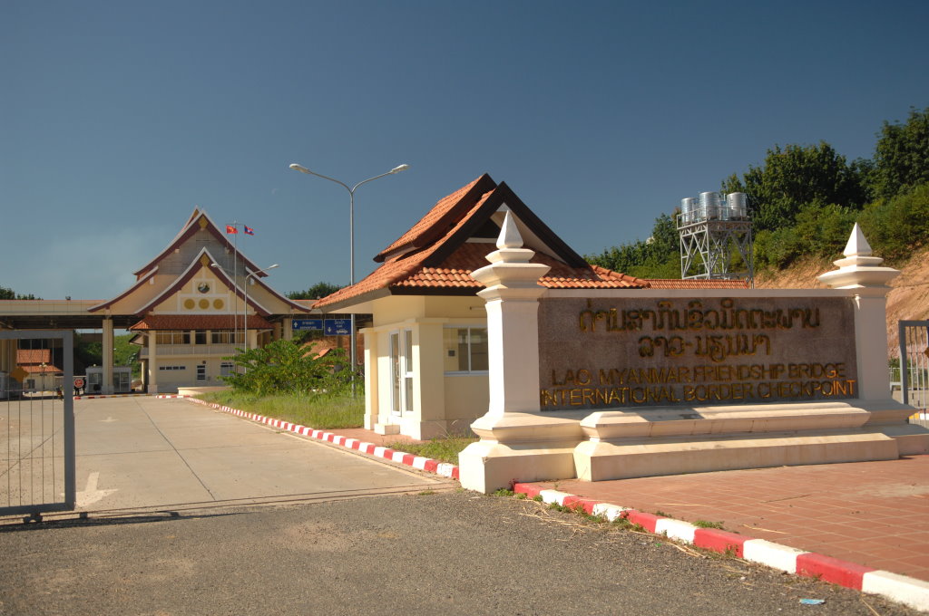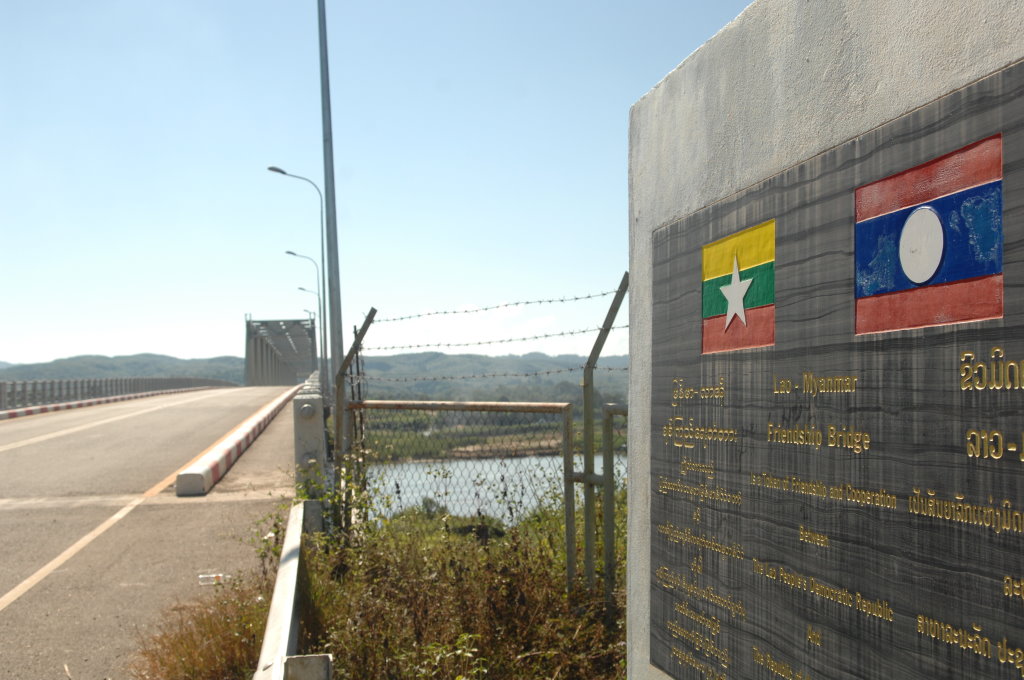 Eine echte Geistergrenze. Es dauert eine Weile, bis sich ein Grenzer sehen lässt. Erst nach längeren Diskussionen mit den laotischen Beamten und Vorlage des Permits dürfen wir wenigstens für ein paar Fotos bis zur Brückenauffahrt fahren. Viel zu tun haben die Grenzer hier wirklich nicht. Bis auf ein mit zwei Körben beladenem Moped will niemand die Grenze zwischen Laos und Myanmar überqueren. Für Touristen ist sie derzeit nicht passierbar.
