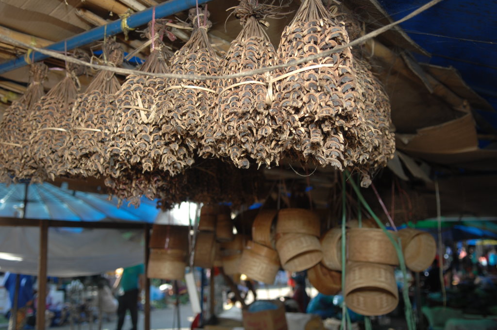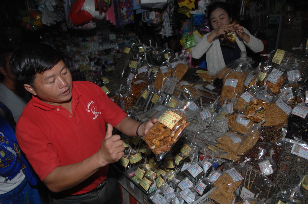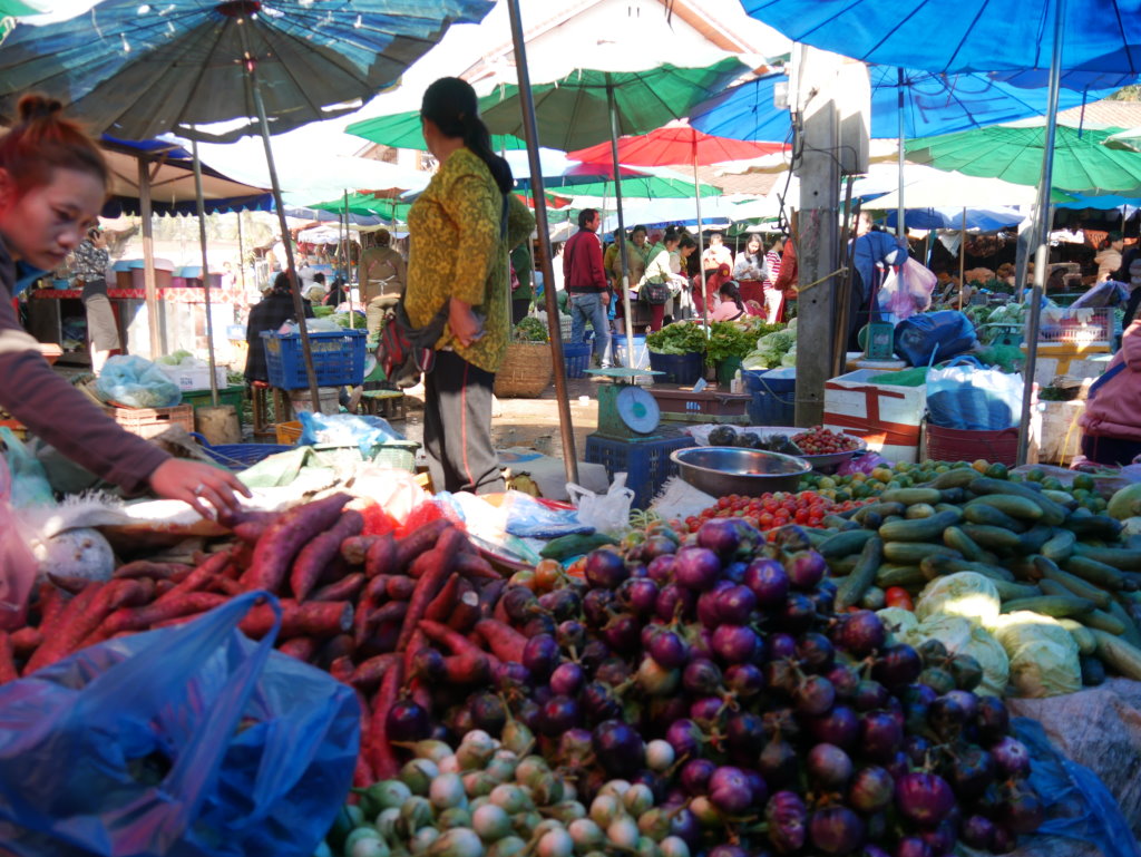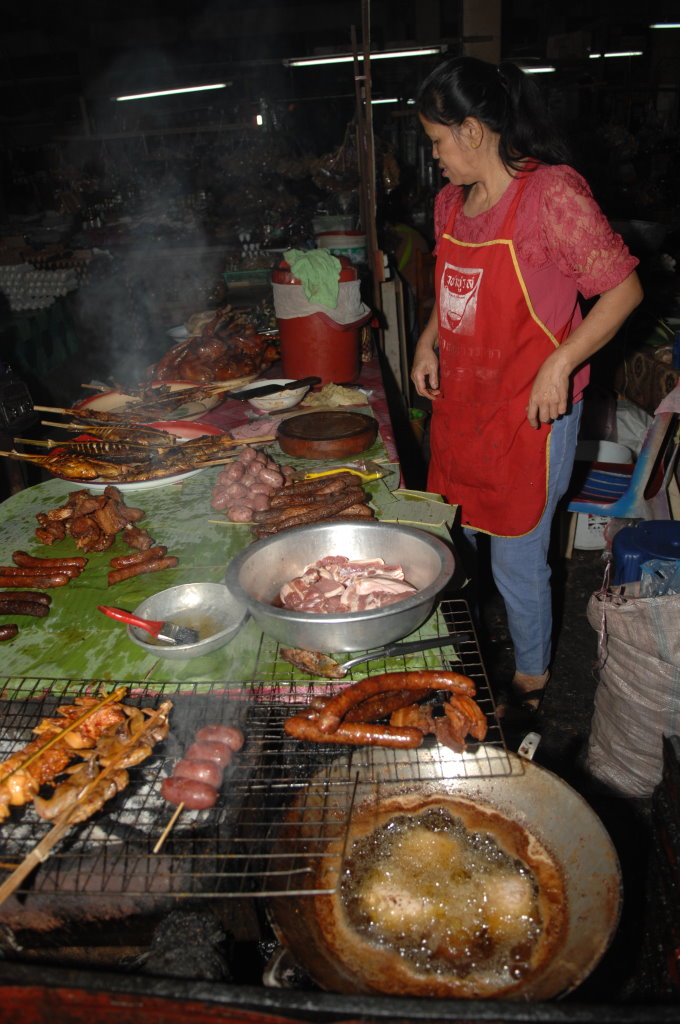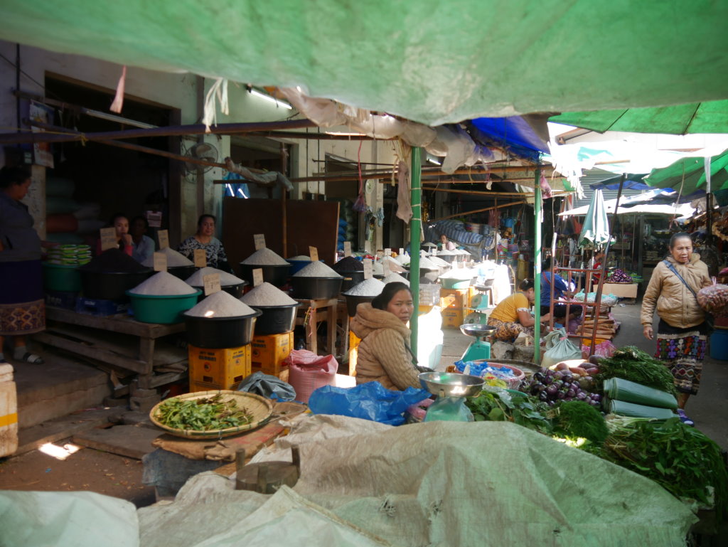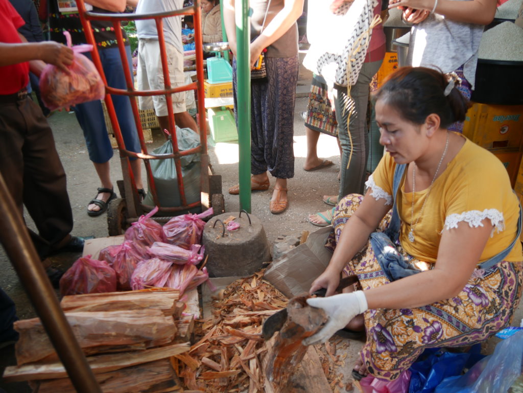 Der Tageskurs beginnt um zehn Uhr mit einem Besuch des Phosi Marktes. Phia erläutert fachkundig die exoterischen Zutaten und gibt bereits erste Tipps zu speziellen Gerätschaften, die später in der Küche zum Einsatz kommen. Viele der asiatischen Gemüsesorten sind mittlerweile auch in den Asia-Märkten z.B. in München zu bekommen. Manches ist längst in deutschen Küchen zu finden, bei anderen Zutaten fehlt schlicht eine deutsche Bezeichnung. Aber alles in allem sollte das Nachkochen daheim nicht an den benötigten Zutaten scheitern. Zur Not gibt’s Tipps von den laotischen Küchenprofis für einen möglichen Ersatz.