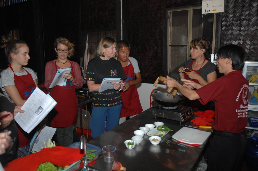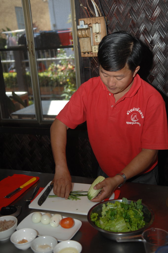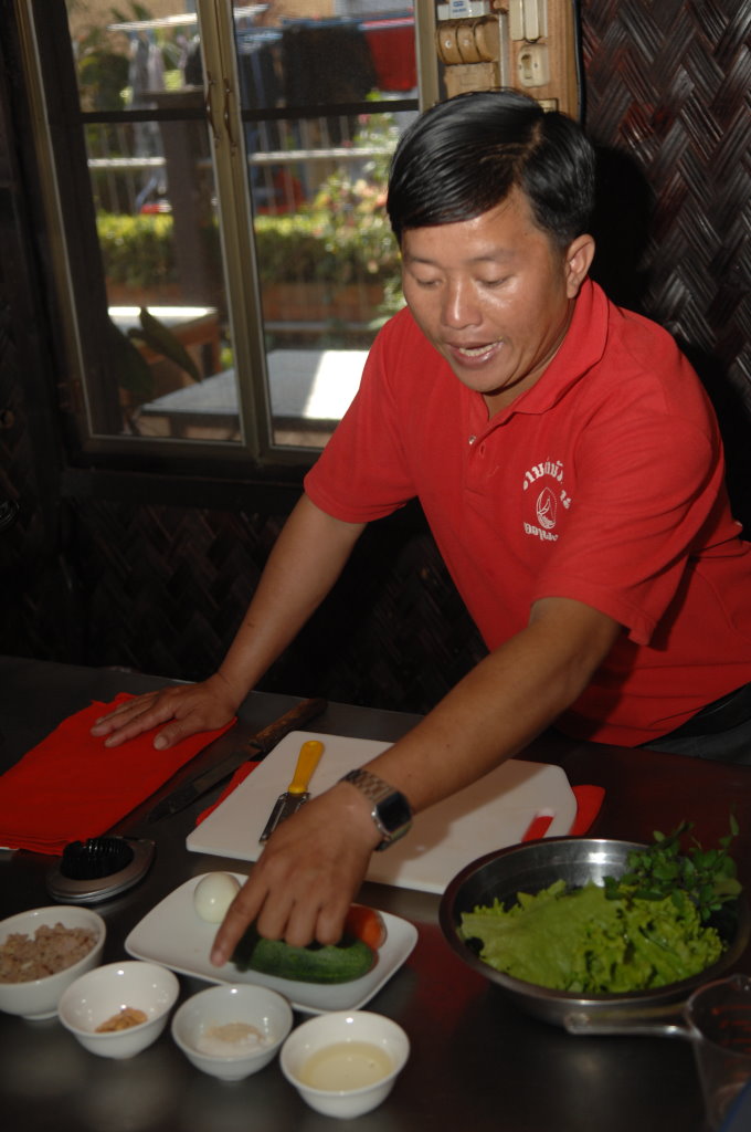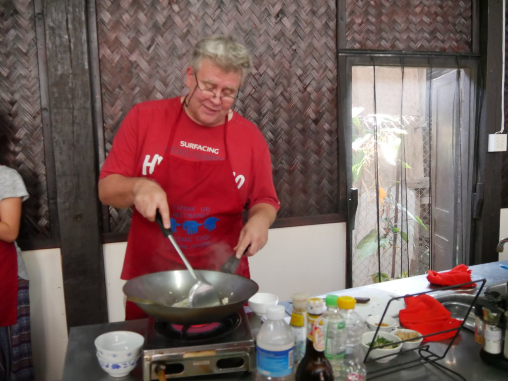 Zurück in der Kochschule gruppieren sich die viereinhalb Paare aus Deutschland, Belgien, Hongkong und Italien vor dem Demonstrationsplatz und lassen sich die Zubereitung der ersten beiden Gerichte zeigen. Luang Prabang Salat und Feu Hua – gebratene Klebreisnudeln mit Huhn und Gemüse. Anschließend dürfen die Herren der Schöpfung unter Anleitung ihrer mit den Rezeptbüchern gewappneten Frauen die benötigten Zutaten einsammeln. Dann geht’s los und alle nehmen ihre Position an den Kochstellen ein. Gemüse, Zwiebeln, Knoblauch schnippeln und alles wie zuvor gesehen in der richtigen Reihenfolge im Wok zubereiten. Die Ergebnisse werden anschließend am großen Tisch auf der Veranda der Kochschule verkostet.