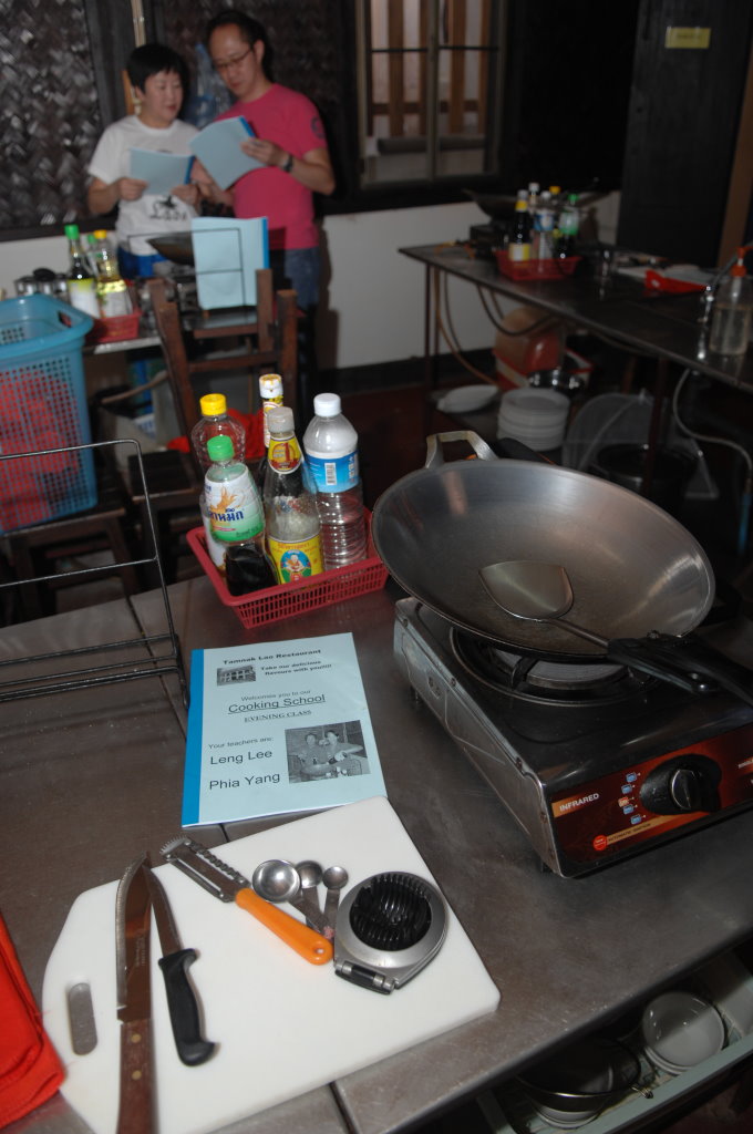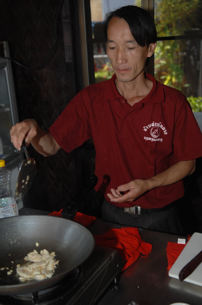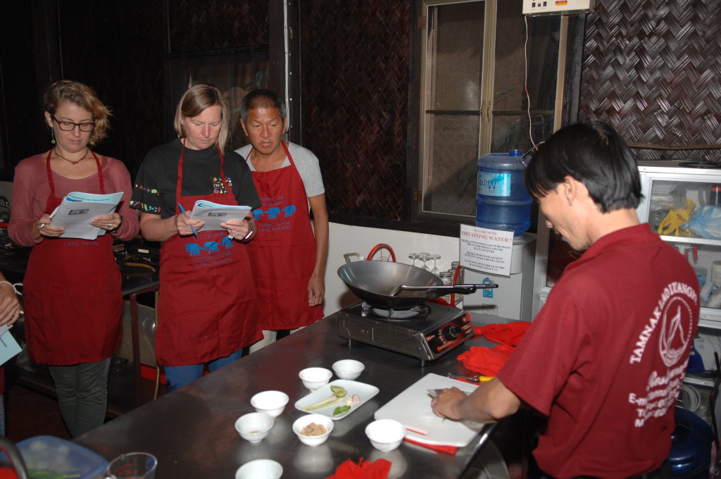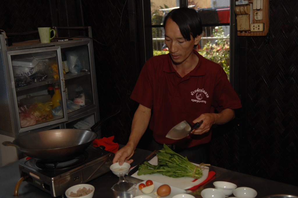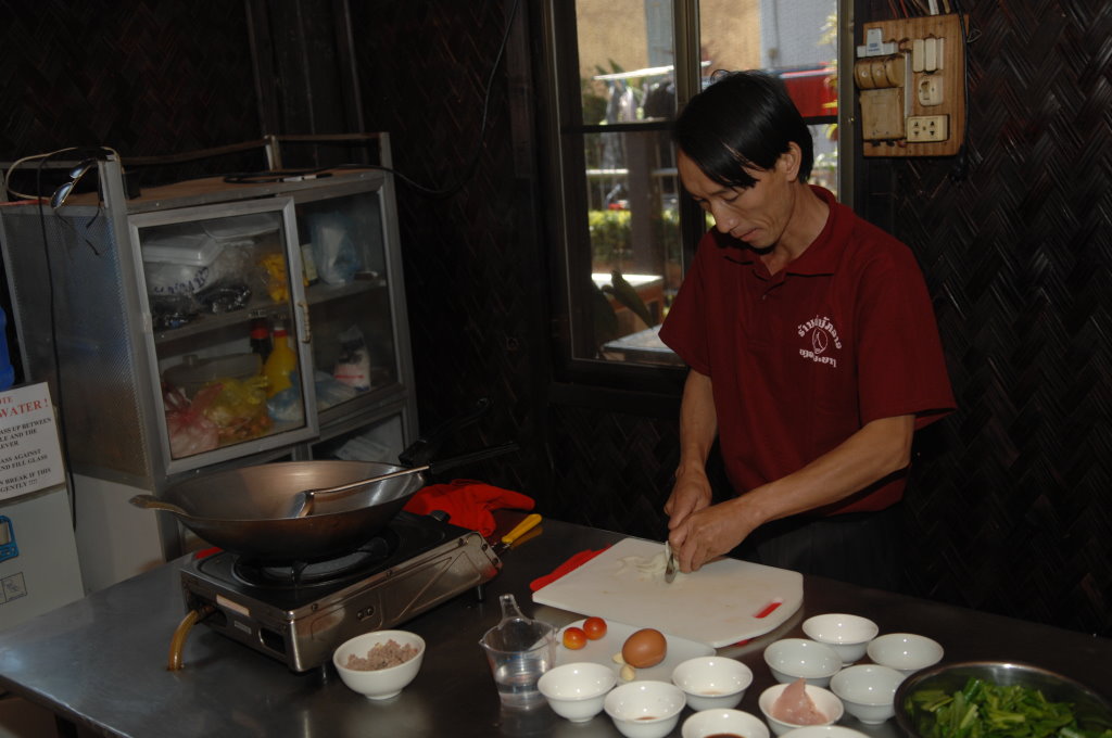 Zurück in der Kochschule gruppieren sich die viereinhalb Paare aus Deutschland, Belgien, Hongkong und Italien vor dem Demonstrationsplatz und lassen sich die Zubereitung der ersten beiden Gerichte zeigen. Luang Prabang Salat und Feu Hua – gebratene Klebreisnudeln mit Huhn und Gemüse. Anschließend dürfen die Herren der Schöpfung unter Anleitung ihrer mit den Rezeptbüchern gewappneten Frauen die benötigten Zutaten einsammeln. Dann geht’s los und alle nehmen ihre Position an den Kochstellen ein. Gemüse, Zwiebeln, Knoblauch schnippeln und alles wie zuvor gesehen in der richtigen Reihenfolge im Wok zubereiten. Die Ergebnisse werden anschließend am großen Tisch auf der Veranda der Kochschule verkostet.