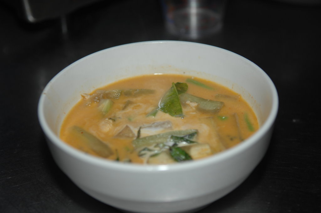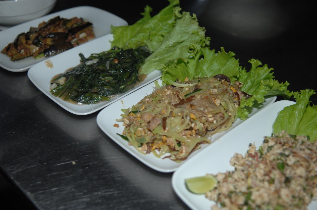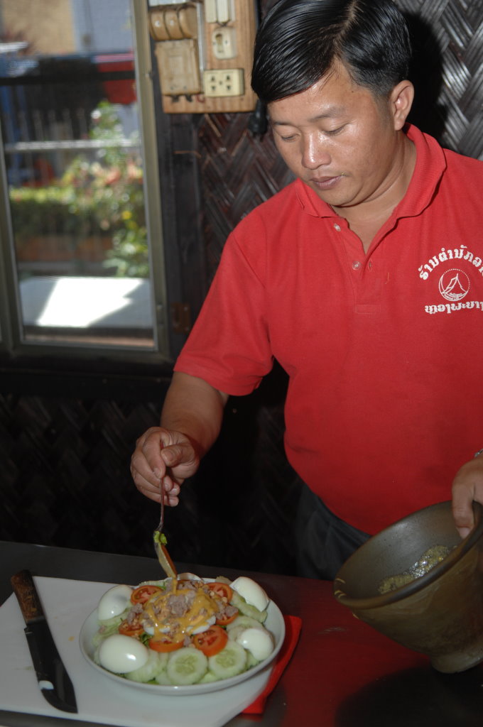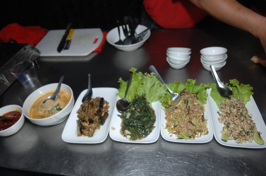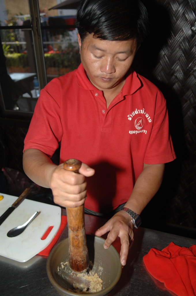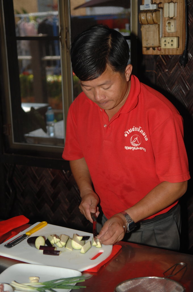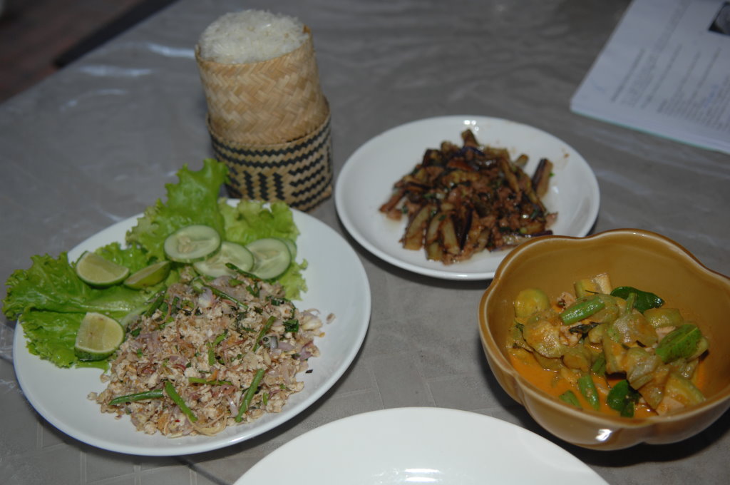Von den fünf jetzt demonstrierten Gerichten darf jedes Paar drei zum Nachkochen wählen – die Zubereitung der laotischen Variante einer Chili-Paste und des unabdingbaren Klebreis geschieht unabhängig davon für alle von den beiden Köchen. Wir entscheiden uns für Chicken Larp (Hühnersalat), Khua Maak Kheua Gap Moo (frittierte Auberginen mit Schweinefleisch) sowie Geng Phet (die laotische Variante eines roten Thai-Curry). Es ist bereits halb vier, als wir alle wieder draußen auf der Veranda beim Essen der selbst zubereiteten Gerichte sitzen.