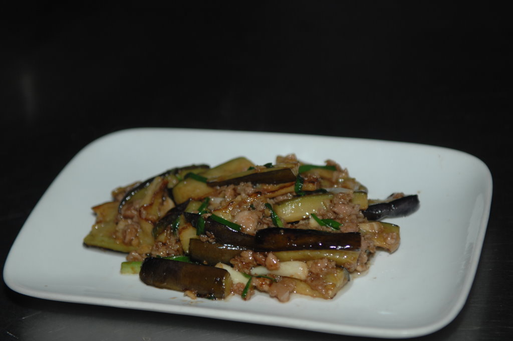 - Austernsoße, Frühlingszwiebeln und die zuvor frittierten Auberginen hinzufügen. Solange im Öl frittieren, bis die Zwiebeln gar aber noch bissfest sind