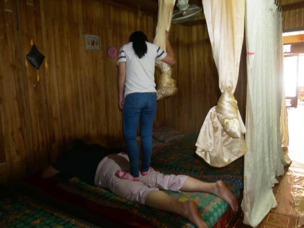 Den letzten Tag des Jahres beginnen wir mit einer Massage laotischer Art. Wieder einmal zeigt sich, dass es auch für zierliche Laoten Möglichkeiten gibt, gut ernährte Langnasen effektiv durchzukneten. Im Zweifel läuft man auf Ihnen spazieren und verleiht so den massierenden Füßen den nötigen Nachdruck. Echtes laotisches Multitasking wird es aber erst, wenn die Hände zum Daddeln mit dem Handy frei bleiben.