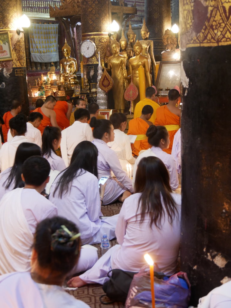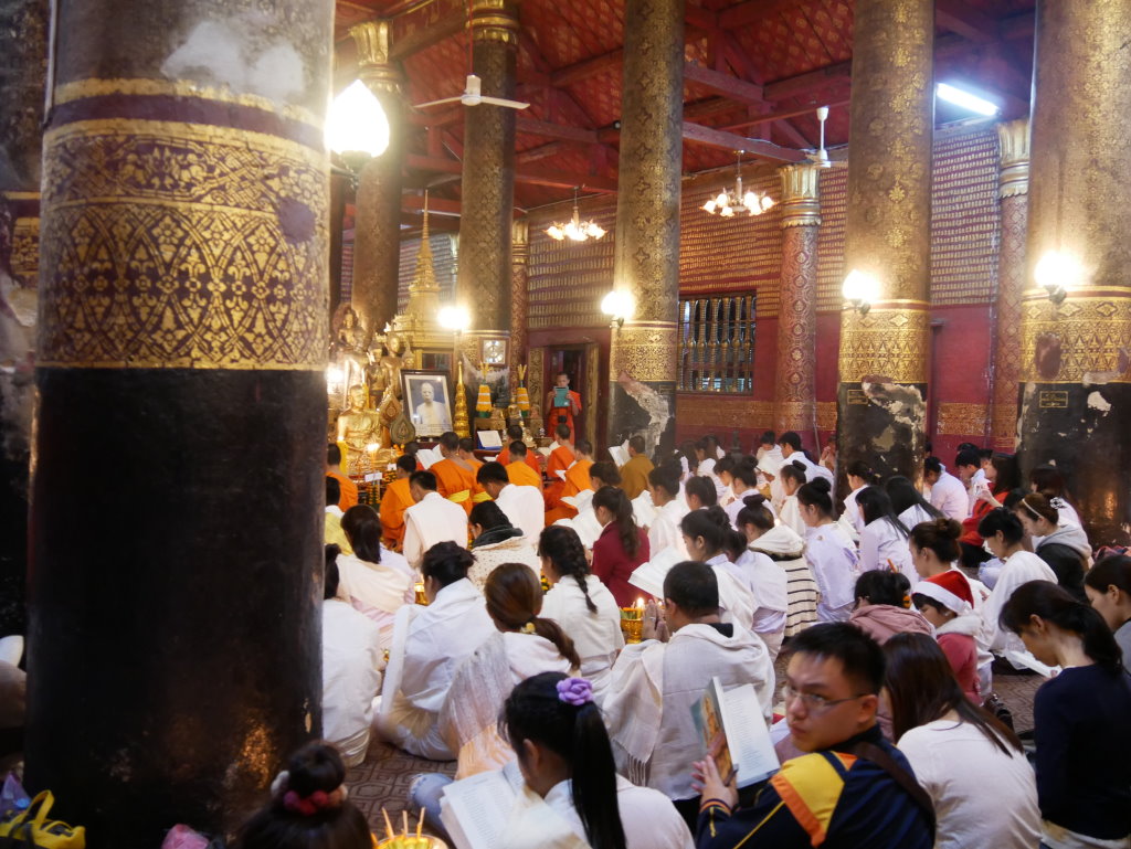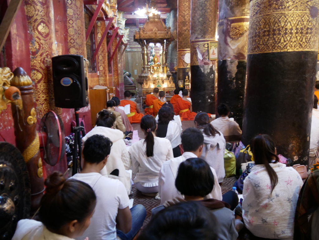 Im Wat Mai Suwannaphumaham haben sich Mönche und Gläubige zum traditionellen Friedensgebet versammelt. Was für ein Kontrast zu dem schrillen lauten Simpel-Techno der offiziellen Feier auf dem Marktplatz nebenan. Dort mag aber nicht nur wegen der Musik keine rechte Stimmung aufkommen. Immer wieder streifen Polizisten und bewaffnete Uniformierte durch die Menge.