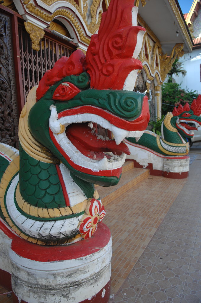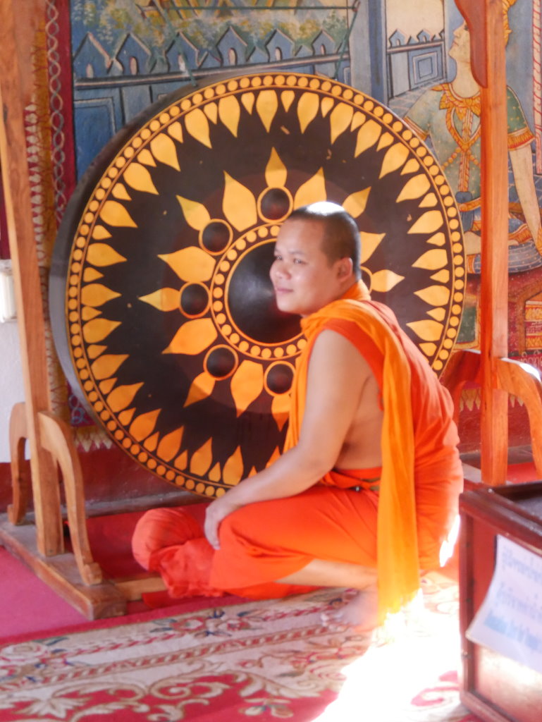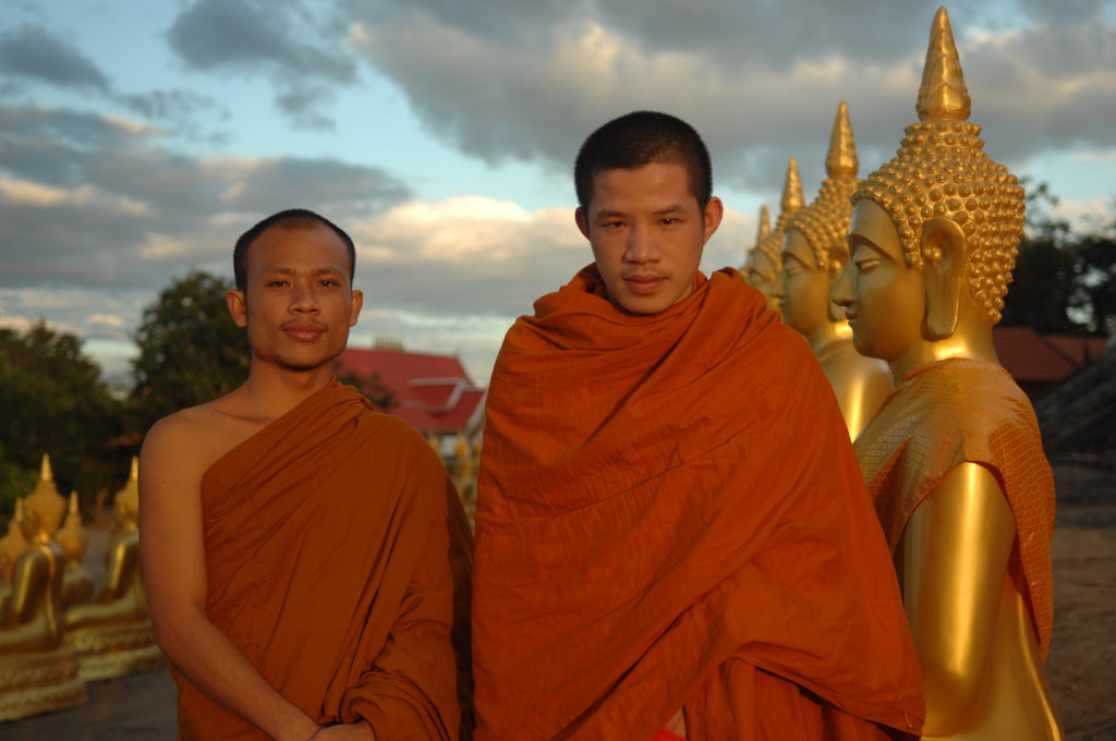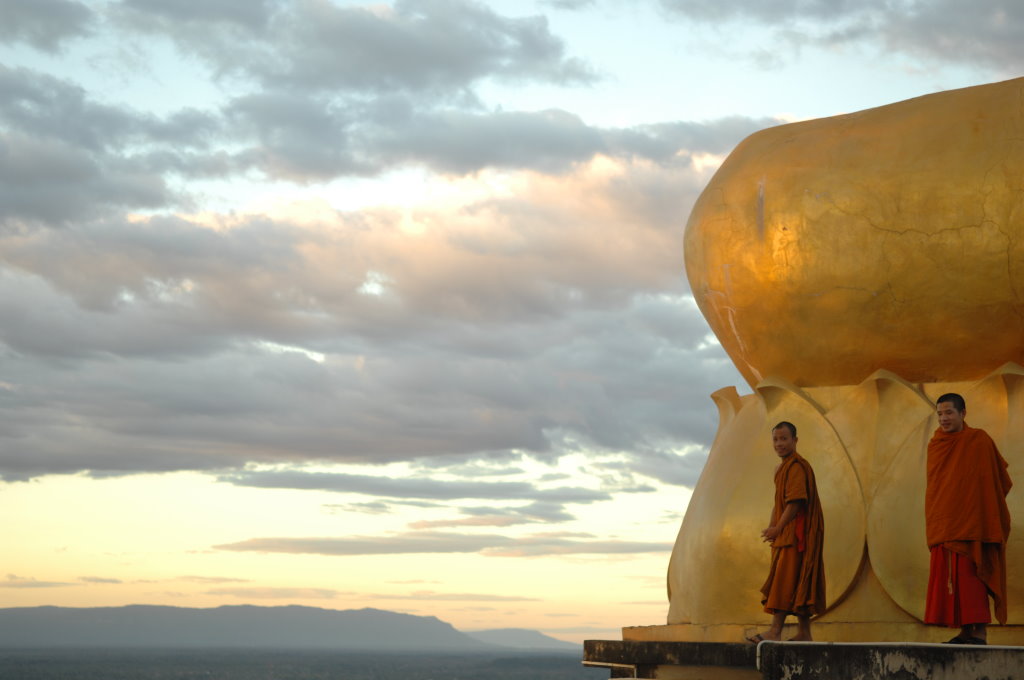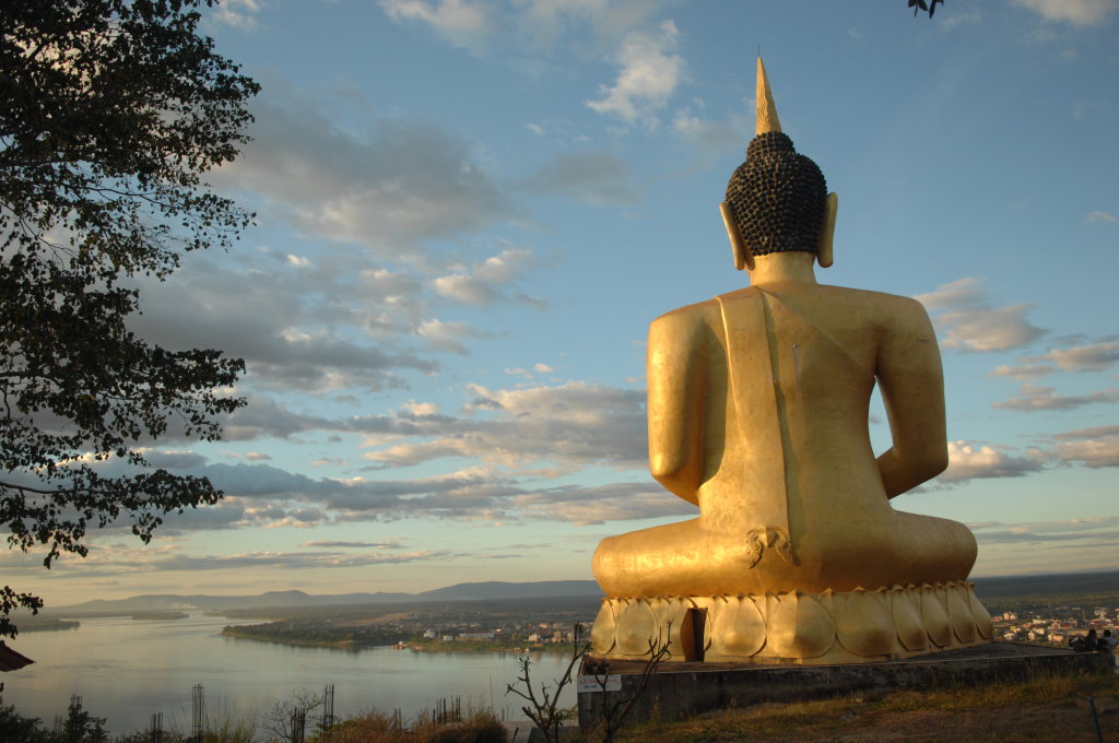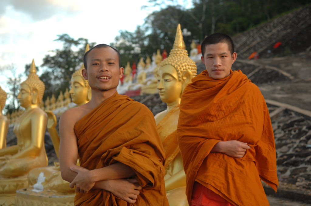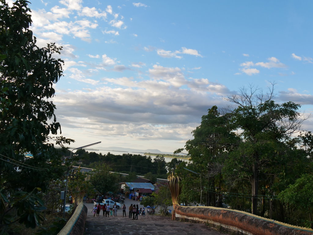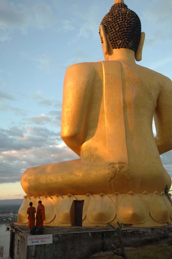 Der Blick von oben auf den Mekong und die Stadt entschädigt für die schweißtreibende Tortur. Die 20 Meter hohe, sitzende Buddhafigur ist neueren Datums und auch die zahlreichen kleineren, die den Weg zum Kloster auf dem Berg säumen. Zwei Novizen nutzen die Möglichkeit, im Gespräch mit den Touristen ihre Englischkenntnisse aufzufrischen.