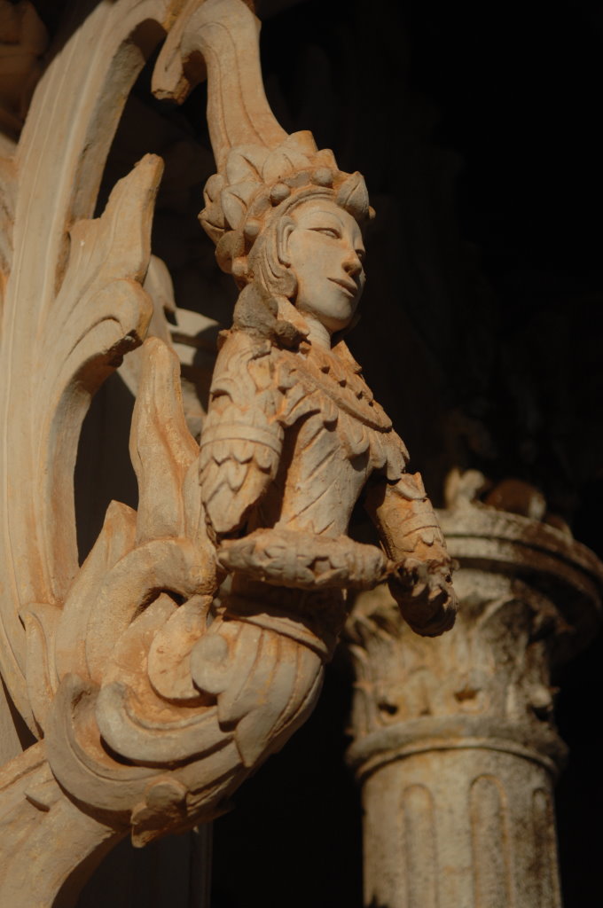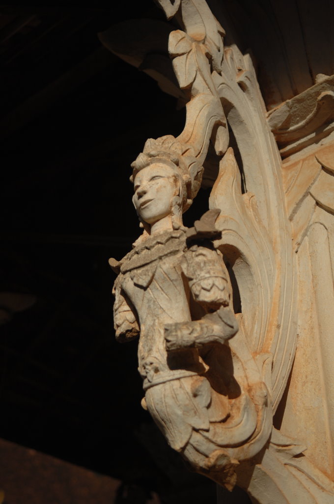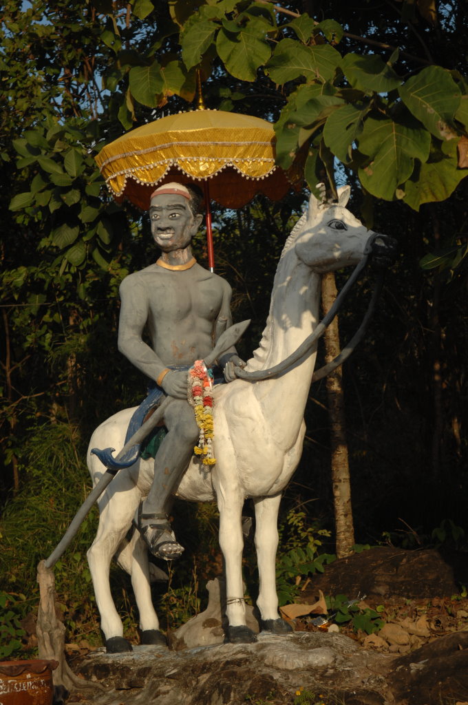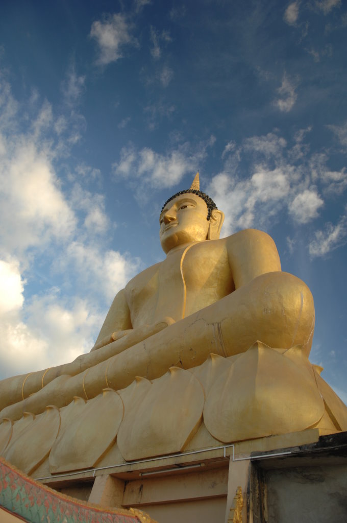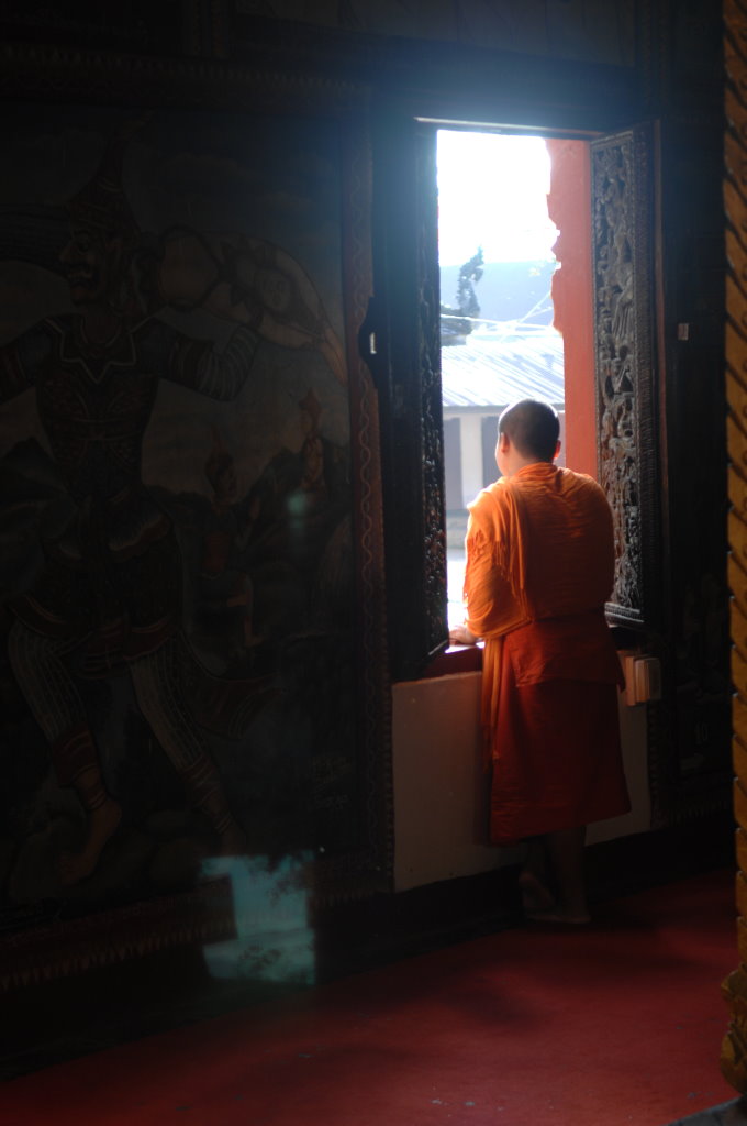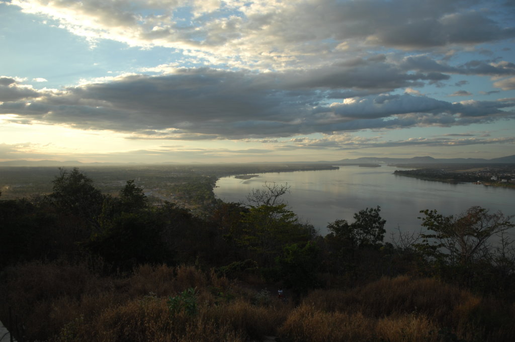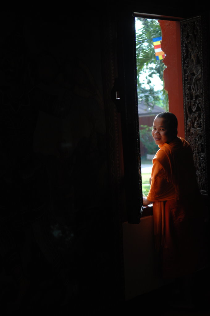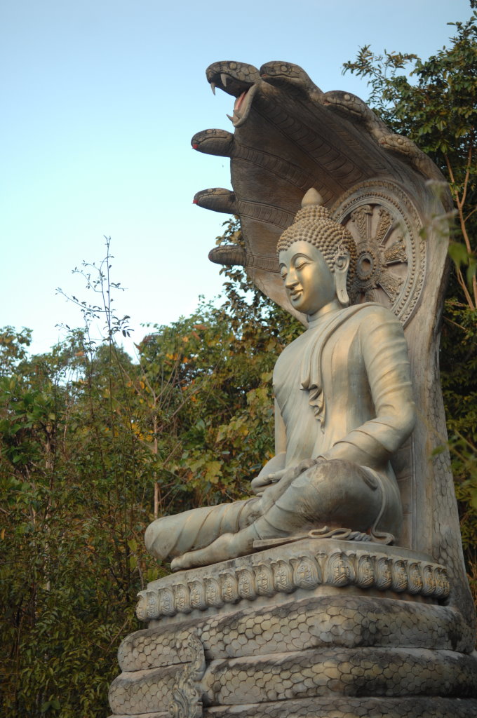 Der Blick von oben auf den Mekong und die Stadt entschädigt für die schweißtreibende Tortur. Die 20 Meter hohe, sitzende Buddhafigur ist neueren Datums und auch die zahlreichen kleineren, die den Weg zum Kloster auf dem Berg säumen. Zwei Novizen nutzen die Möglichkeit, im Gespräch mit den Touristen ihre Englischkenntnisse aufzufrischen.