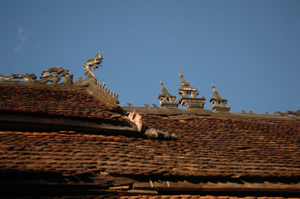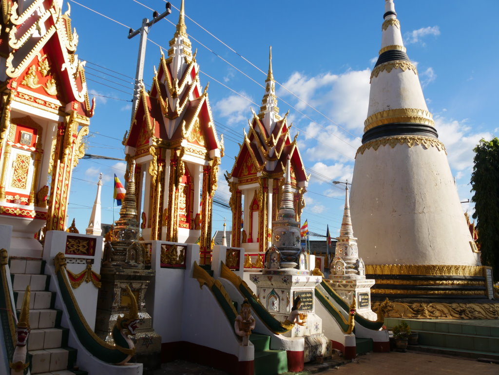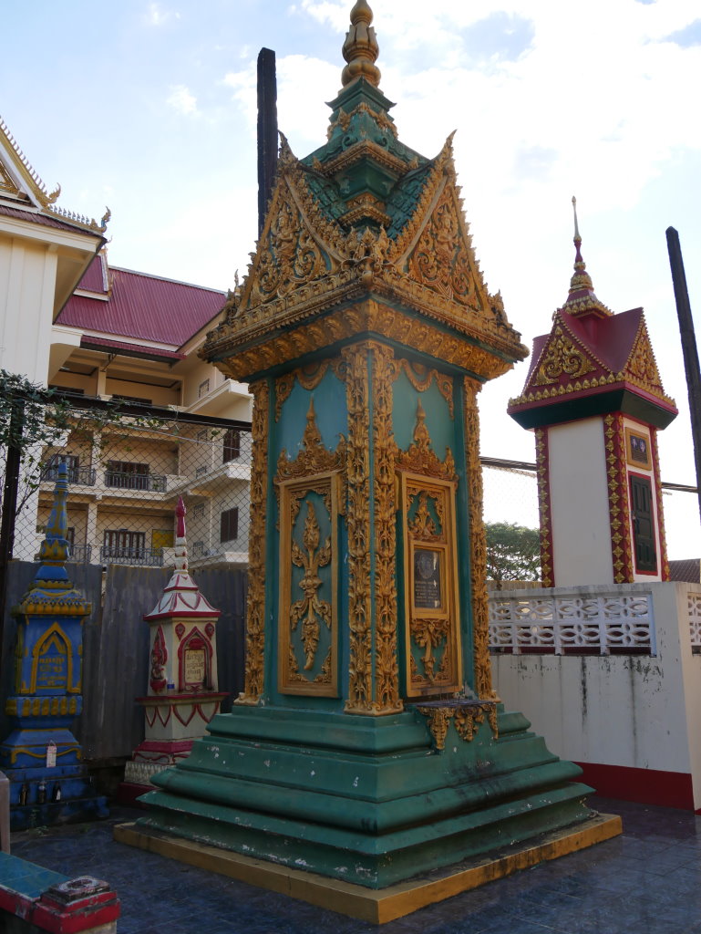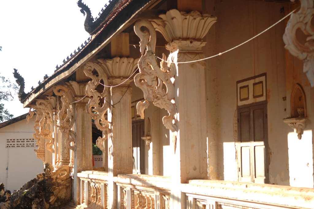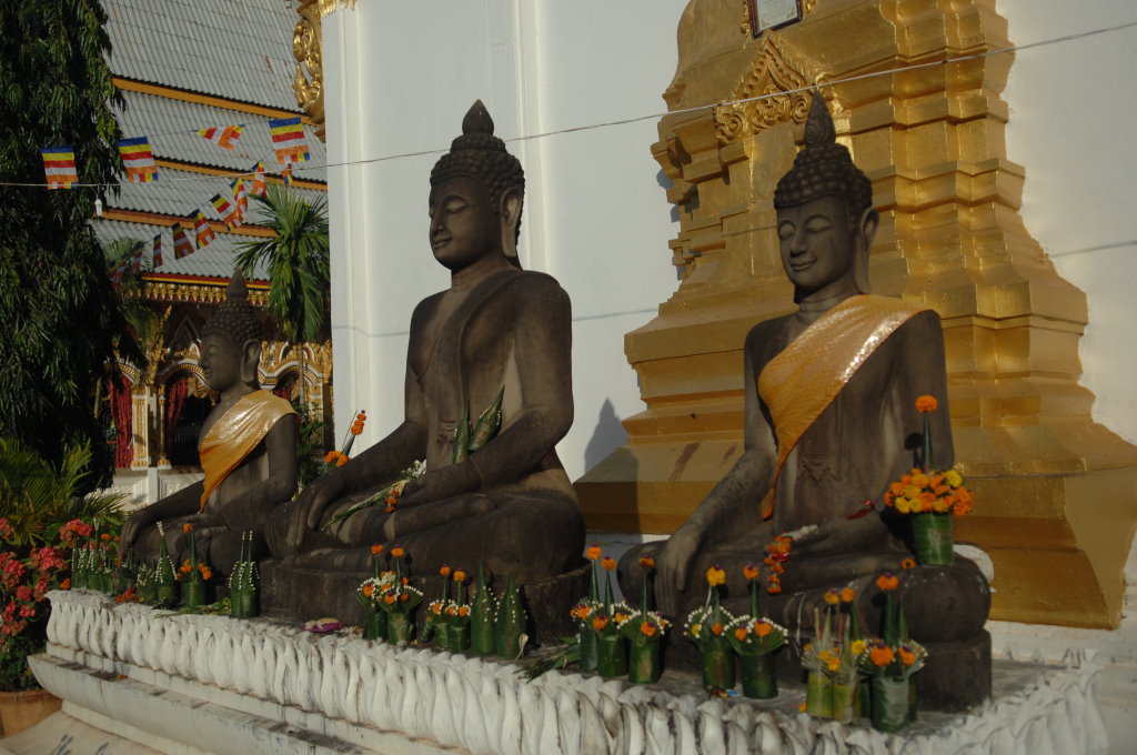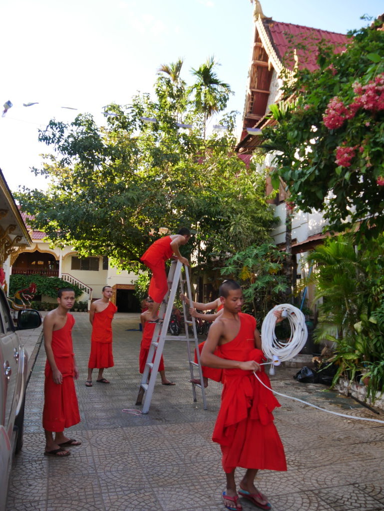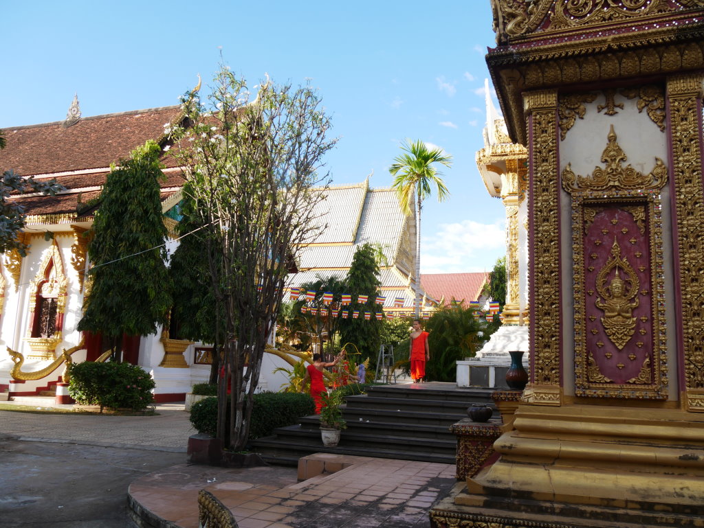 Direkt ums Eck unseres Hotels befindet sich der Wat Luang. Die Novizen sind noch damit beschäftigt, die Festtagsbeleuchtung der letzten Nacht abzubauen. Die Gebäude sind in unterschiedlich gutem Zustand. Bemerkenswert sind die zahlreichen Grabmäler am Rand des Geländes.