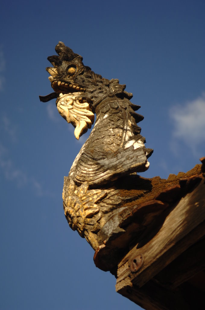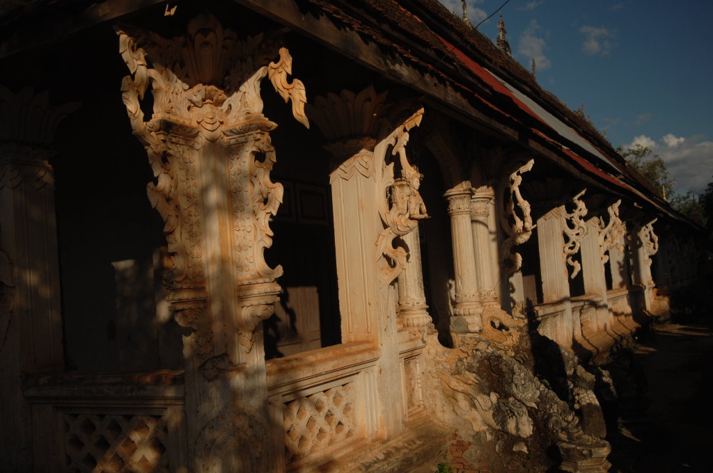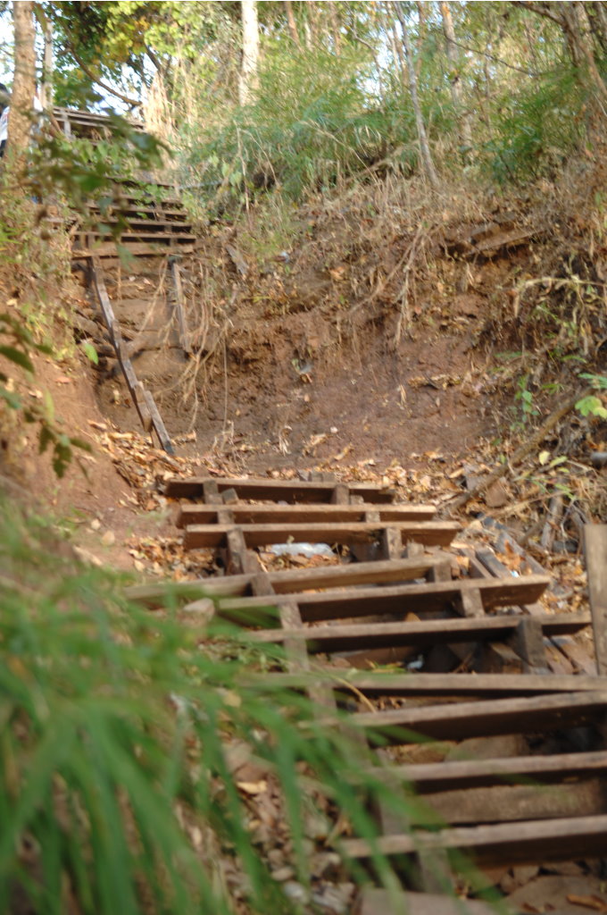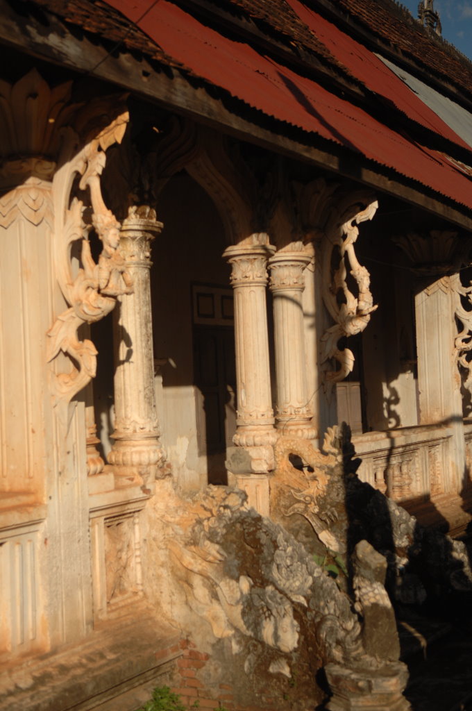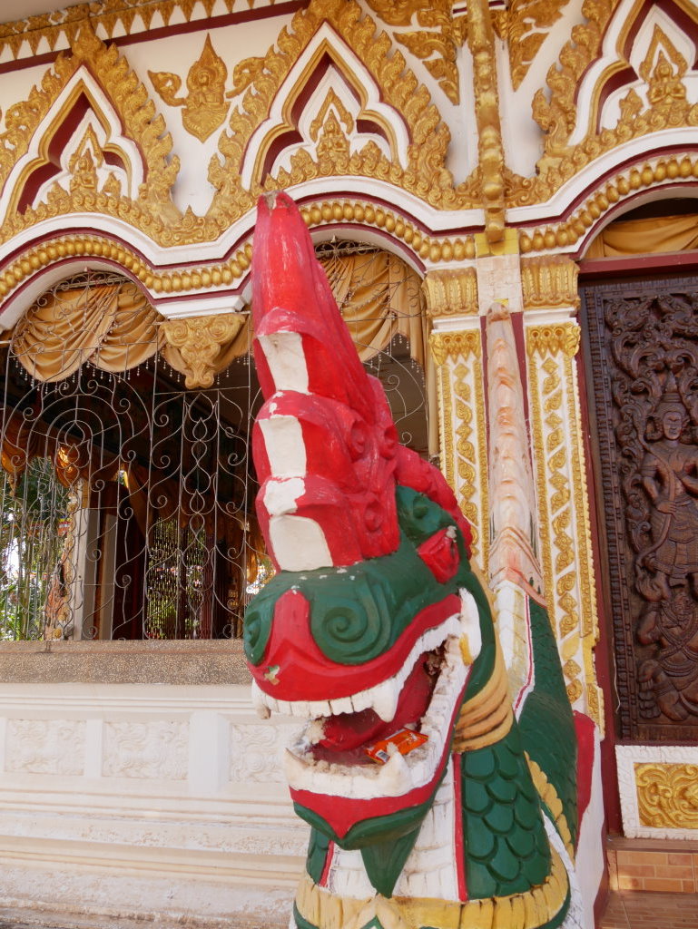 Eine echte Herausforderung ist der Weg zum großen goldenen Buddha des Wat Phou Salao. Für die Anfahrt des außerhalb der Stadt gelegenen Heiligtums teilen wir uns mit einer deutschen Familie ein Tuk-Tuk. Der Fahrer hält am Fuß einer steilen Treppe. Zwar könne man theoretisch über eine rund 5 km lange Straße auch direkt zum Gipfel fahren, die ist aber für unser Tuk-Tuk zu steil. Also bleibt nichts anderes, als zu Fuß den direkten Aufstieg wagen. Die steile, breite Steintreppe ist aber noch harmlos zu dem was noch kommt. Der zweite Teil des Weges führte ursprünglich über schmale Holzstiegen nach oben. Die sind großenteils vom Zahn der Zeit gezeichnet und besser nicht zu benutzen. Man kann also nur neben den Holzresten den Fels hinaufkraxeln.