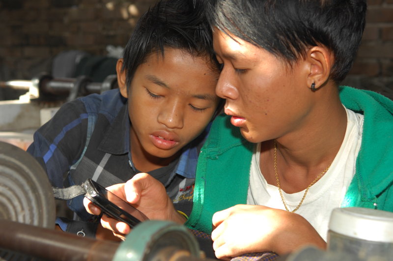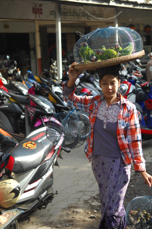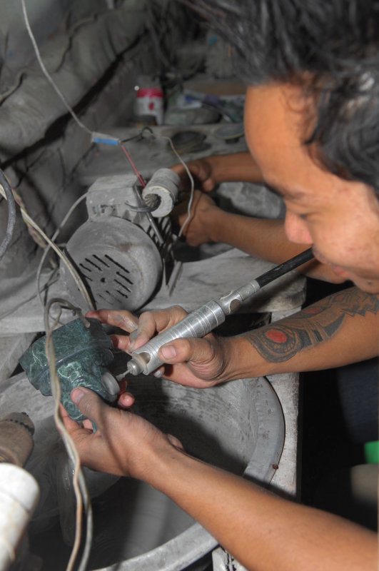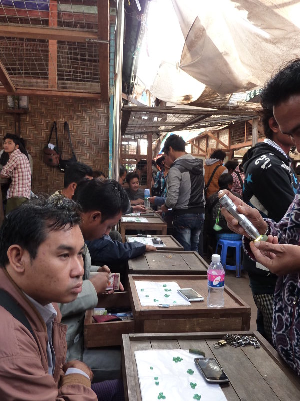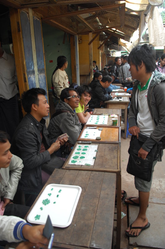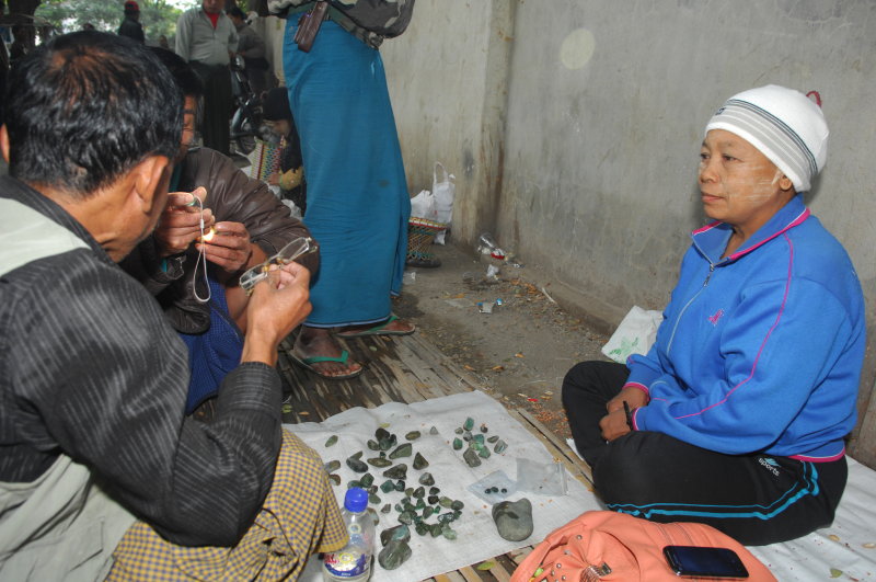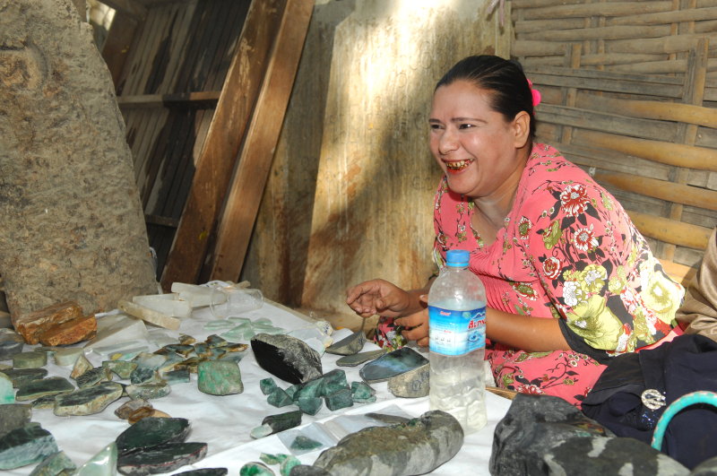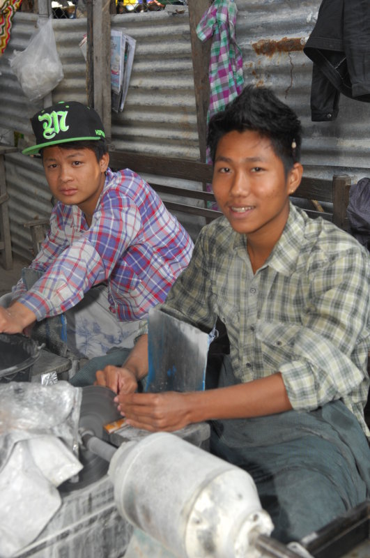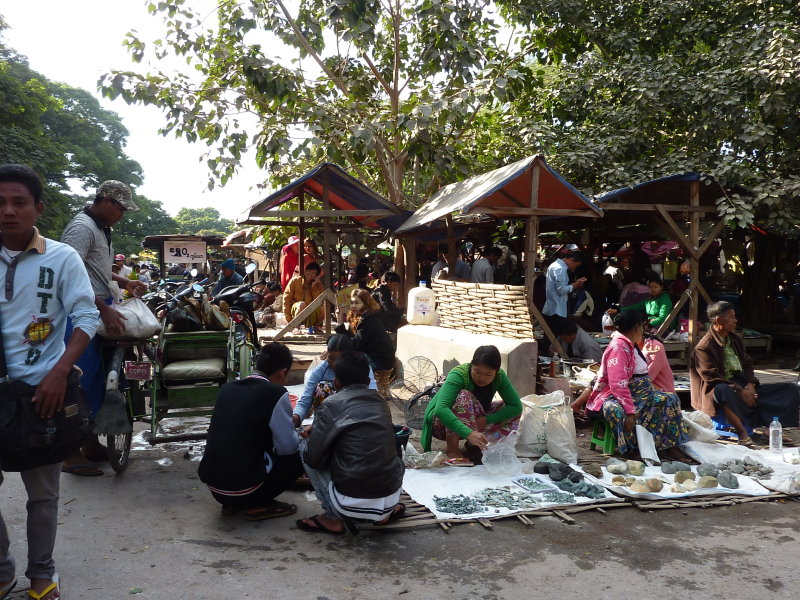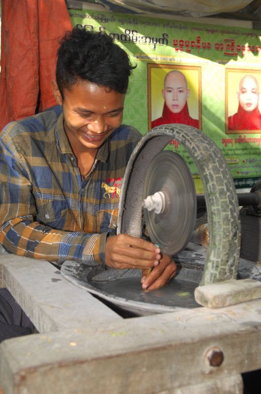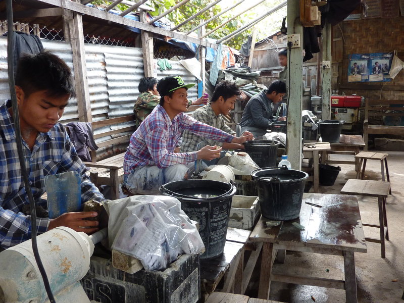 So So ist heute unser Guide. Pünktlich um 9 Uhr wartet er mit einem gemieteten Taxi vor dem Hotel. Er will uns einige seiner special places in Mandalay zeigen. Zunächst geht es zum Jademarkt. Den hatten wir zwar schon vor zwei Jahren auf dem Programm, aber bislang nur geschlossen und im Regen gesehen. Diesmal ist alles ganz anders. Obwohl Sonntag ist, tobt hier das Leben. Im dichten Gedränge schlängeln wir uns von den Verkäufern der Rohsteine zu den Schleifern und Polierern bis zu den Ankäufern. Je nach Qualität kann ein fingernagelgroßer, geschliffener Stein schon bis zu 2000 US$ wert sein. 20 Prozent der Bevölkerung Mandalays arbeiten in dieser Branche. Am besten gefielen uns die dreifarbigen Stücke in Grün, Weiß und Braun.