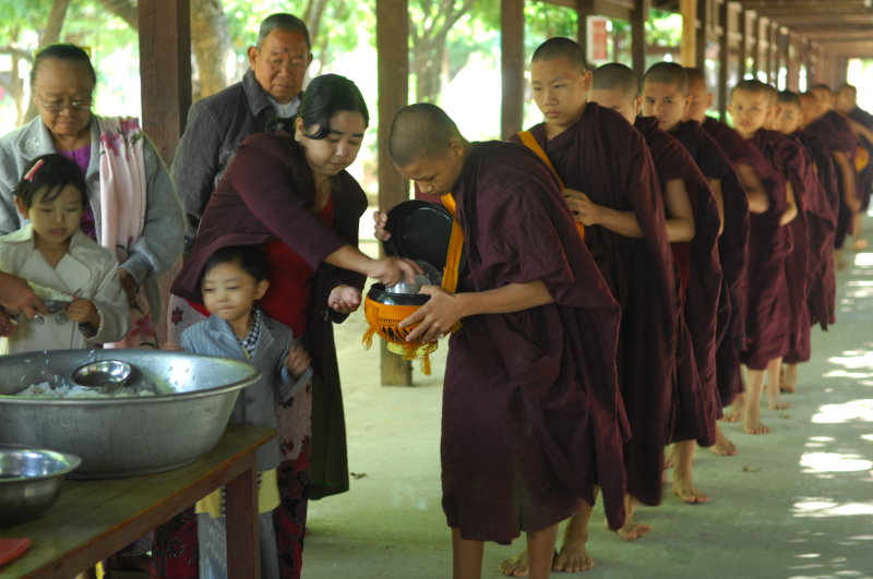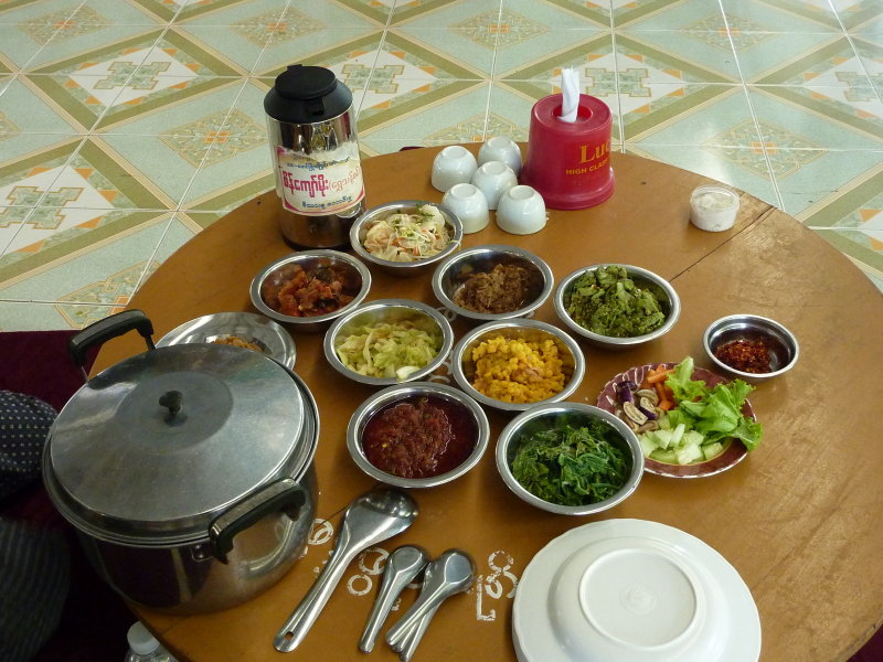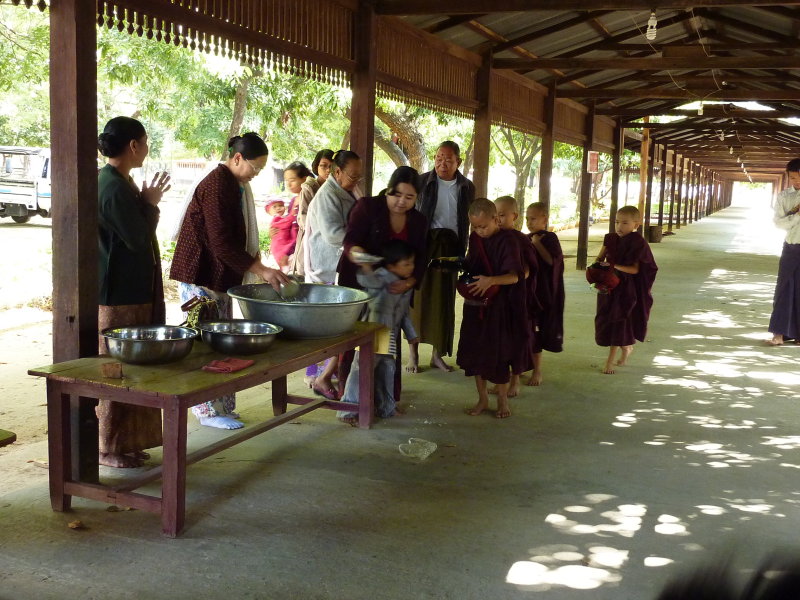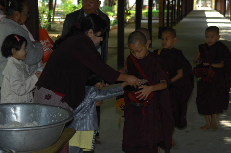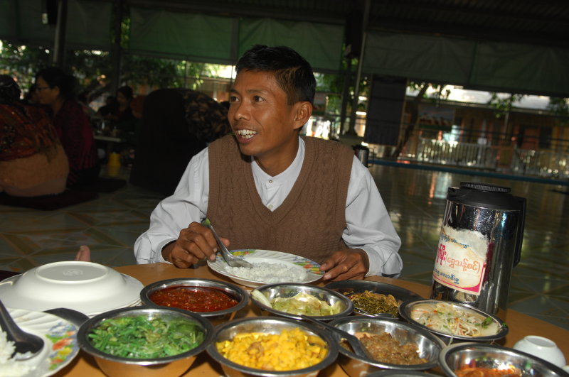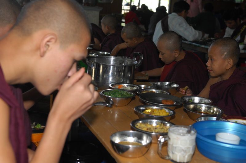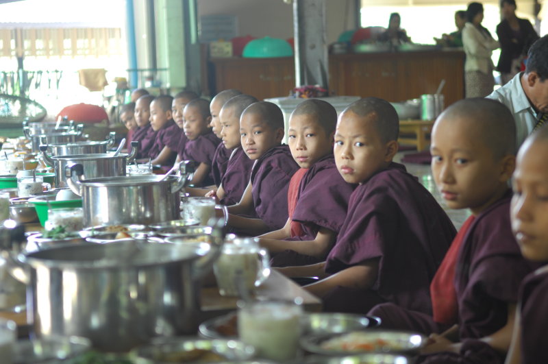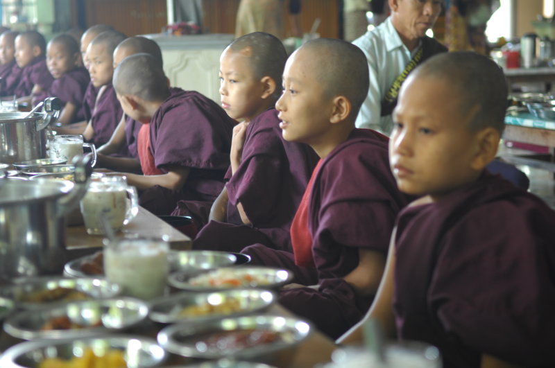 Lange können wir uns auf dem Markt nicht aufhalten. So So drängt zum Aufbruch, weil wir eine Verabredung zum Essen mit Mönchen haben. In das Kloster des Moe Hti Aung Si Meditation Centers verirren sich nur selten Touristen. Unser Guide kennt sich hier bestens aus. Er unterrichtet hier und war selbst eine Zeitlang als Mönch hier. Daher sein sehr gutes Englisch. Kaum sind wir angekommen, beginnt auch schon der Einzug der Mönche, die von ihrer morgendlichen Sammeltour zurück sind. Nach ihnen werden auch wir zu unseren Plätzen geführt – mitten im Saal zwischen den männlichen und weiblichen Bewohnern des Klosters. Zu Essen gibt es typisch burmesische Gerichte: sieben bis acht Schälchen mit Gemüse, Fisch und Fleisch und Soßen, aus denen man sich sein Menü selbst zusammenstellen kann. Nach dem Essen besichtigen wir den Mediationssaal und die Schule. Auch heute noch liegt ein Großteil der Ausbildung der Menschen hier in den Händen der Klöster. Wir spenden zwei Duzend Schulhefte und Stifte für So So‘s Klasse.