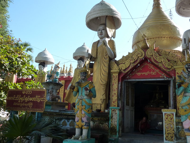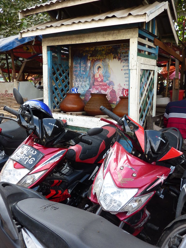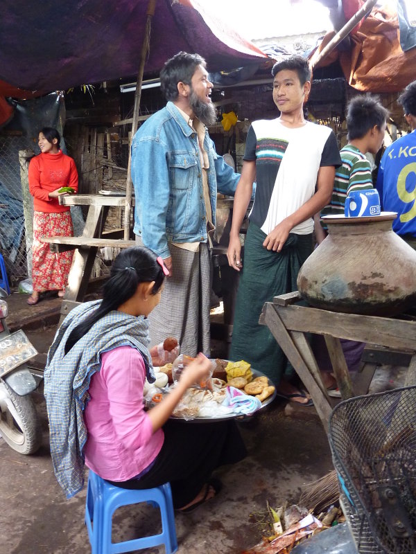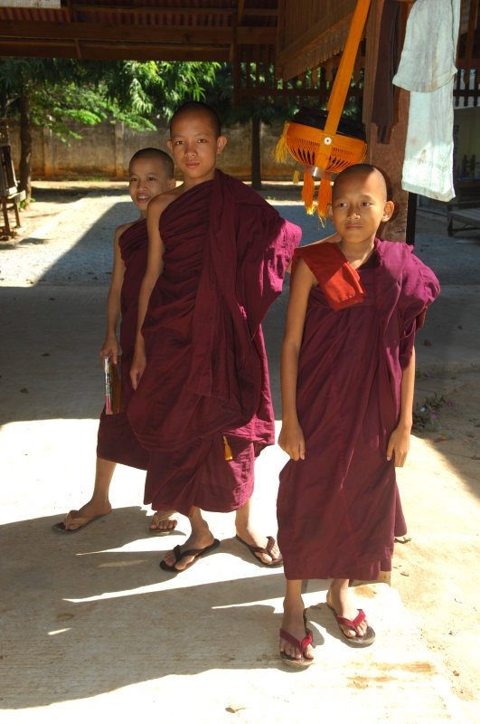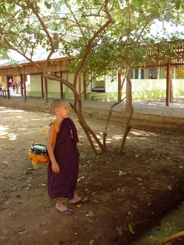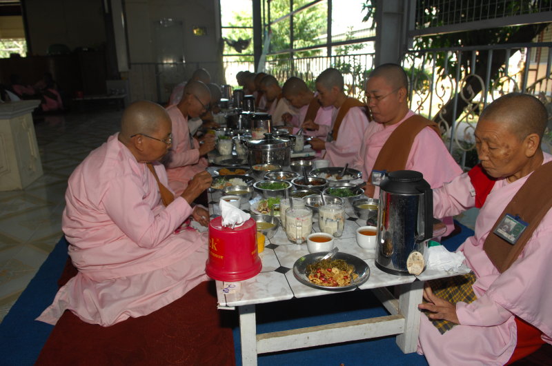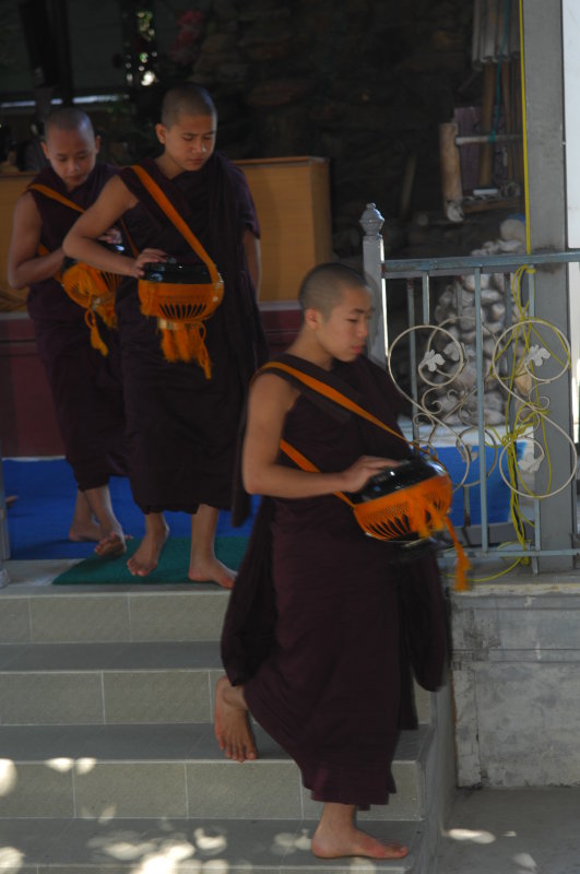 Lange können wir uns auf dem Markt nicht aufhalten. So So drängt zum Aufbruch, weil wir eine Verabredung zum Essen mit Mönchen haben. In das Kloster des Moe Hti Aung Si Meditation Centers verirren sich nur selten Touristen. Unser Guide kennt sich hier bestens aus. Er unterrichtet hier und war selbst eine Zeitlang als Mönch hier. Daher sein sehr gutes Englisch. Kaum sind wir angekommen, beginnt auch schon der Einzug der Mönche, die von ihrer morgendlichen Sammeltour zurück sind. Nach ihnen werden auch wir zu unseren Plätzen geführt – mitten im Saal zwischen den männlichen und weiblichen Bewohnern des Klosters. Zu Essen gibt es typisch burmesische Gerichte: sieben bis acht Schälchen mit Gemüse, Fisch und Fleisch und Soßen, aus denen man sich sein Menü selbst zusammenstellen kann. Nach dem Essen besichtigen wir den Mediationssaal und die Schule. Auch heute noch liegt ein Großteil der Ausbildung der Menschen hier in den Händen der Klöster. Wir spenden zwei Duzend Schulhefte und Stifte für So So‘s Klasse.