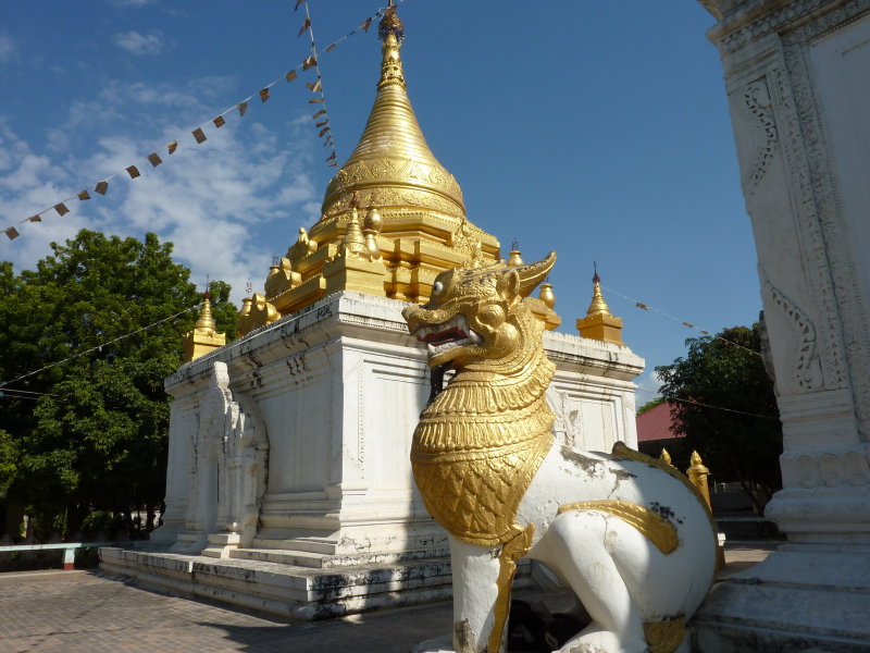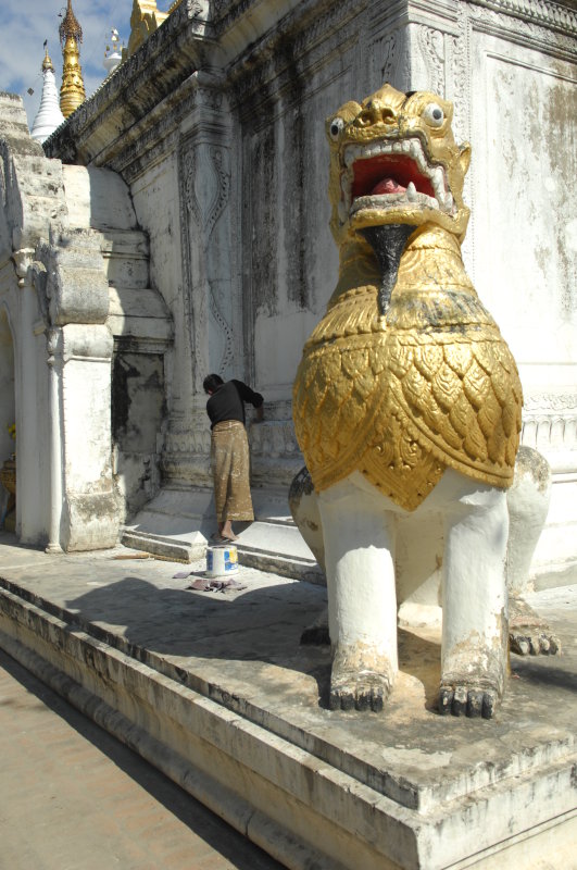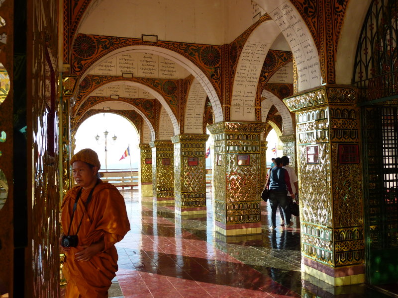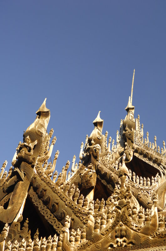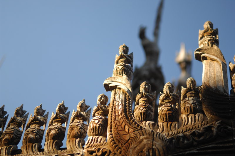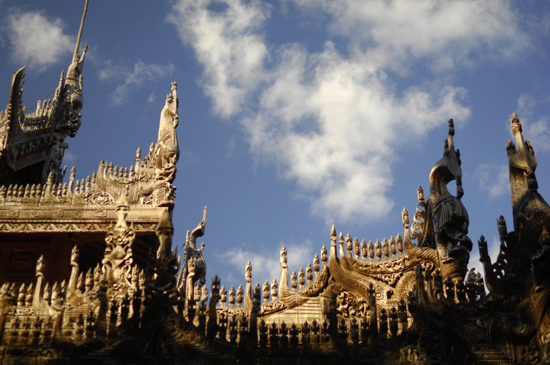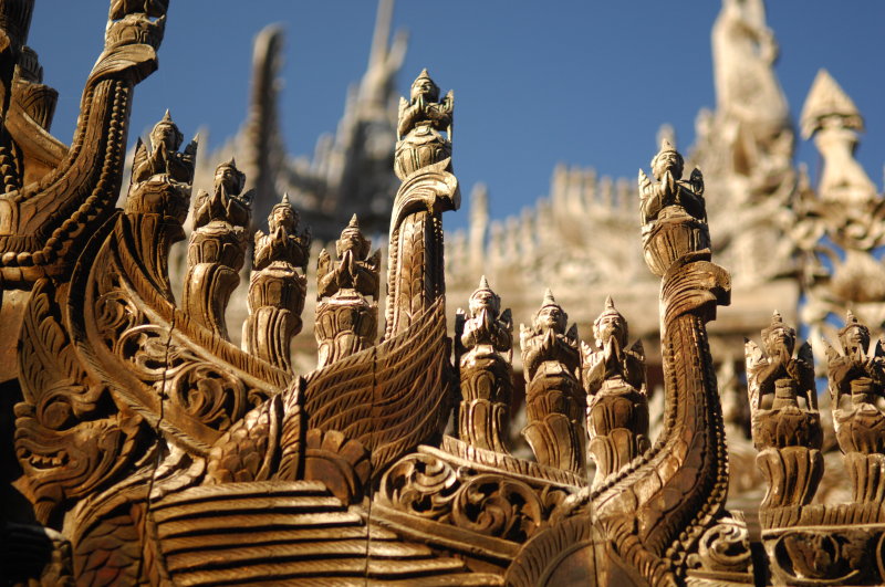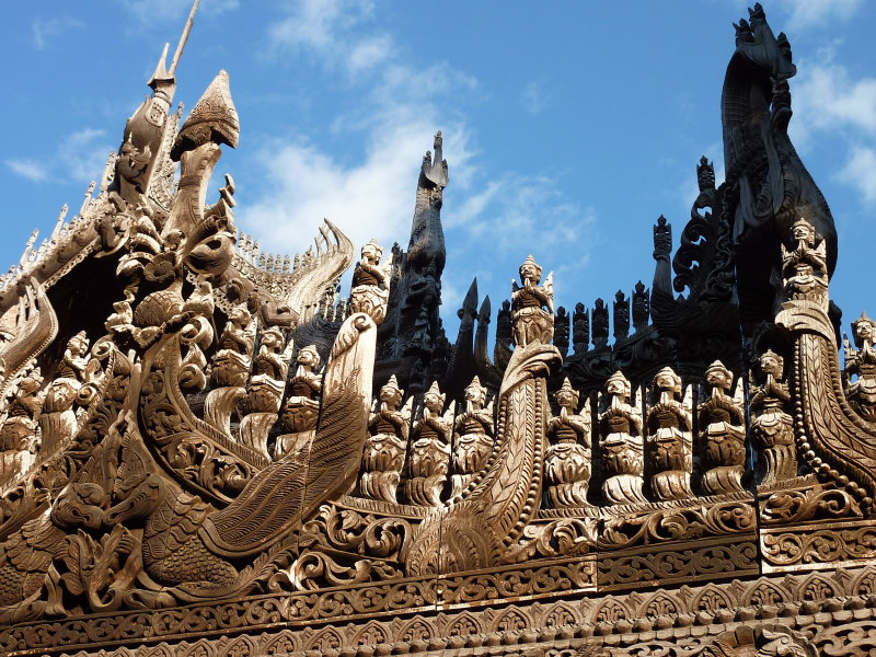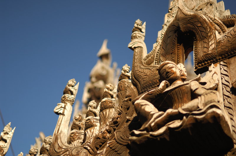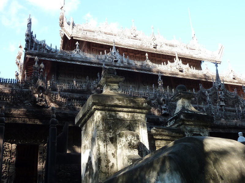 Den Abschluss der Tagestour bilden zwei unserer Lieblingsplätze in Mandalay: das Teakholzkloster Shwe Nan Daw Kyaung ist auch als Golden Palace Monastery bekannt, da es früher vollständig vergoldet war. Davon ist außen nichts mehr außer ein paar wenigen Spuren zu sehen. Im Inneren hat sich dagegen mehr erhalten. Die üppig mit individuell geschnitzten Figuren gestalteten Außenwände sind zum Teil stark verwittert, die Wände rissig. An einigen Stellen scheint man aber mit der Restaurierung begonnen zu haben.